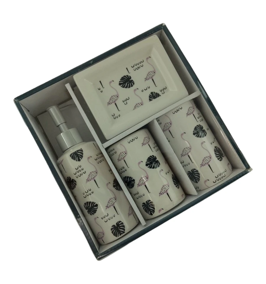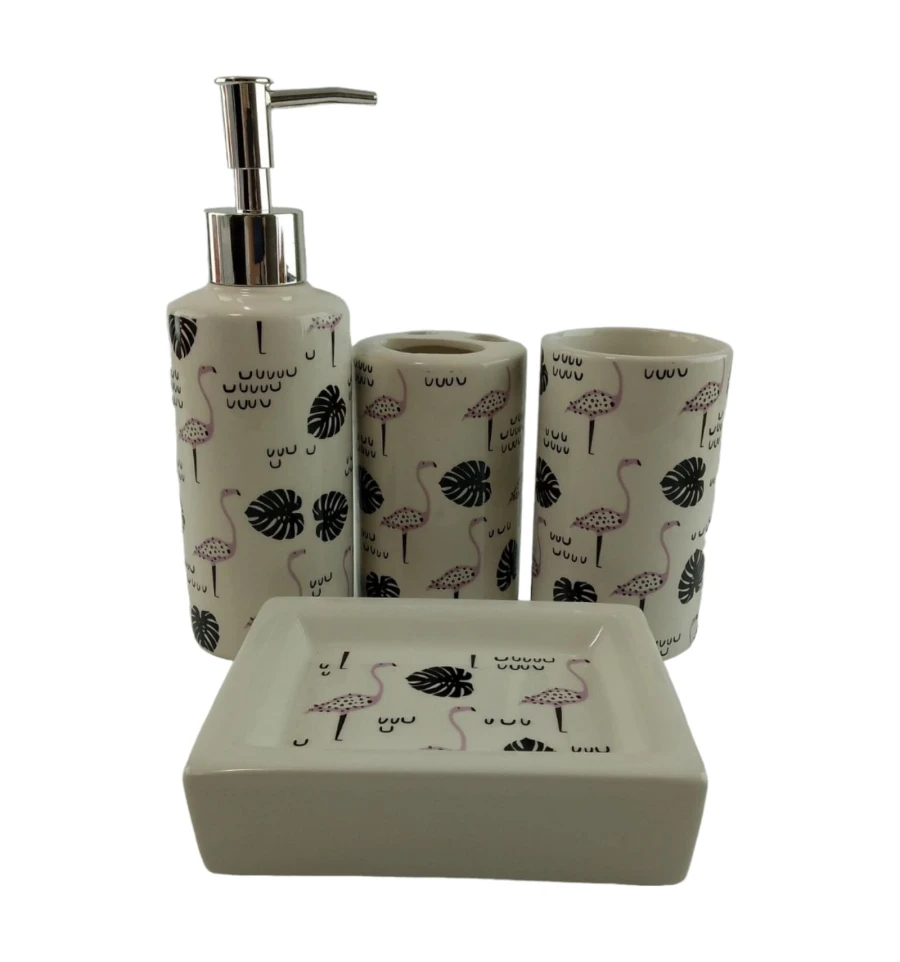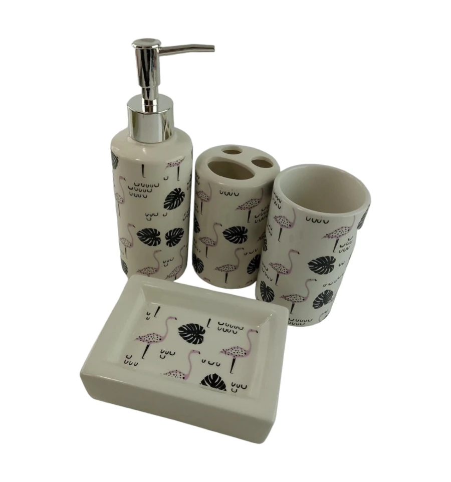С очаровательным набором аксессуаров для ванной все предметы будут на своих местах. В керамический набор входит-дозатор для жидкого мыла, стакан ,органайзер для зубных щеток, мыльница.