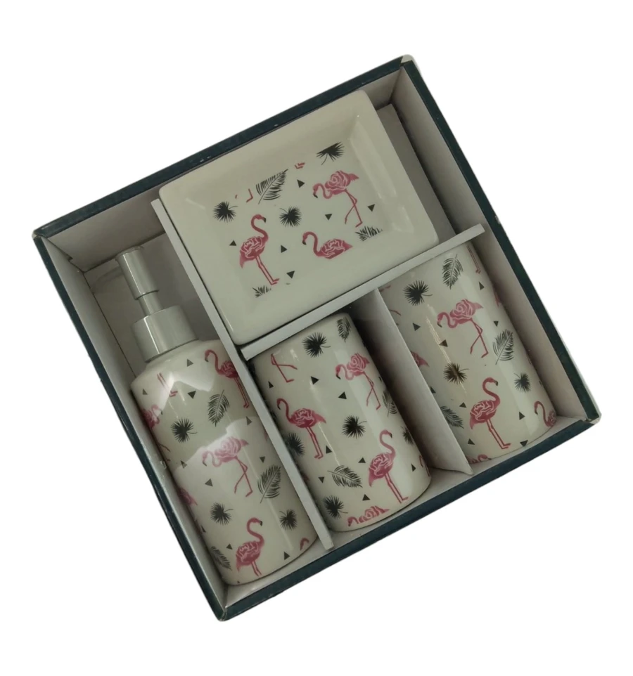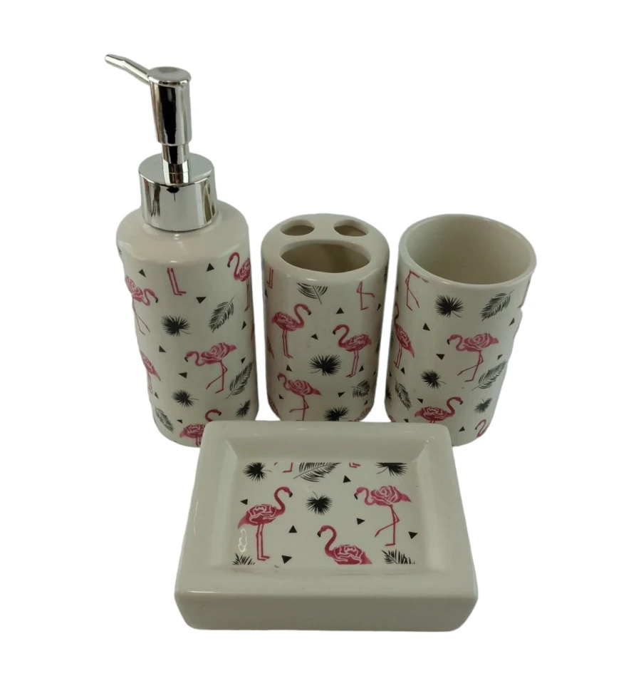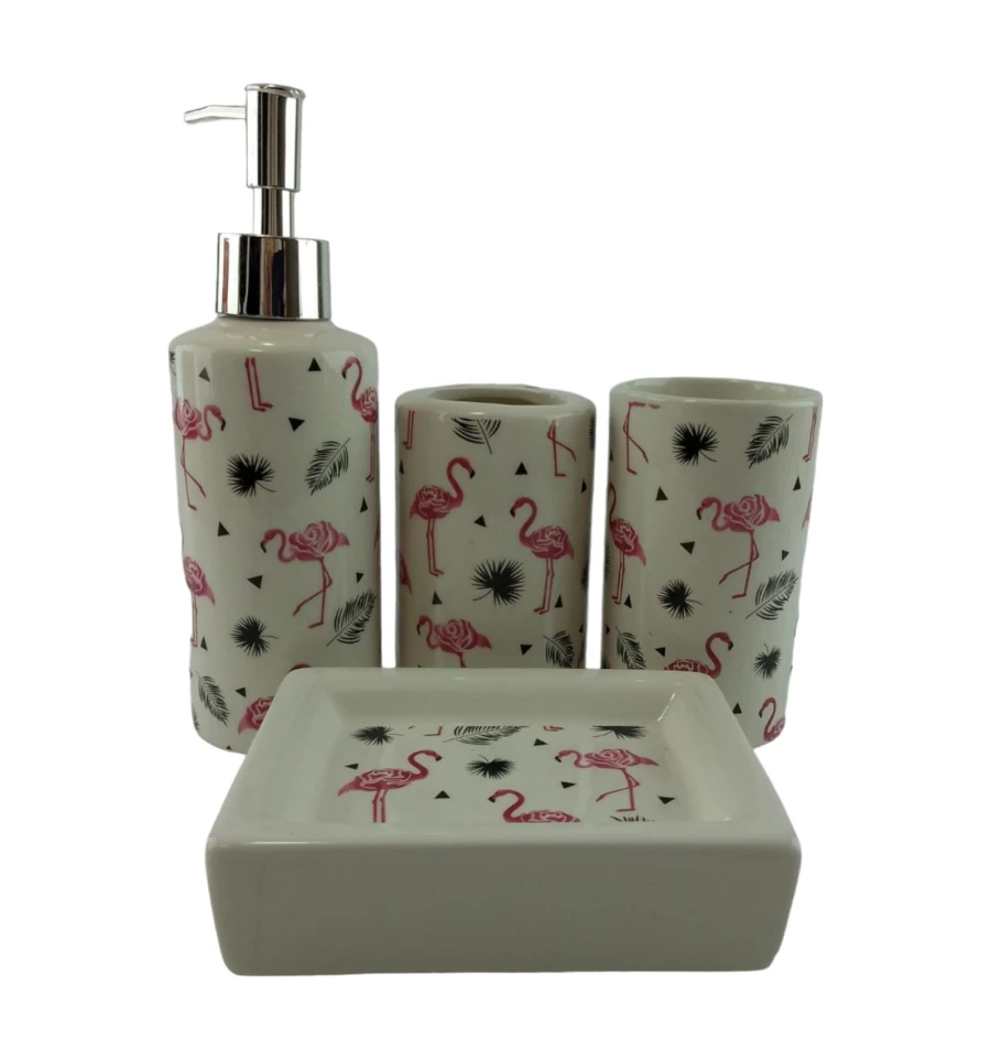 С очаровательным набором аксессуаров для ванной все предметы будут на своих местах. В керамический набор входит-дозатор для жидкого мыла, стакан ,органайзер для зубных щеток, мыльница.
