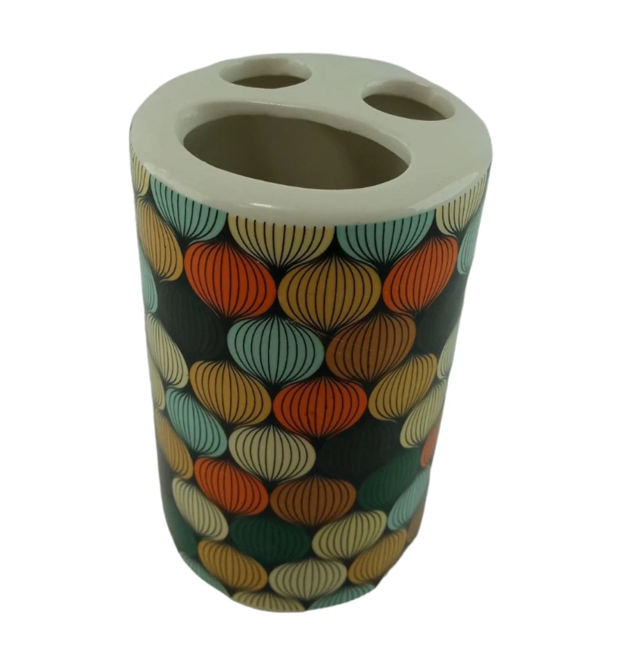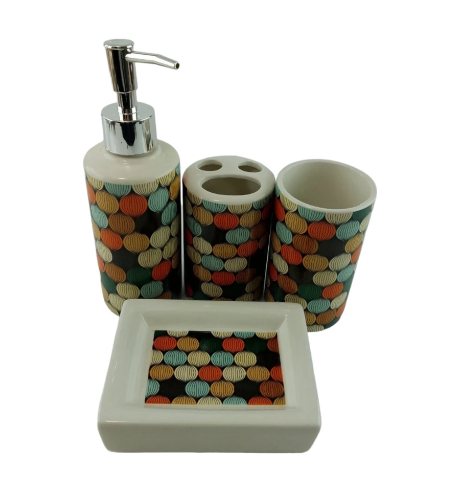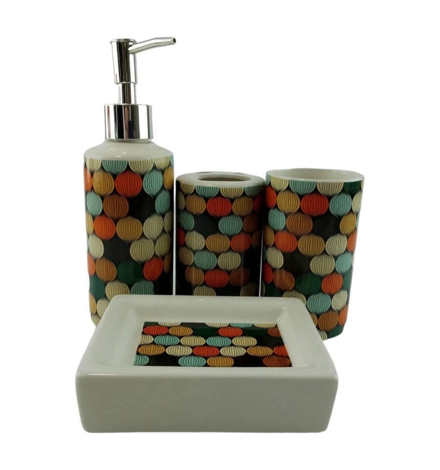 С очаровательным набором аксессуаров для ванной все предметы будут на своих местах. В керамический набор входит-дозатор для жидкого мыла, стакан ,органайзер для зубных щеток, мыльница.