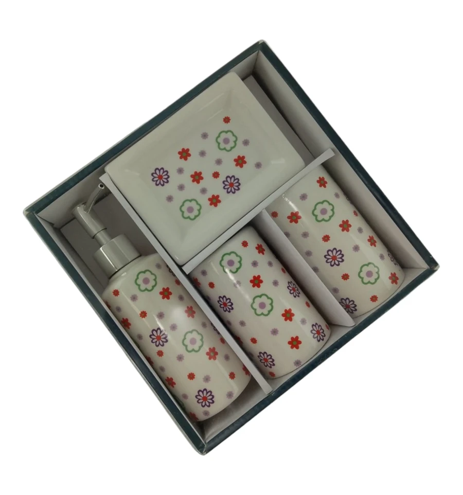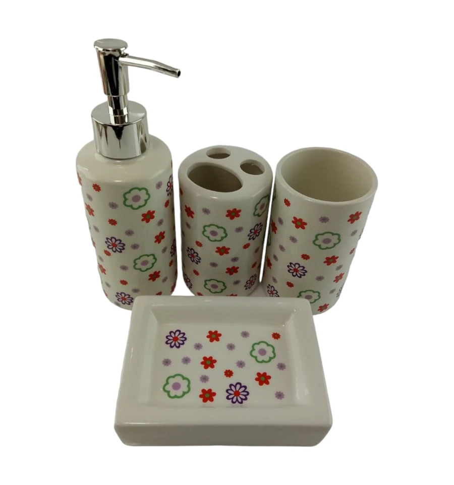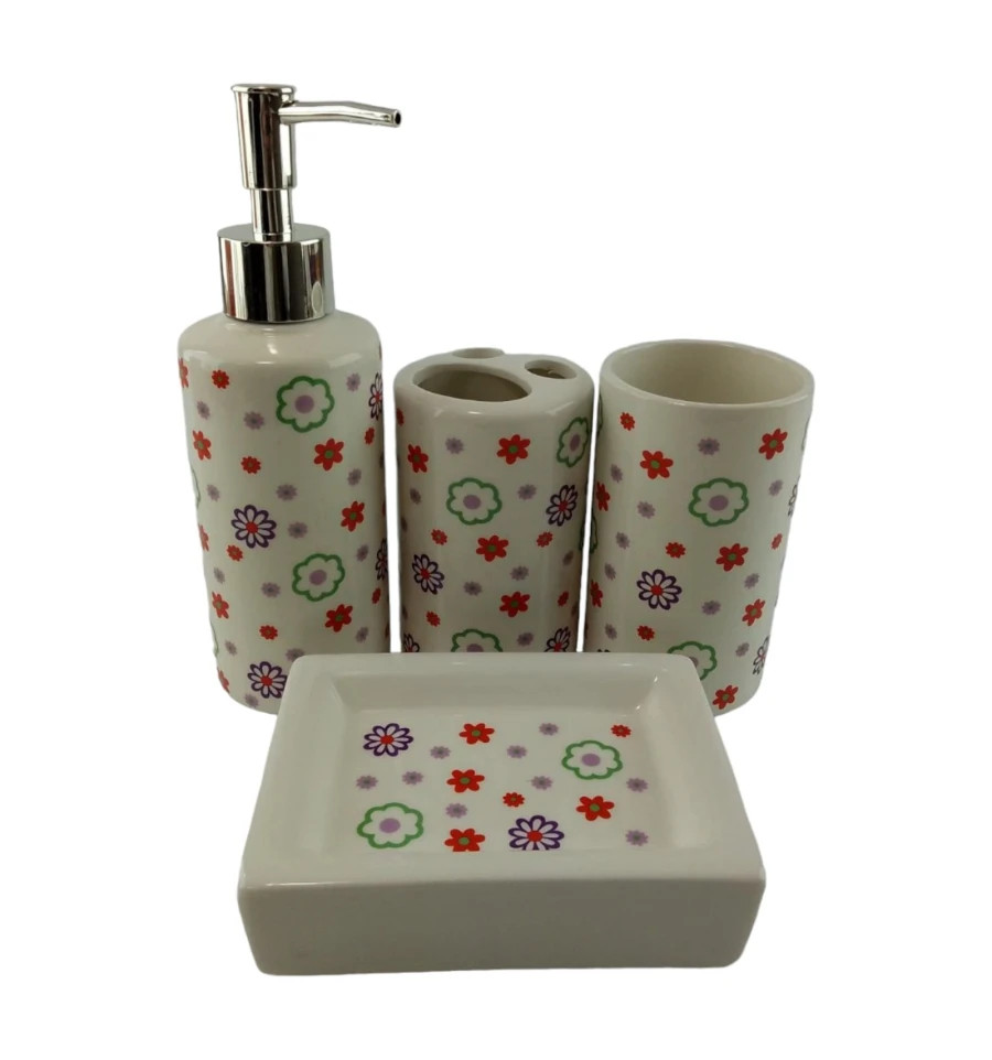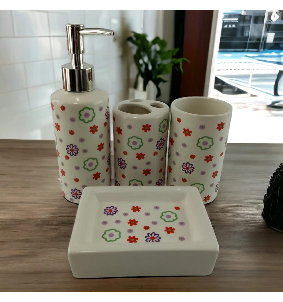 С очаровательным набором аксессуаров для ванной все предметы будут на своих местах. В керамический набор входит-дозатор для жидкого мыла, стакан ,органайзер для зубных щеток, мыльница.
