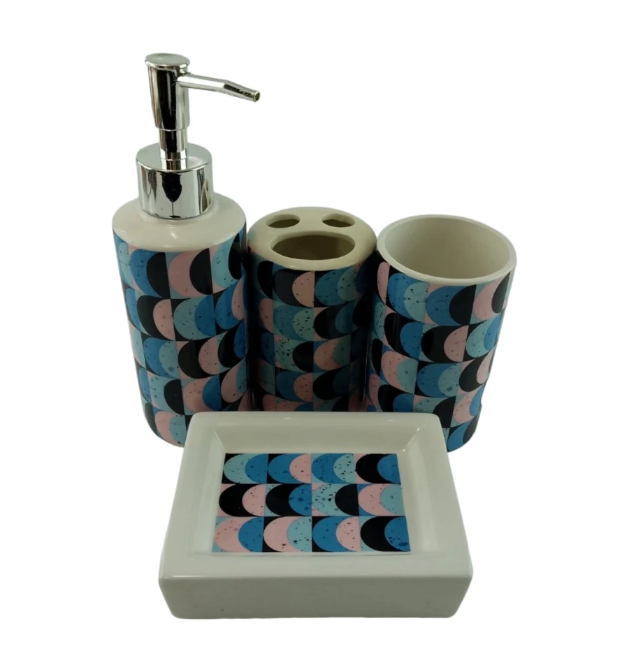 С очаровательным набором аксессуаров для ванной все предметы будут на своих местах. В керамический набор входит-дозатор для жидкого мыла, стакан ,органайзер для зубных щеток, мыльница.