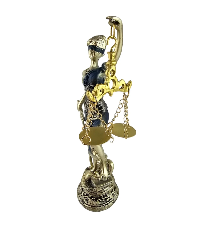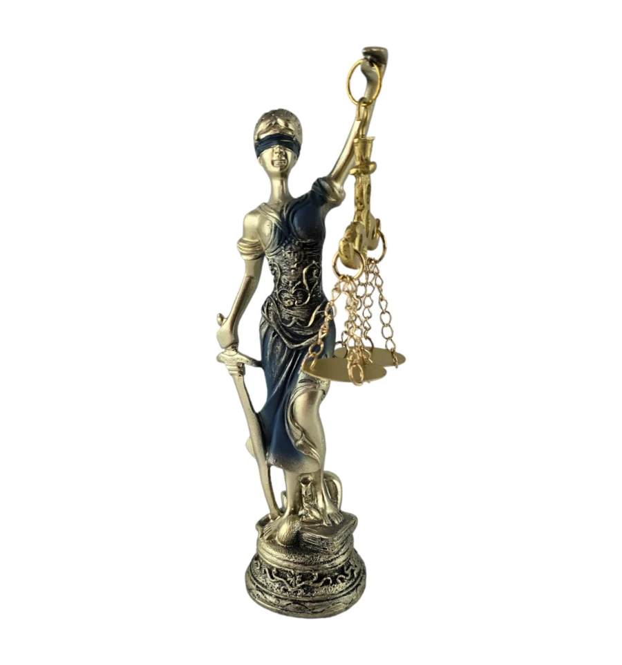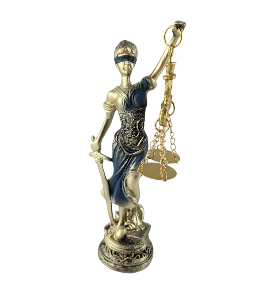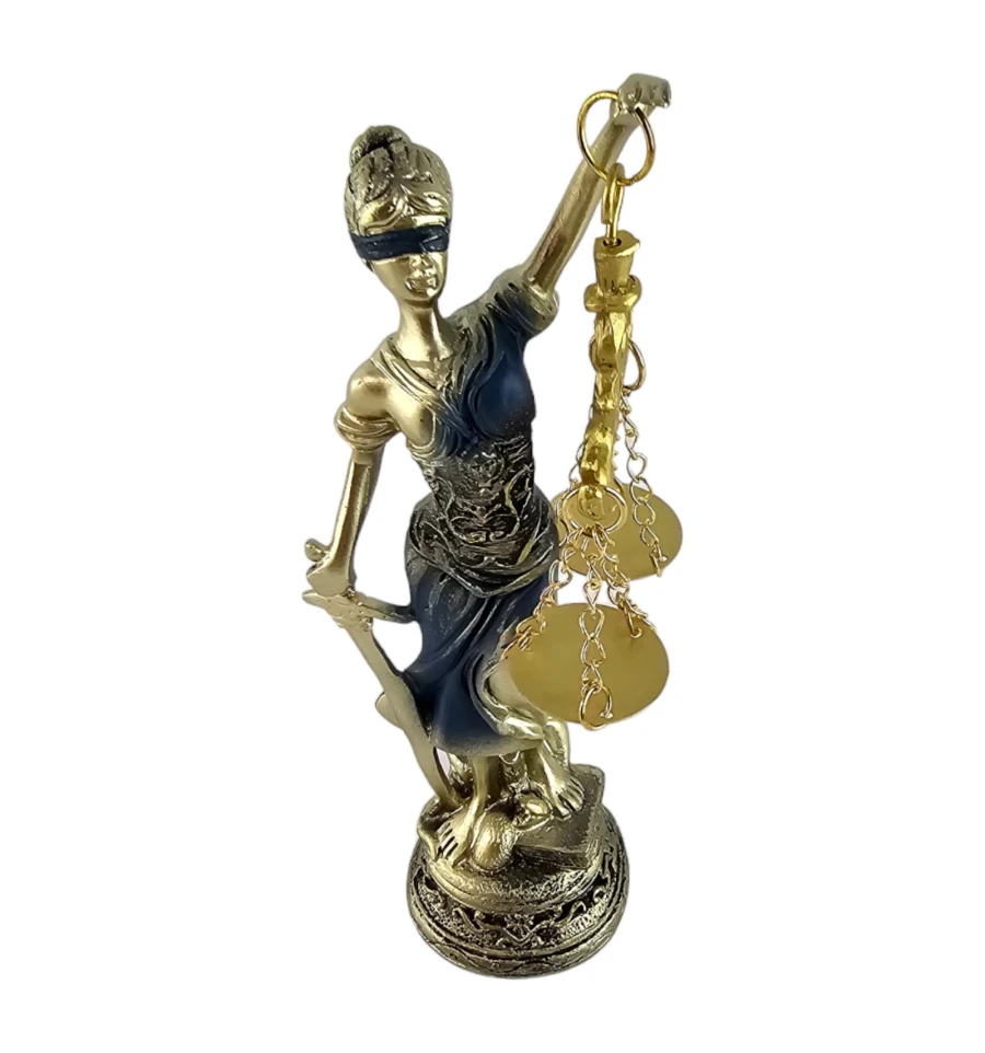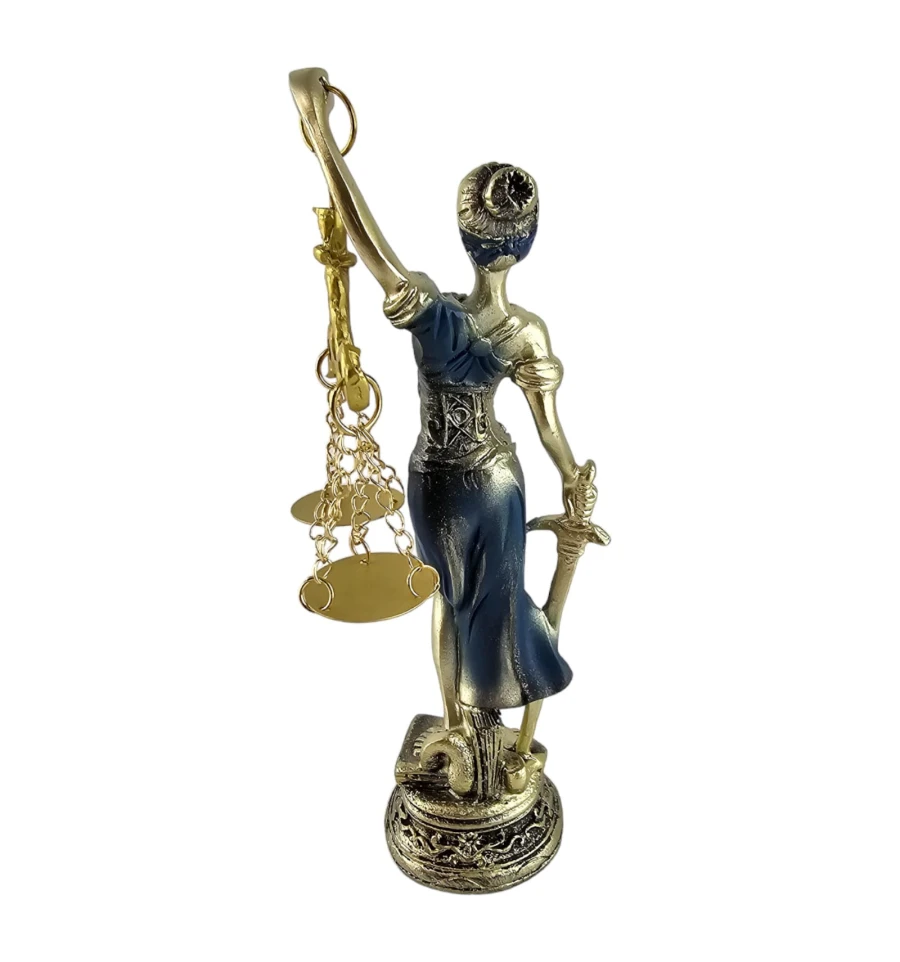 Представляем вашему вниманию статуэтку Фемиды - символа правосудия и баланса, которая изготовлена из полимера серебристого цвета с голубым оттенком на платье и на повязке на глазах. Эта замечательная скульптура поражает своей изысканностью и мастерством изготовления.