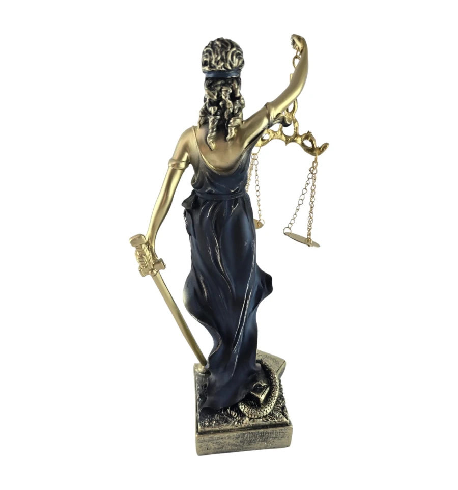 Статуэтка стоит на книге, символизируя знание и мудрость.Фемида, стоящая на голове змеи, символизирует победу правосудия над злом или хаосом. Этот образ обычно ассоциируется с идеей справедливости, контролирующей и подавляющей зло.