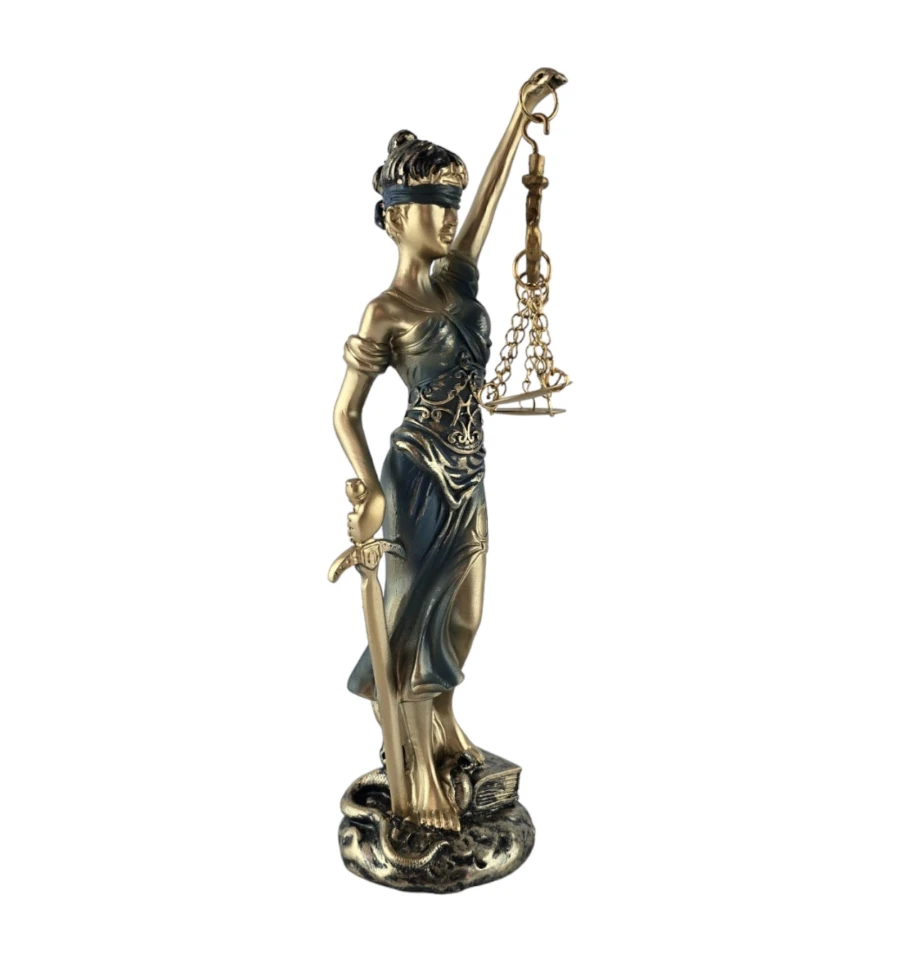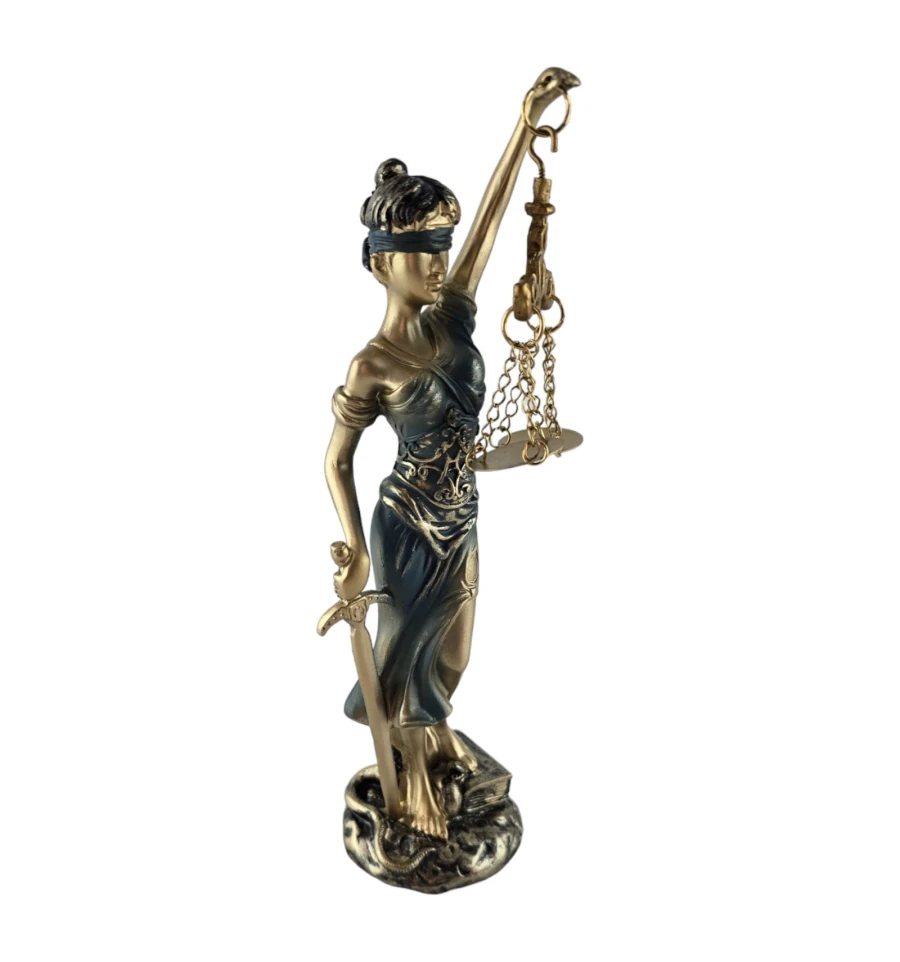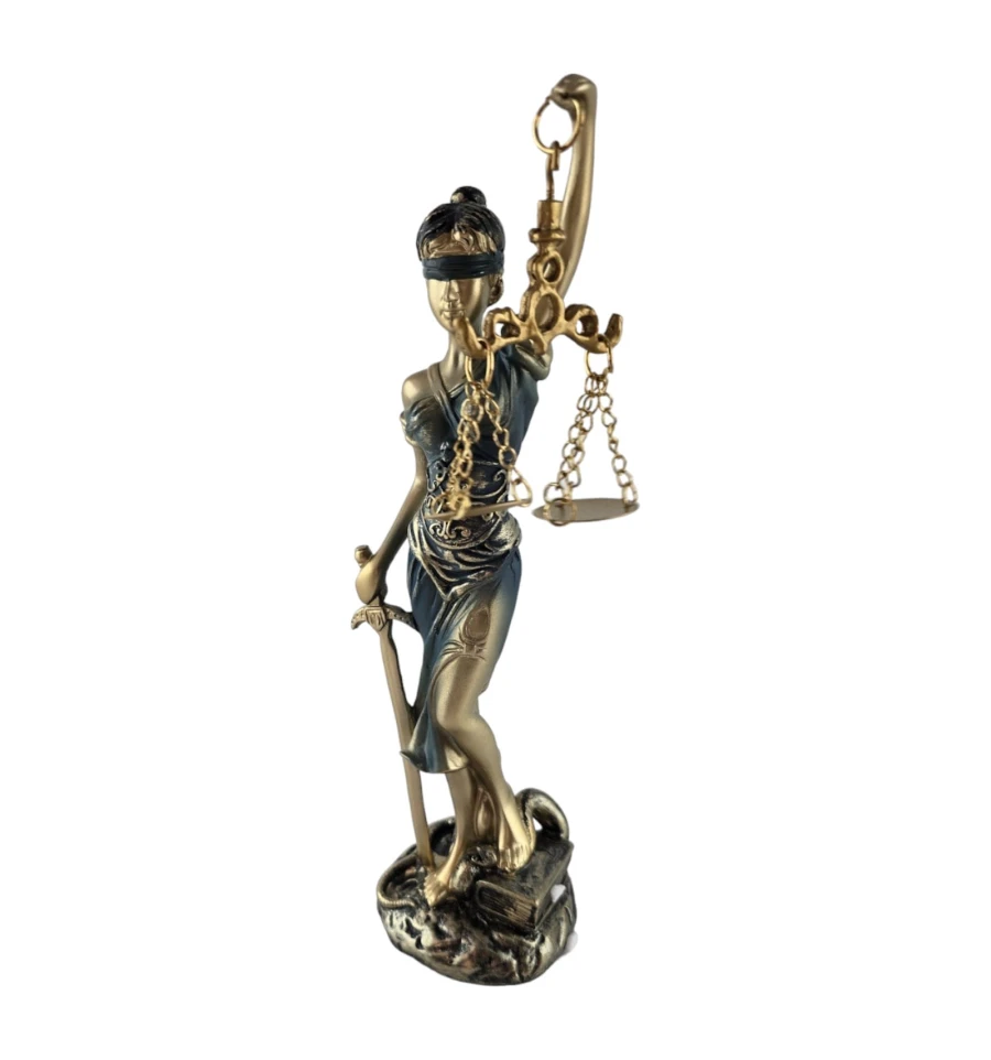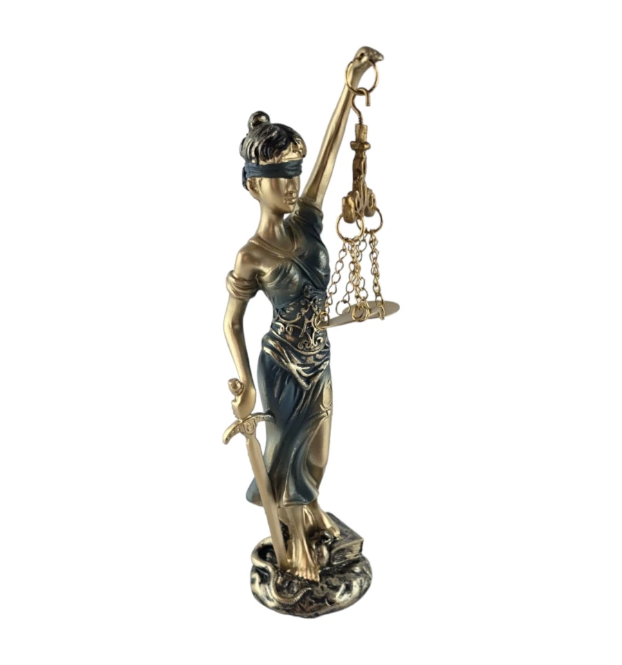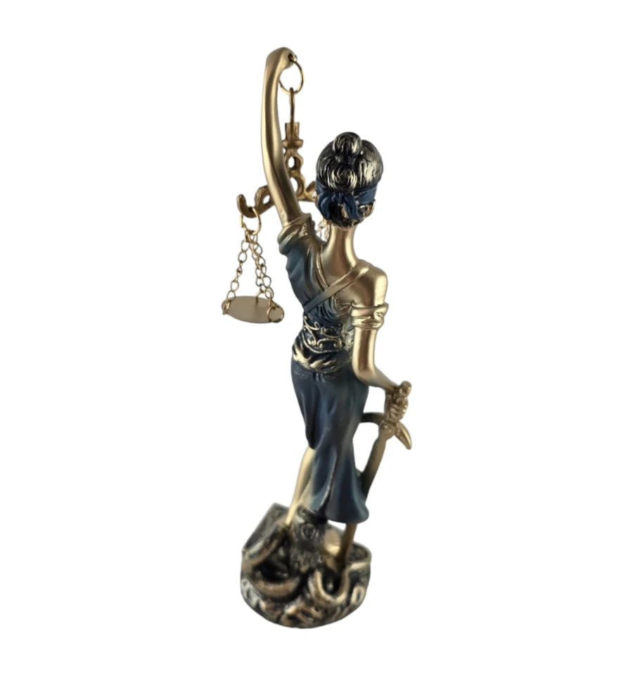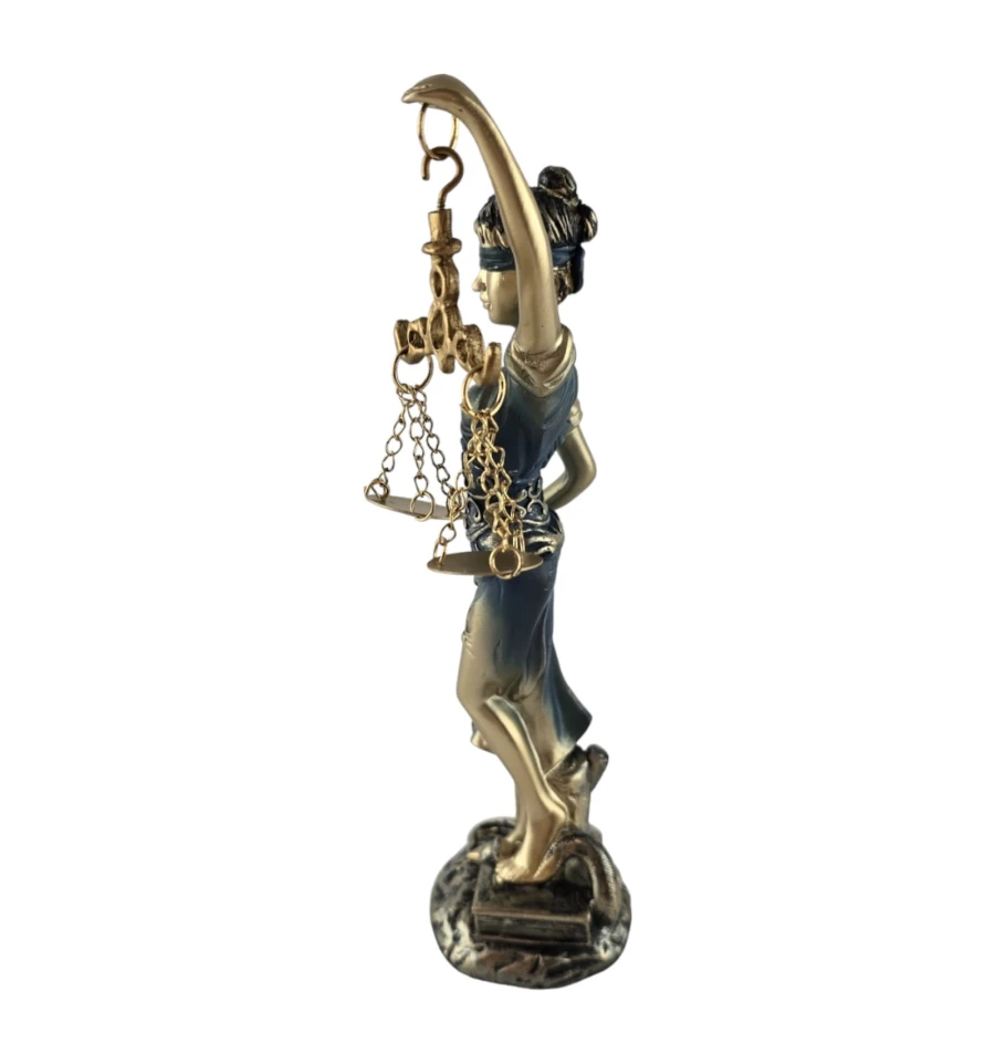Представляем вашему вниманию статуэтку Фемиды - символа правосудия и баланса, которая изготовлена из полимера серебристого цвета с голубым оттенком на платье и на повязке на глазах. Эта замечательная скульптура поражает своей изысканностью и мастерством изготовления.