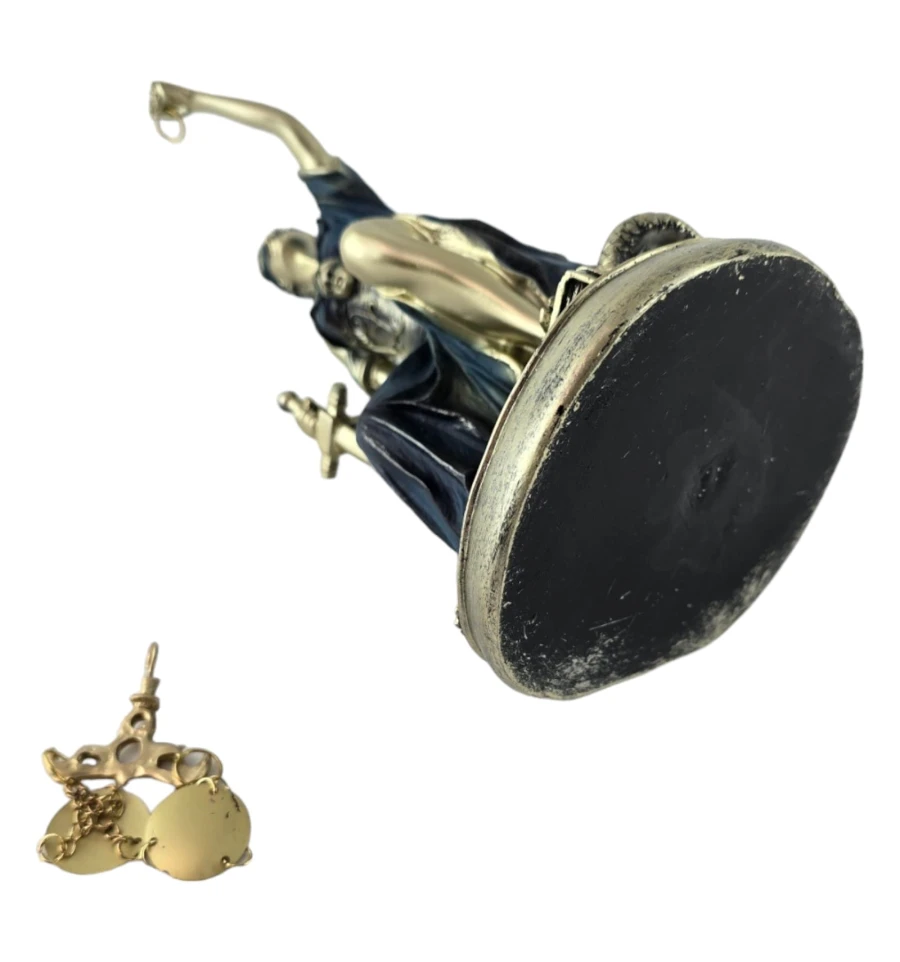 Статуэтка выполнена в бронзовом цвете, что добавляет ей античного очарования, а бирюзовое платье и повязка на глазах придают ей изысканности и элегантности.