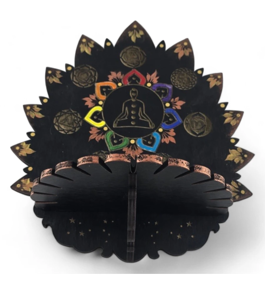 Полка " 7 Чакр" - это не только функциональное приспособление, но и произведение искусства, которое призвано внести в ваш дом вдохновение и энергию. Ее черный цвет и ручная роспись с изображением чакр придают вашему интерьеру загадочность и стиль. Два крепких петли на задней стороне обеспечивают прочное крепление к стене. Полочка выполнена в виде лотоса, что гармонично украсит любой интерьер.