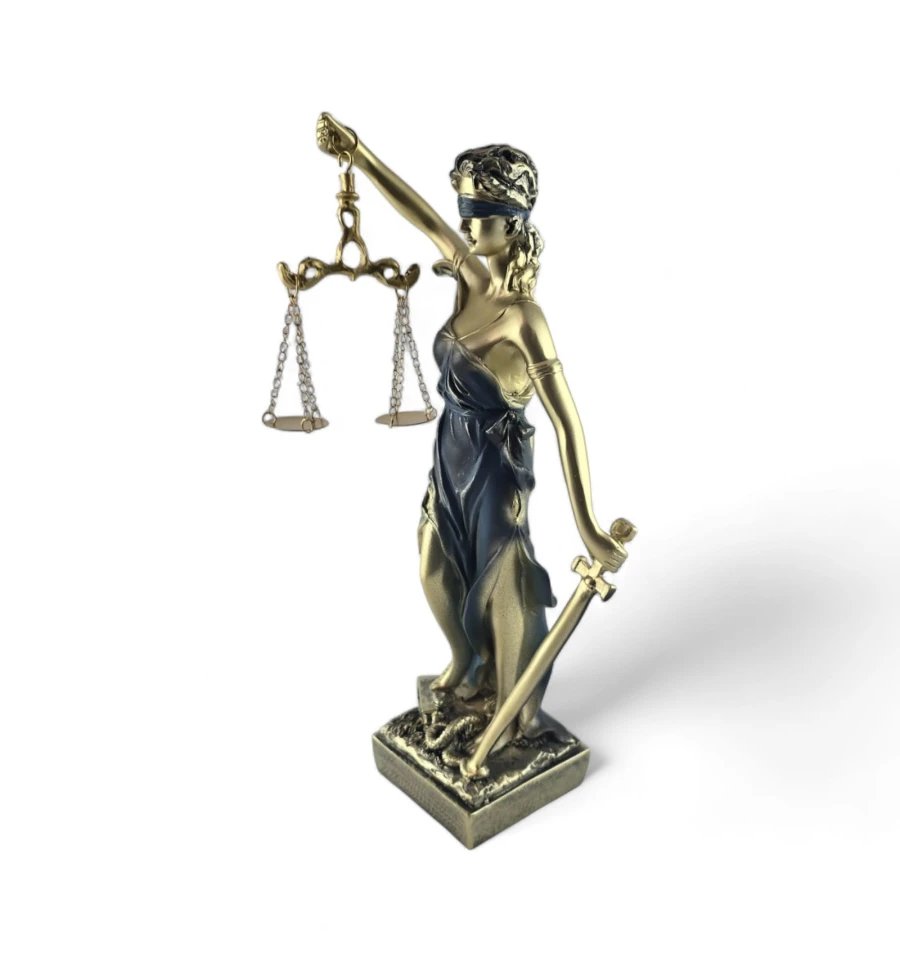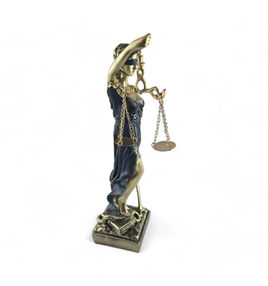Представляем вашему вниманию статуэтку Фемиды - символа правосудия и баланса, которая изготовлена из полимера бронзового цвета в голубом платье и с повязкой на глазах. Эта замечательная скульптура поражает своей изысканностью и мастерством изготовления.