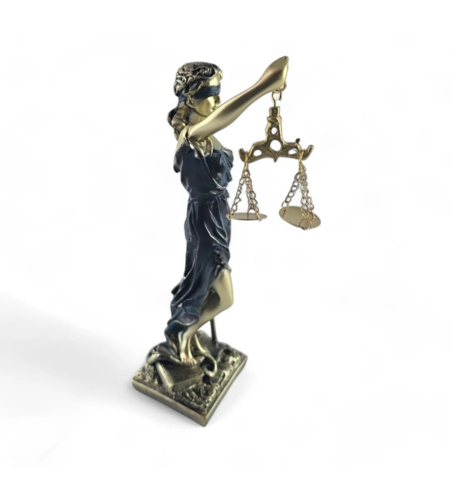 Представляем вашему вниманию статуэтку Фемиды - символа правосудия и баланса, которая изготовлена из полимера бронзового цвета в голубом платье и с повязкой на глазах. Эта замечательная скульптура поражает своей изысканностью и мастерством изготовления.
