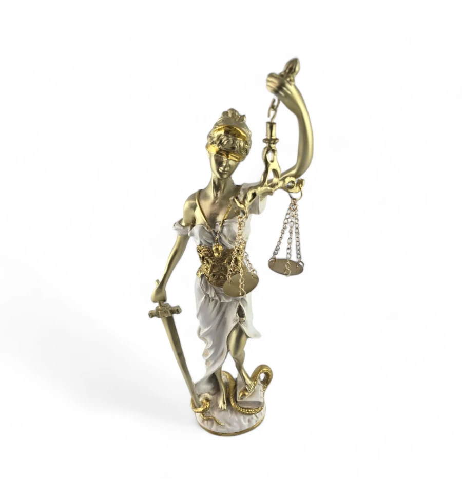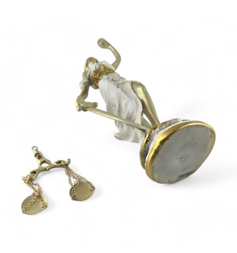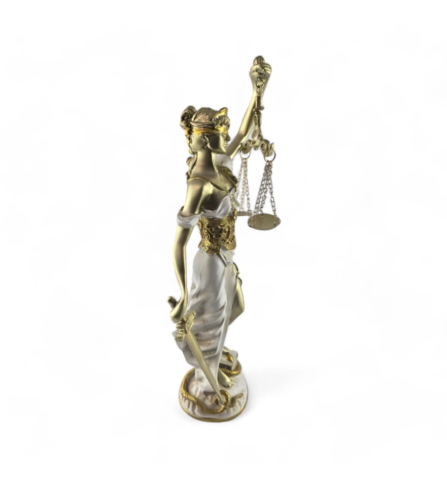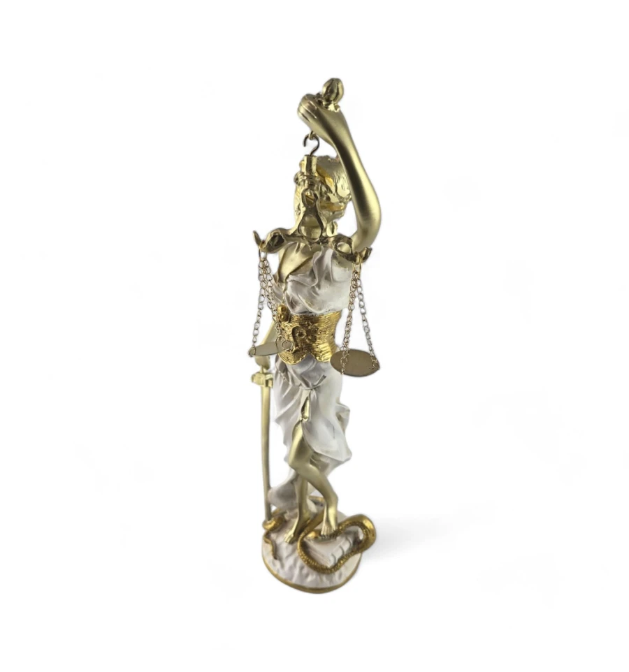 Представляем вашему вниманию статуэтку Фемиды - символа правосудия и баланса, которая изготовлена из полимера бронзового цвета в белом платье и с золотистой повязкой на глазах. Эта замечательная скульптура поражает своей изысканностью и мастерством изготовления.