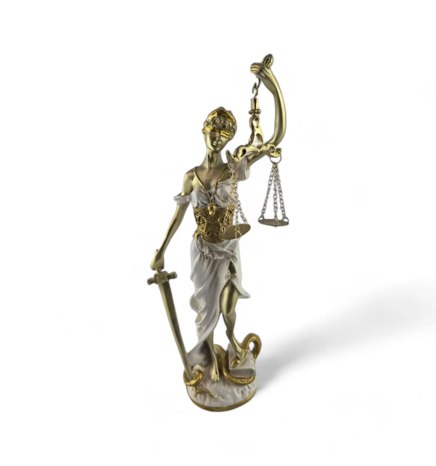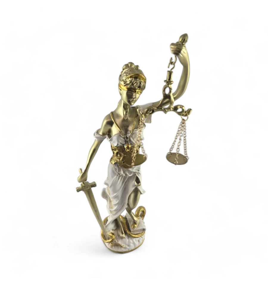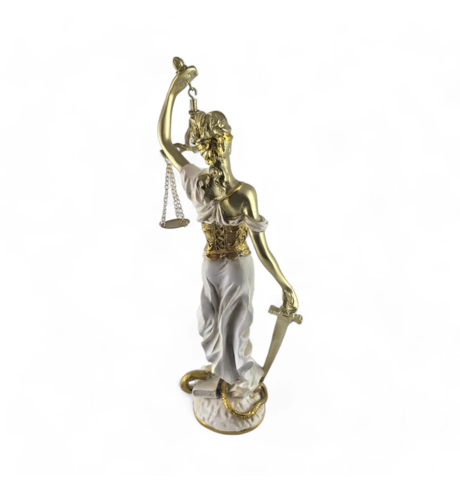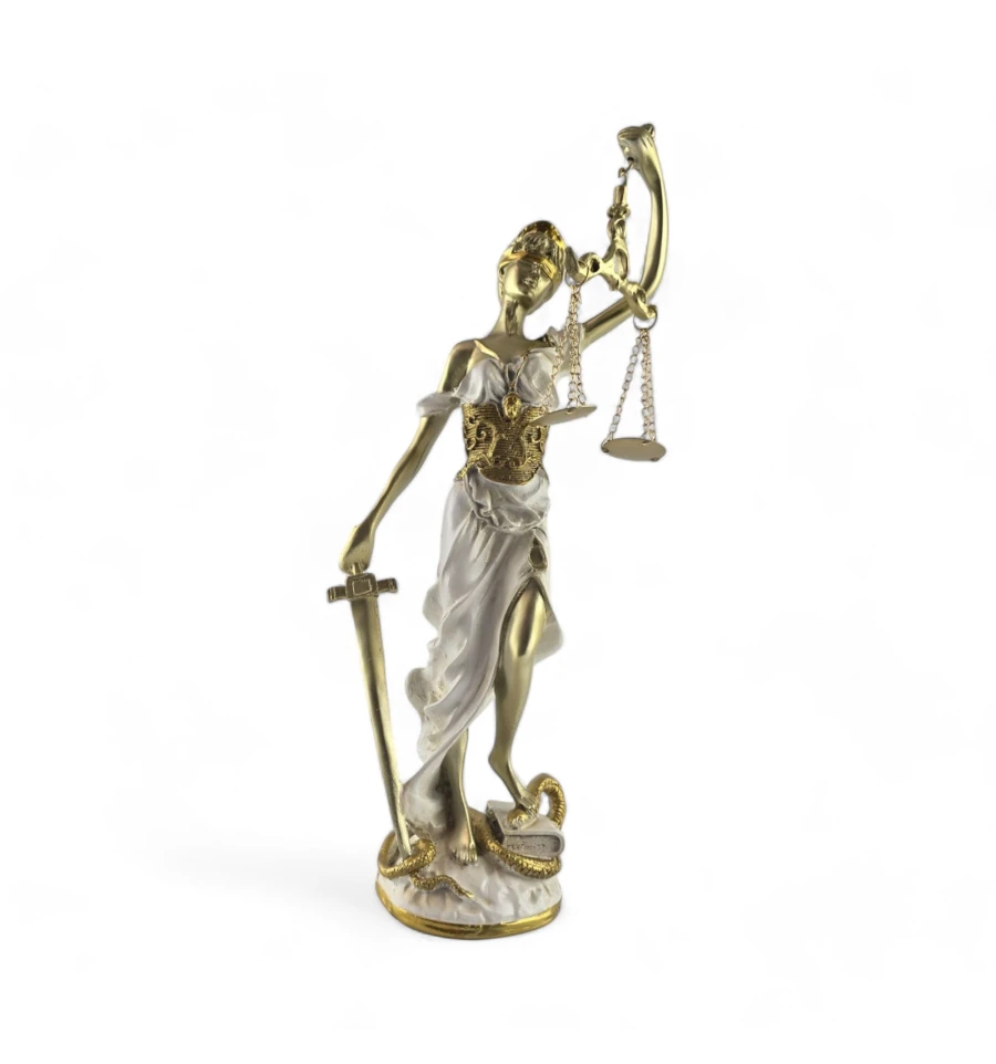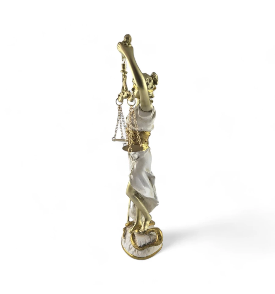 Представляем вашему вниманию статуэтку Фемиды - символа правосудия и баланса, которая изготовлена из полимера бронзового цвета в белом платье и с золотистой повязкой на глазах. Эта замечательная скульптура поражает своей изысканностью и мастерством изготовления.
