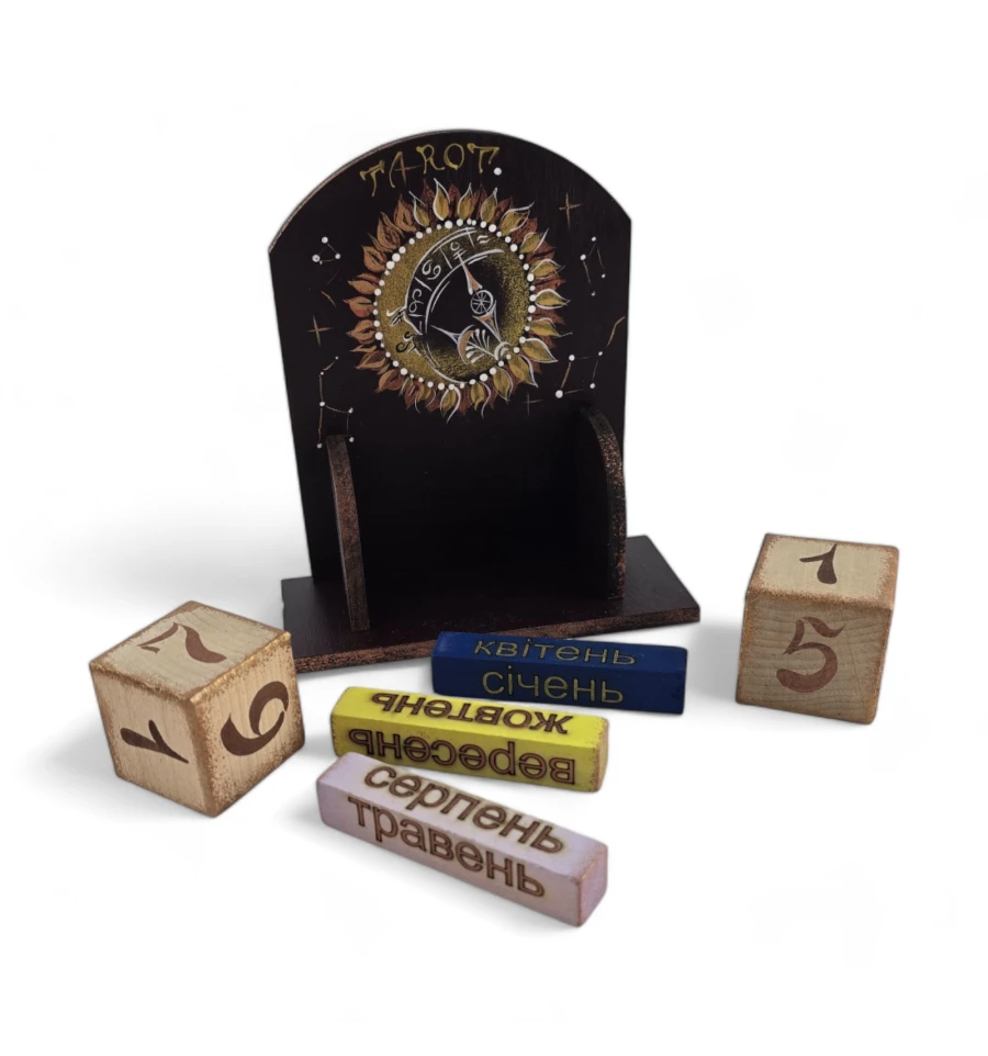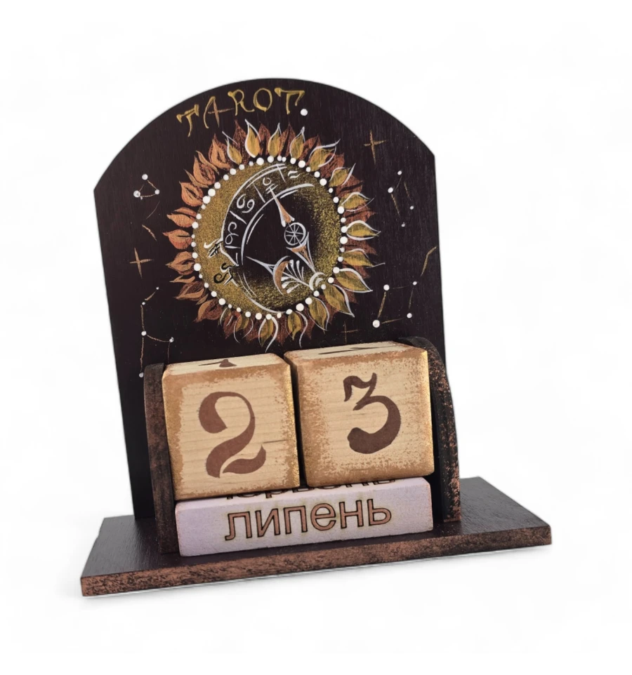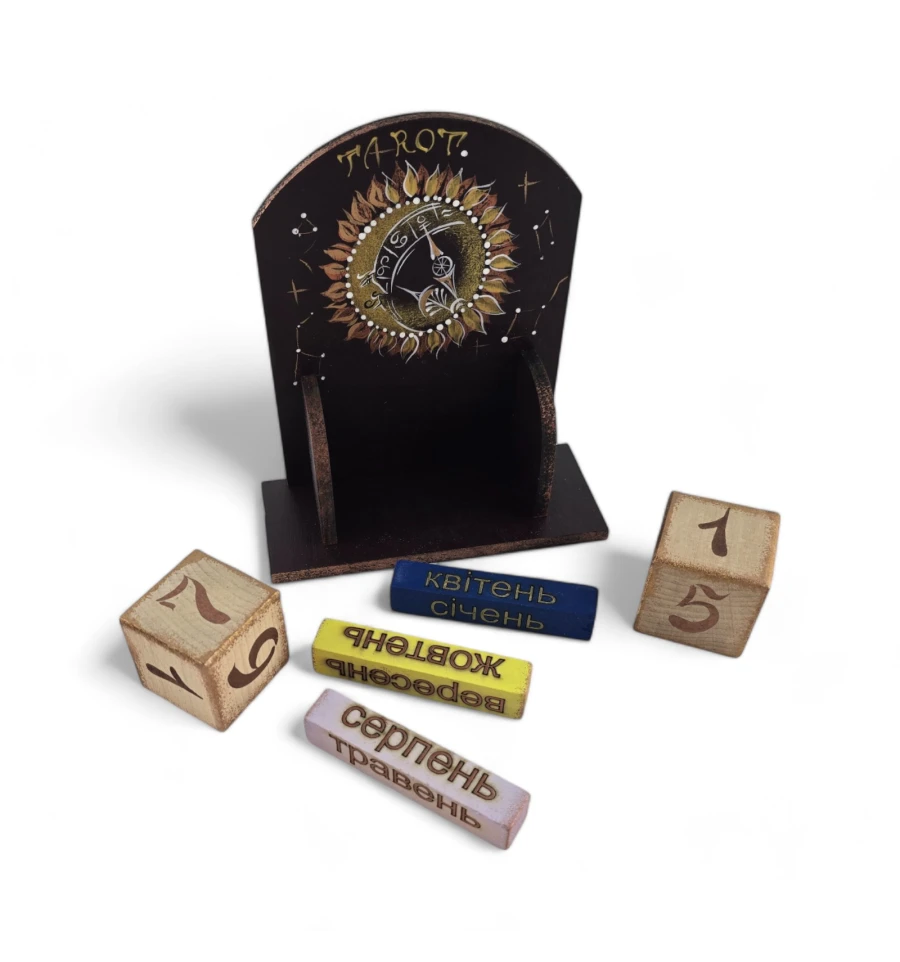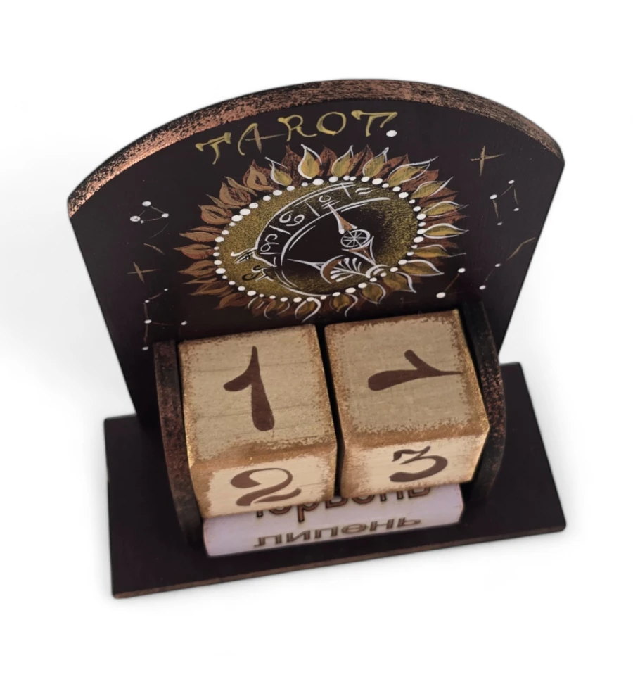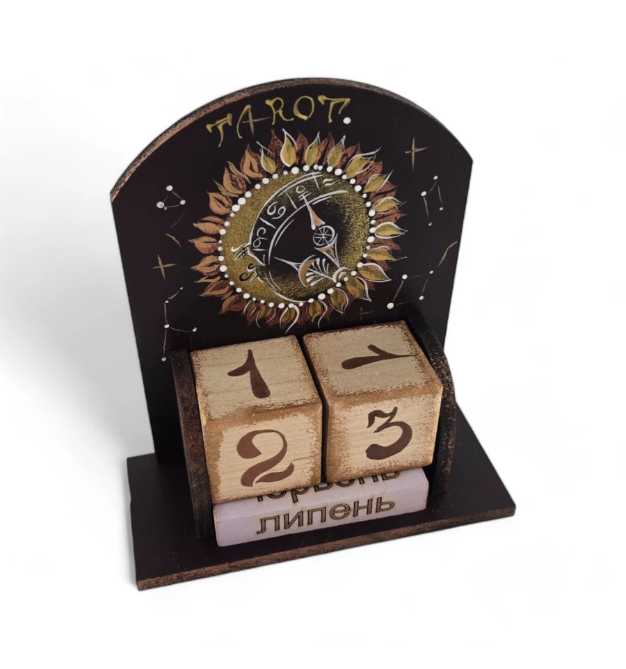 Этот уникальный вечный календарь изготовлен из прочного дерева и воплощает в себе магию времени и символику таро. Каждый кубик с числами месяца и названиями месяцев выполнен вручную с тщательным вниманием к деталям. На каждом кубике размещены узоры, вдохновленные таинственными образами таро, которые воплощают атмосферу загадочности и предвестия. Надпись "таро" украшает верхнюю часть календаря, подчеркивая его связь с мистическим миром таро.