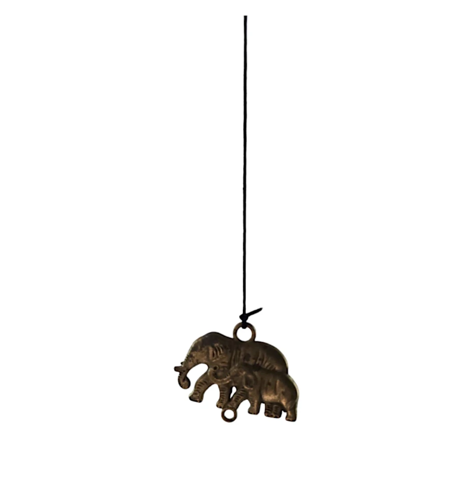 Начинается подвеска со слона. За ним следует купольная спираль, от которой идут три разветвления, каждое с золотистыми колокольчиками, создают магию звучания ветра. Каждый колокольчик — это отдельная нота в симфонии природы. В центре композиции — деревянная бусина, добавляющая тепла и естественности.