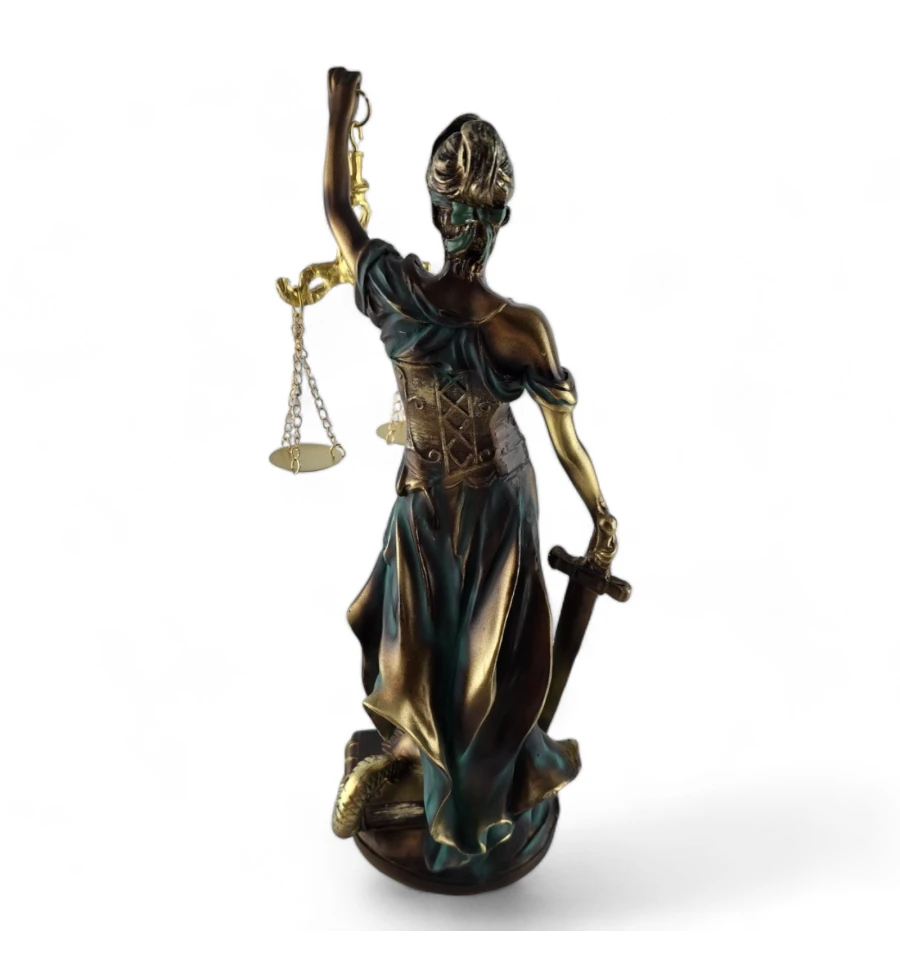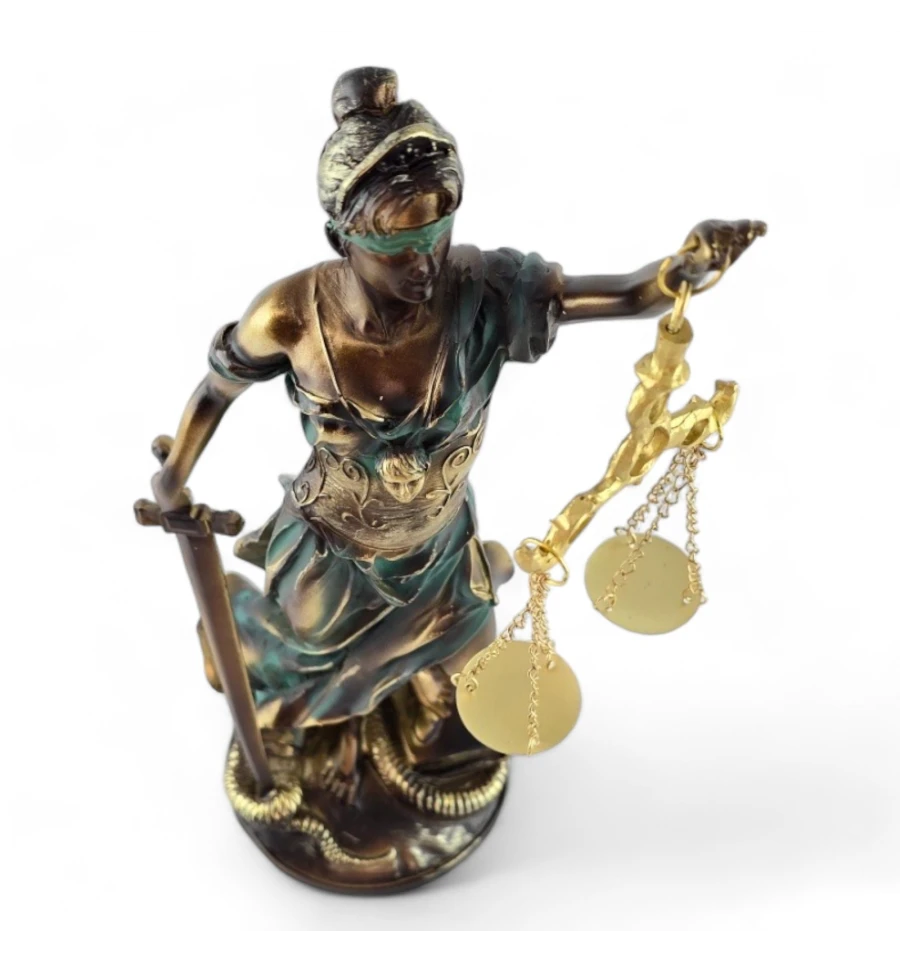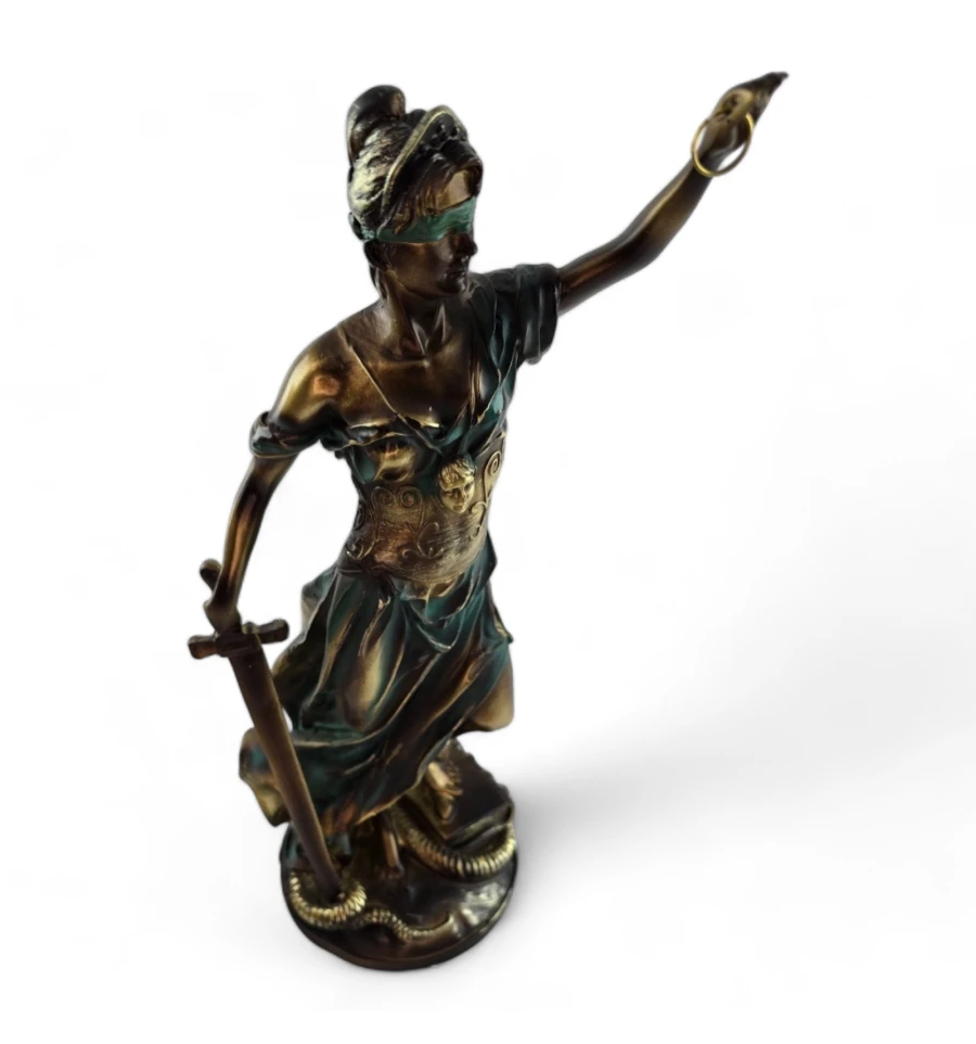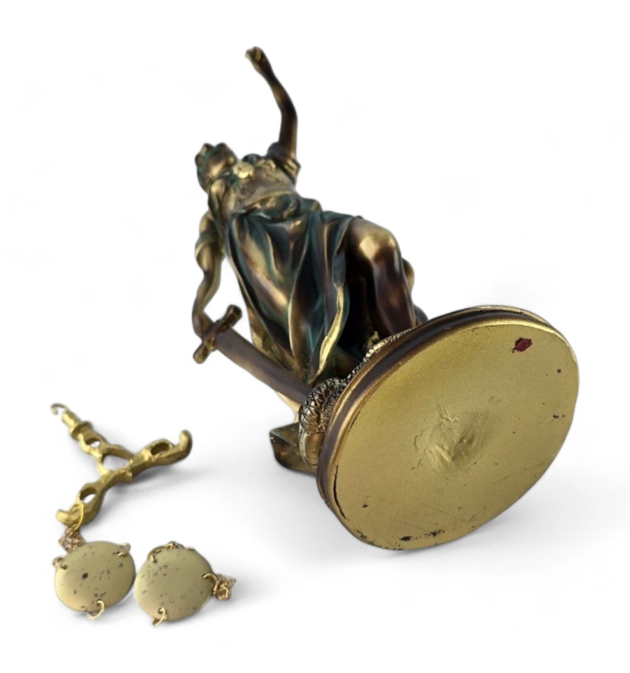 Представляем вашему вниманию статуэтку Фемиды - символа правосудия и баланса, которая изготовлена из полимера бронзового цвета в голубом платье и с повязкой на глазах. Эта замечательная скульптура поражает своей изысканностью и мастерством изготовления.