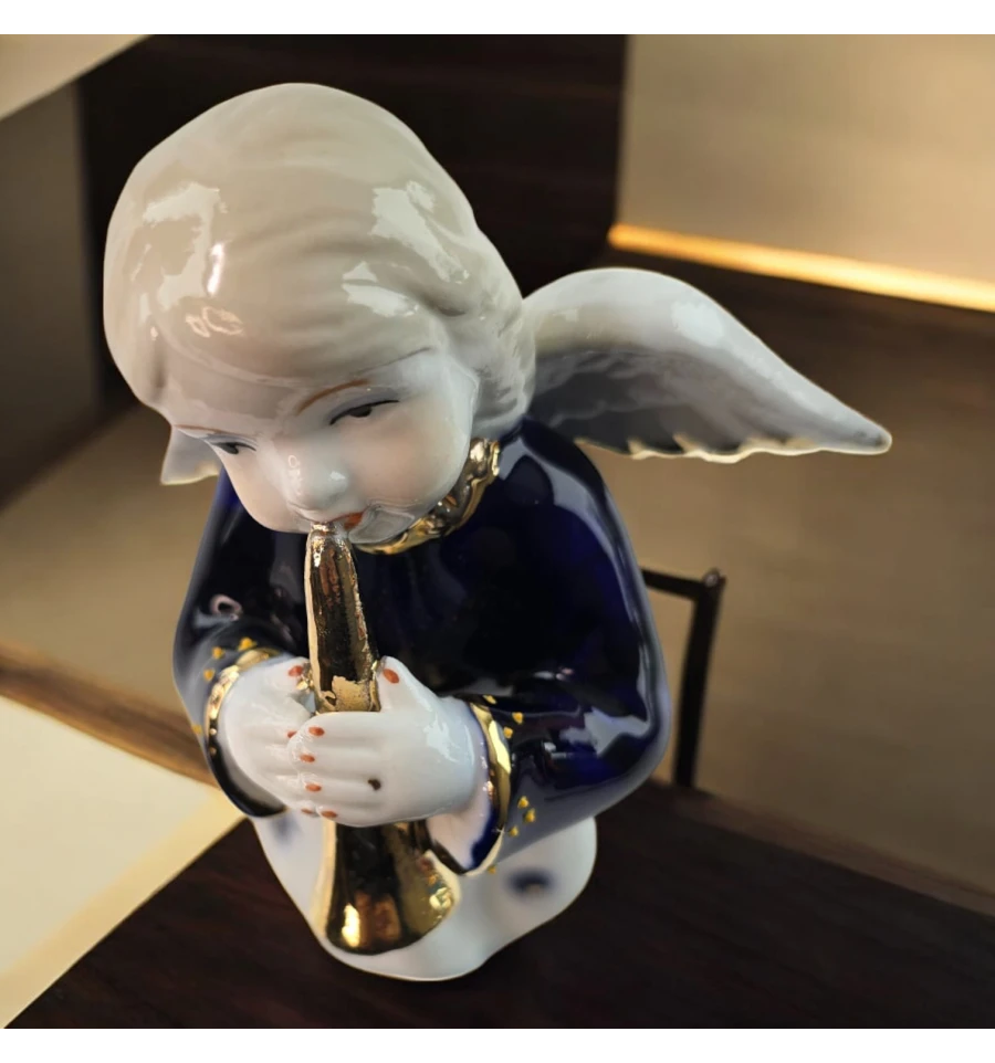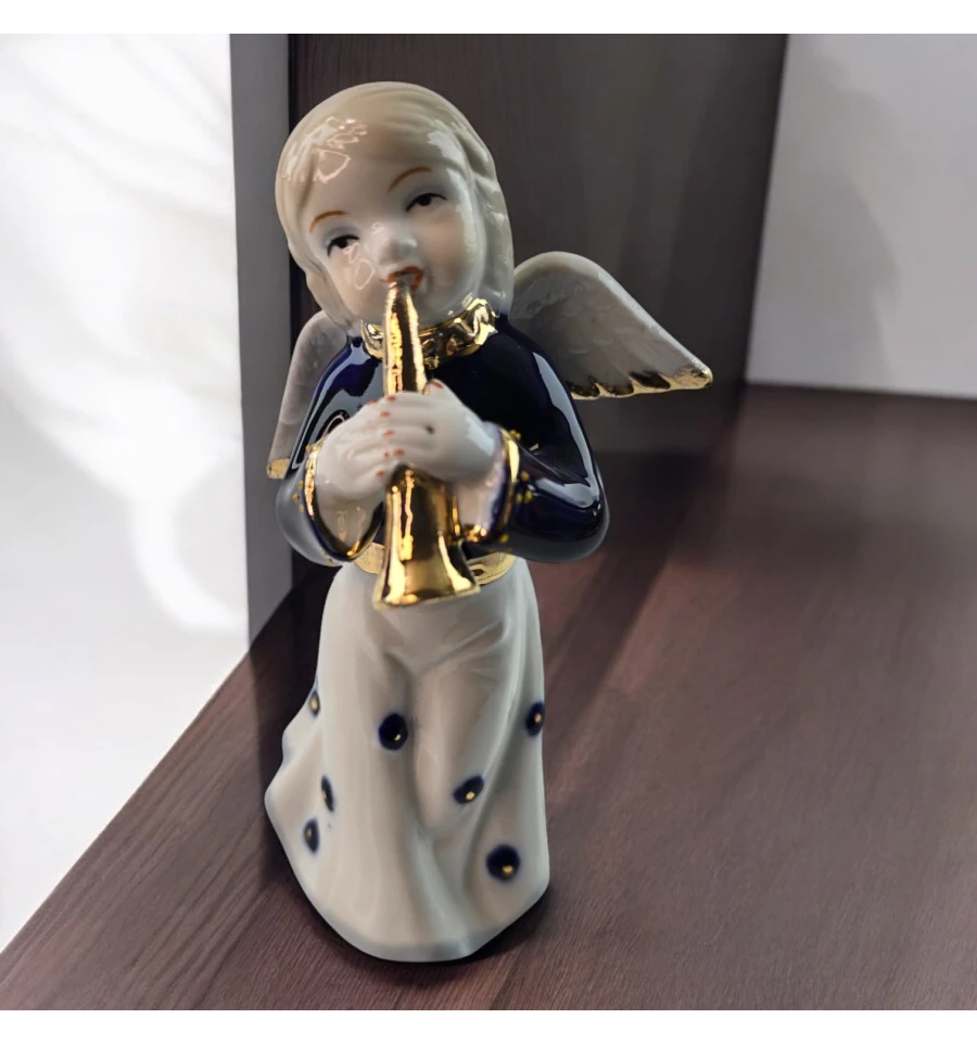 Эта очаровательная фигурка ангела с трубой создаст атмосферу уюта и спокойствия в вашем доме. Изящный дизайн, нежные черты лица и золотистая труба придают ангелу особый шарм. Его белоснежное платье украшено темно-синими декоративными элементами, а детализированные крылья добавляют утончённости. Идеальный выбор для украшения интерьера или в качестве подарка на любой праздник.
