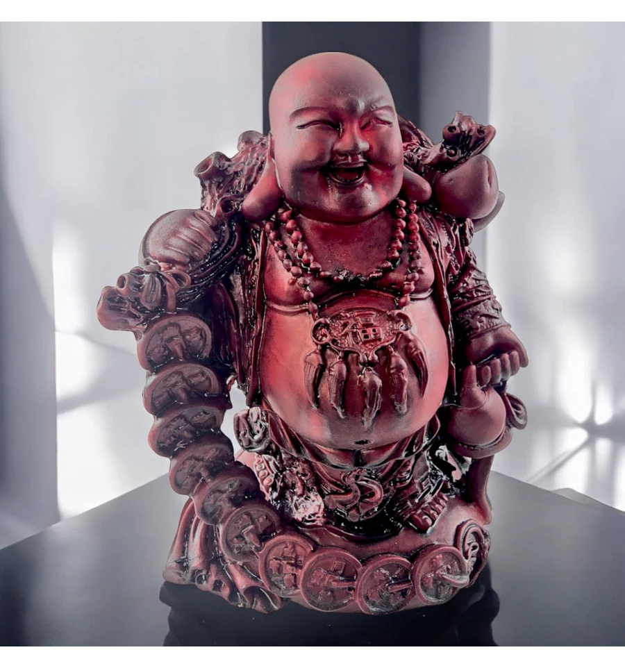 Добавьте в свой дом немного радости и гармонии со статуэткой Смеющегося Будды (также известного как Хотэй или Будда счастья). Этот веселый Будда, с широкой улыбкой и мешком богатства, символизирует удачу и процветание. Он окружен китайскими монетами, которые приносят достаток и положительную энергию в любое пространство. Гладкая поверхность и насыщенный красноватый оттенок придают ему вид старинной резьбы, создавая особую атмосферу тепла и уюта. Эта статуэтка станет отличным оберегом для вашего дома или офиса, а также оригинальным подарком для близких.