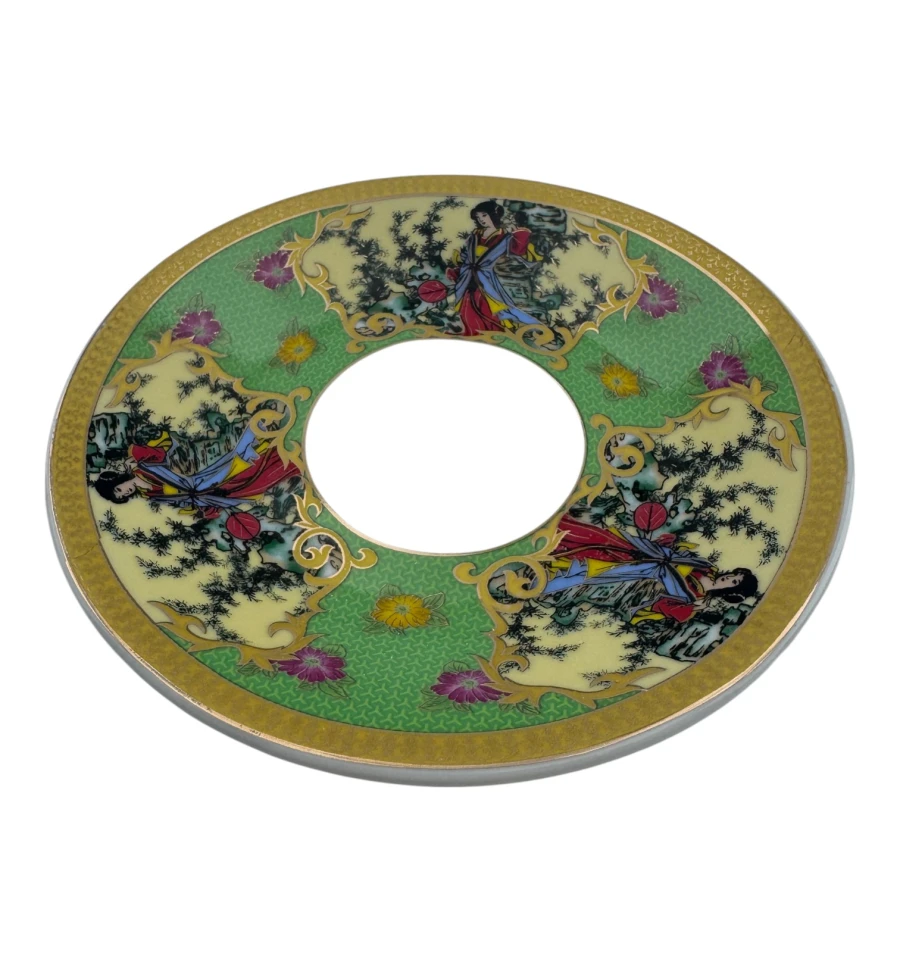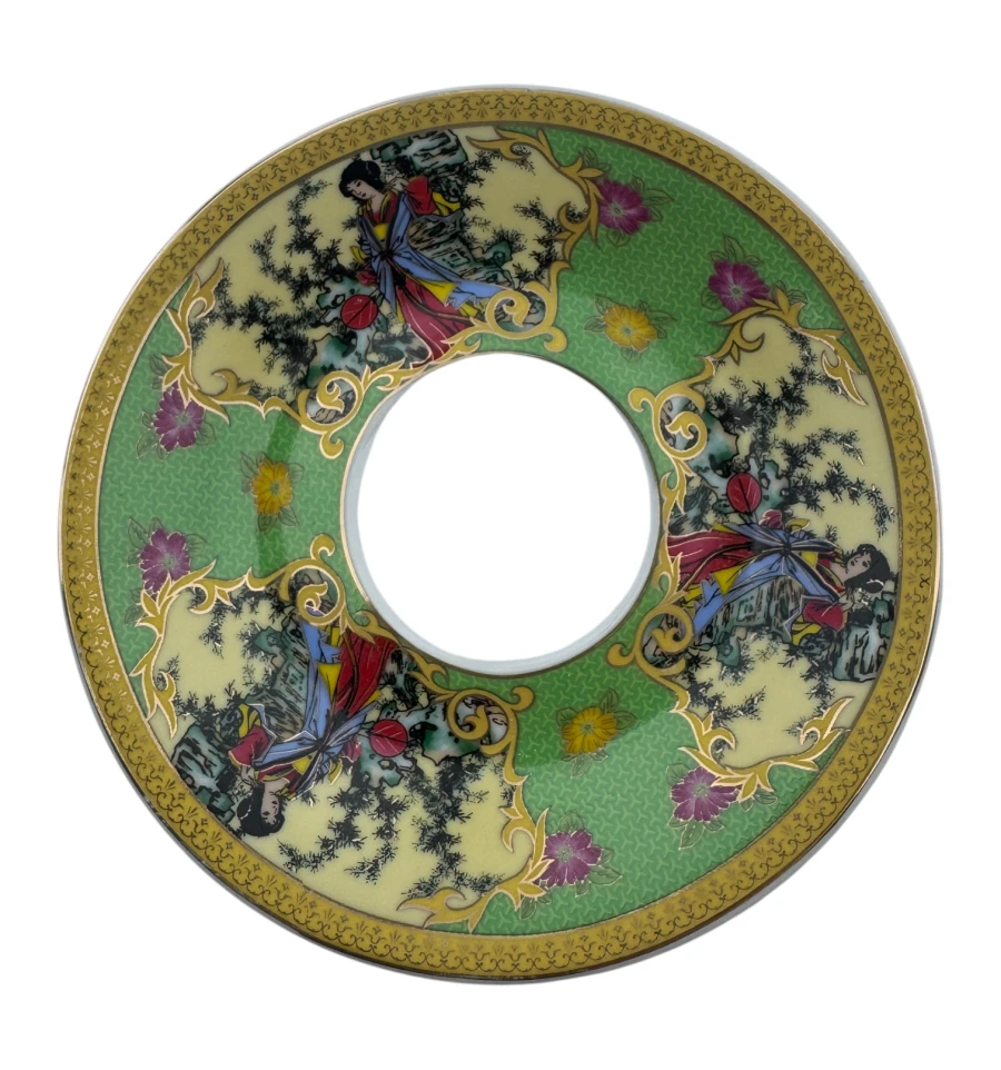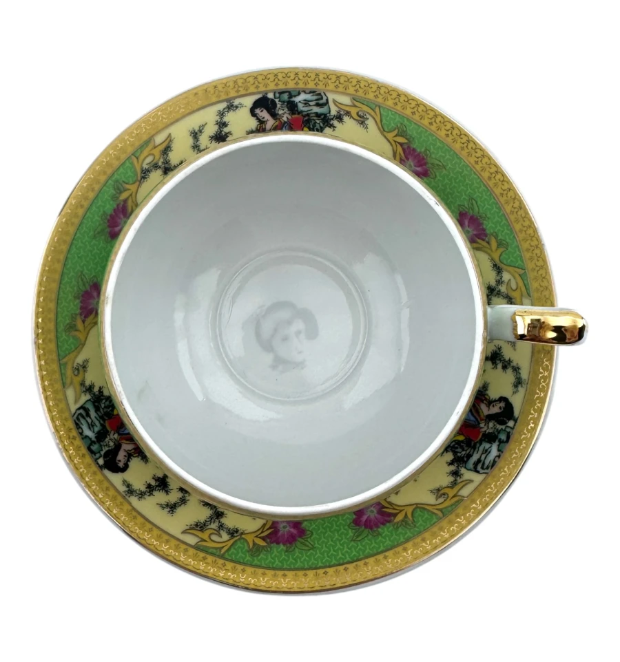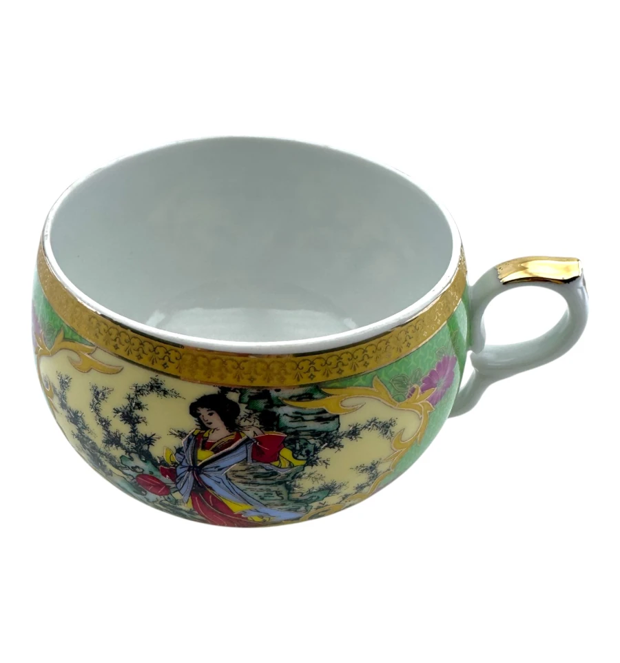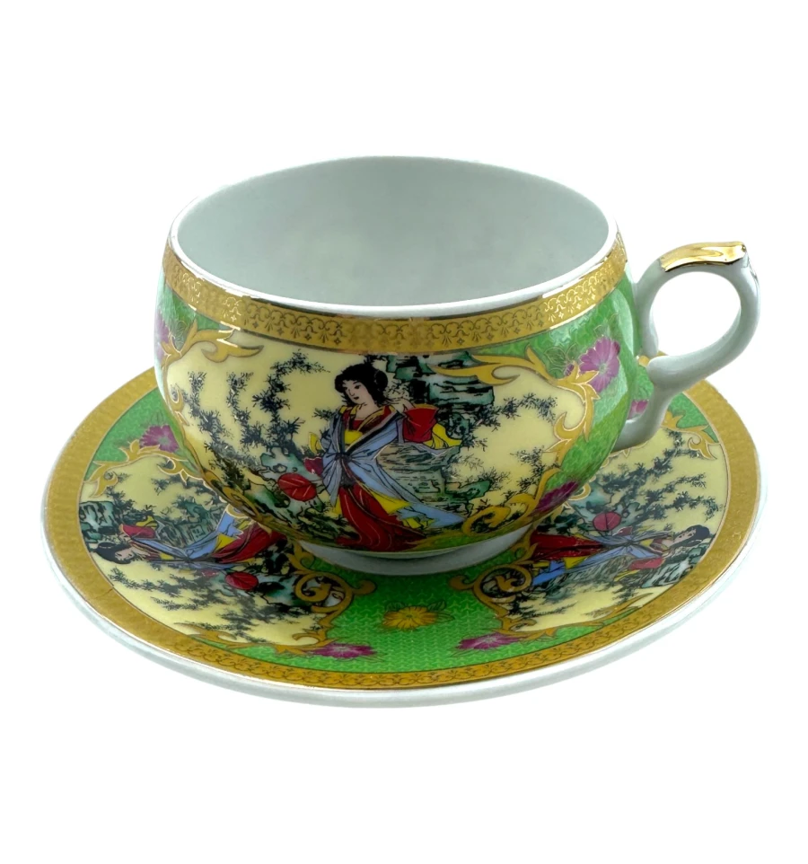 Изысканный чайный набор от японского бренда Yamasen, созданный в стиле традиционного восточного искусства. Комплект состоит из чашки и блюдца, изготовленных из тонкого фарфора с ярким орнаментом и изображением японских гейш среди пейзажей. Золотое обрамление по краям и на ручке придает элегантности и изысканности.