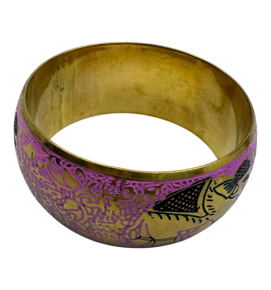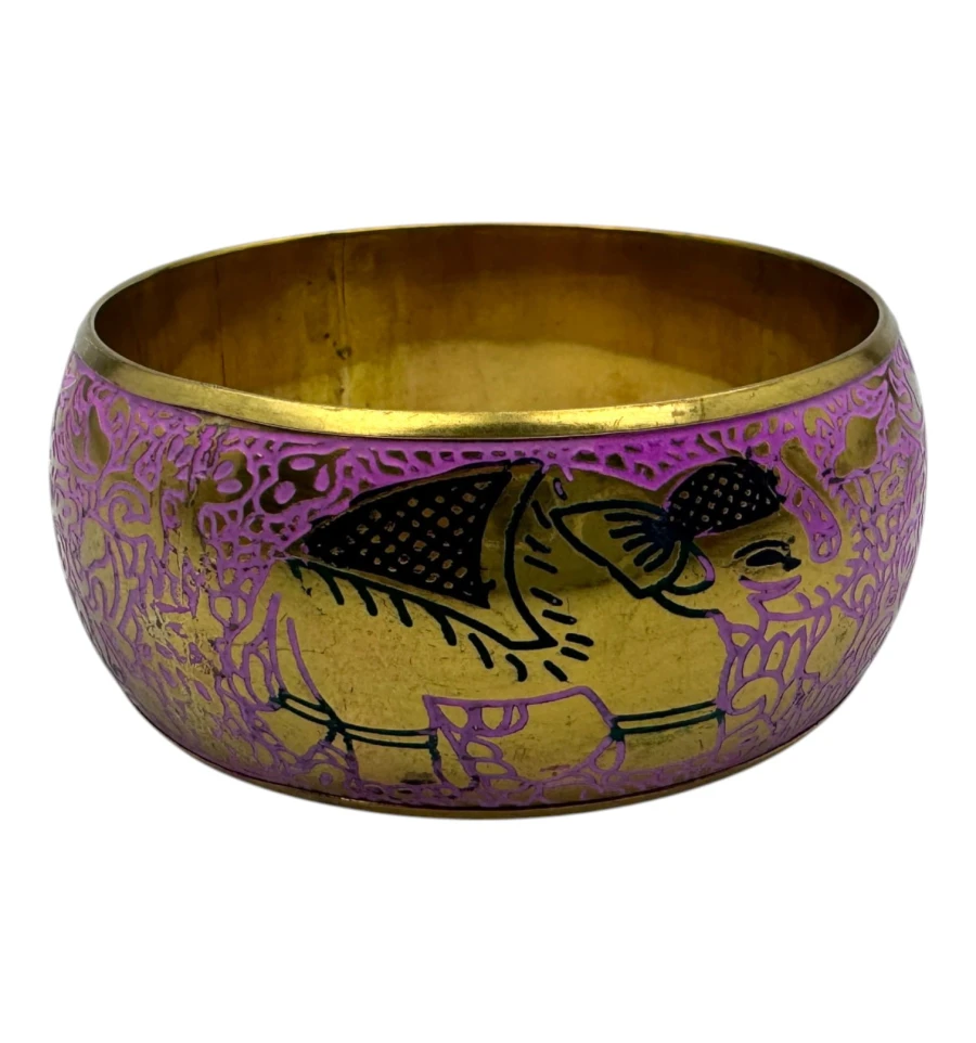 Оригинальный бронзовый браслет с яркой эмалью и гравировкой в восточном стиле. Украшен изображением слонов — символов силы, мудрости и благополучия. Благодаря насыщенным цветам и этническому дизайну, браслет станет выразительным акцентом вашего образа и привлечёт внимание к деталям.