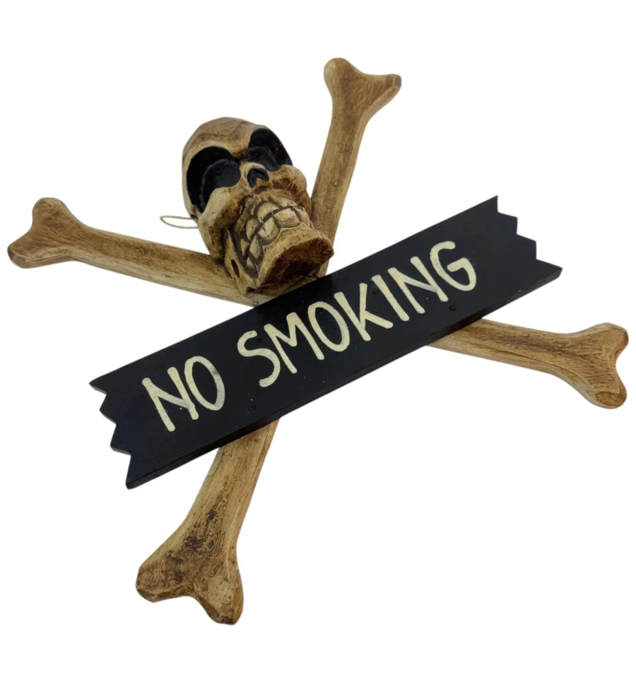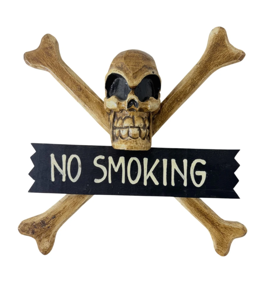 Оригинальное интерьерное украшение в виде черепа с перекрещенными костями и надписью "NO SMOKING". Такая табличка привлечёт внимание и добавит характер в любое пространство — от дома до тематического кафе, студии или бара.