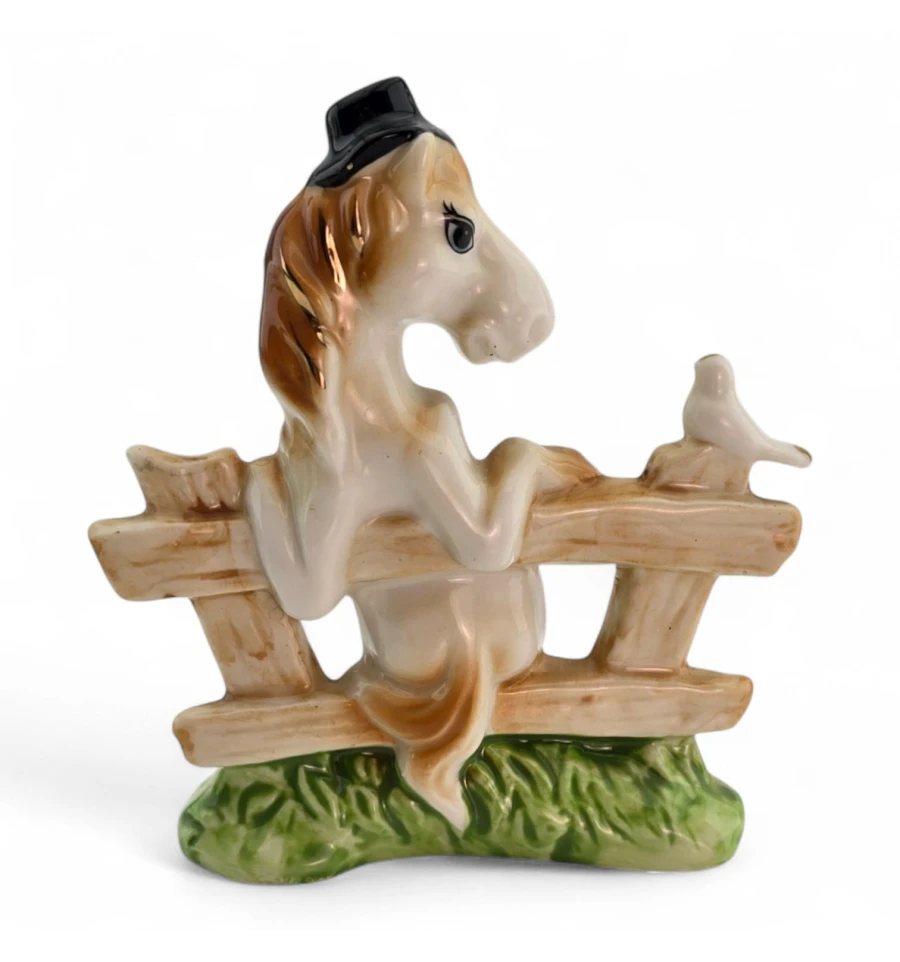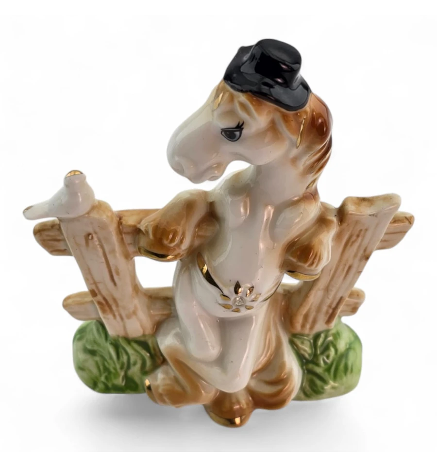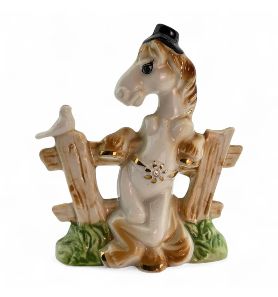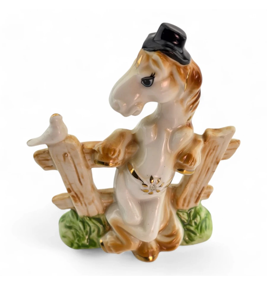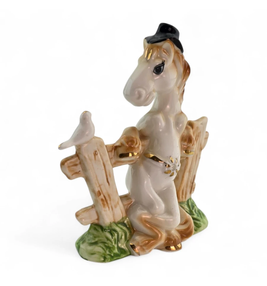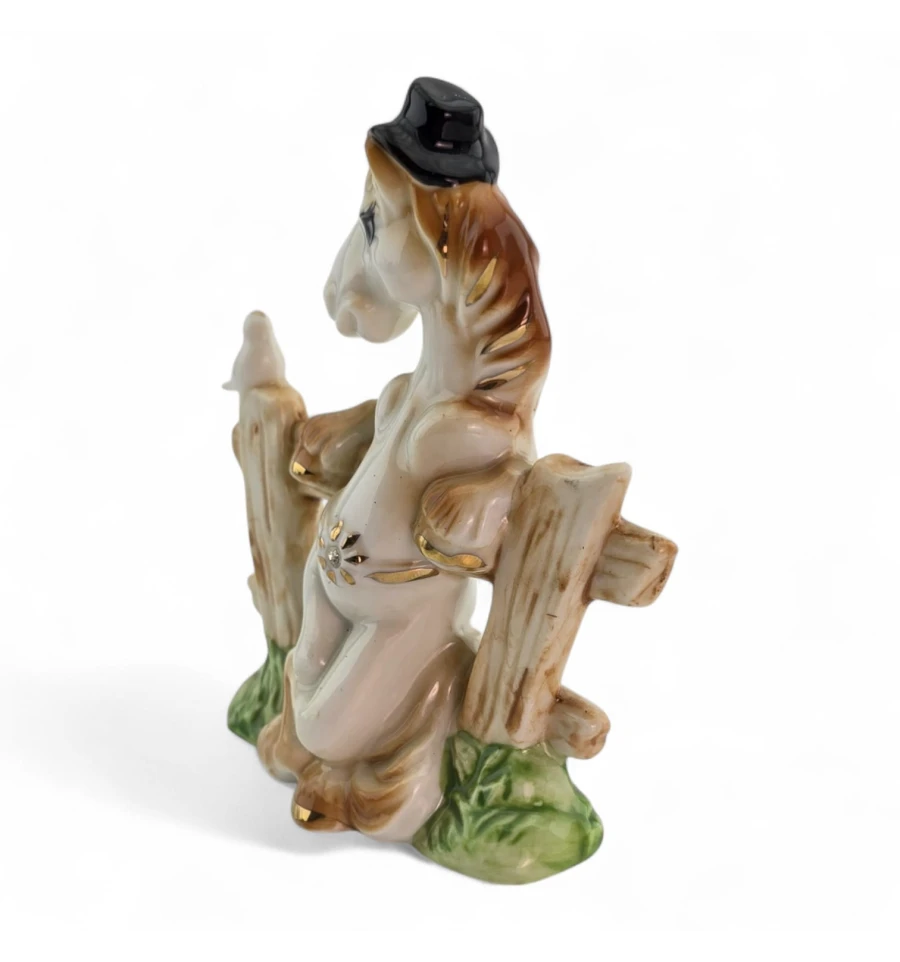 Декоративная фарфоровая статуэтка лошади в шляпе у деревянного забора. Глянцевая глазурь и золотистые акценты подчёркивают детали, изделие гармонично смотрится в гостиной, детской или кабинете и подойдёт как сувенир. Производство Китай.
