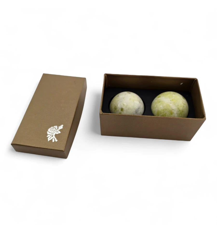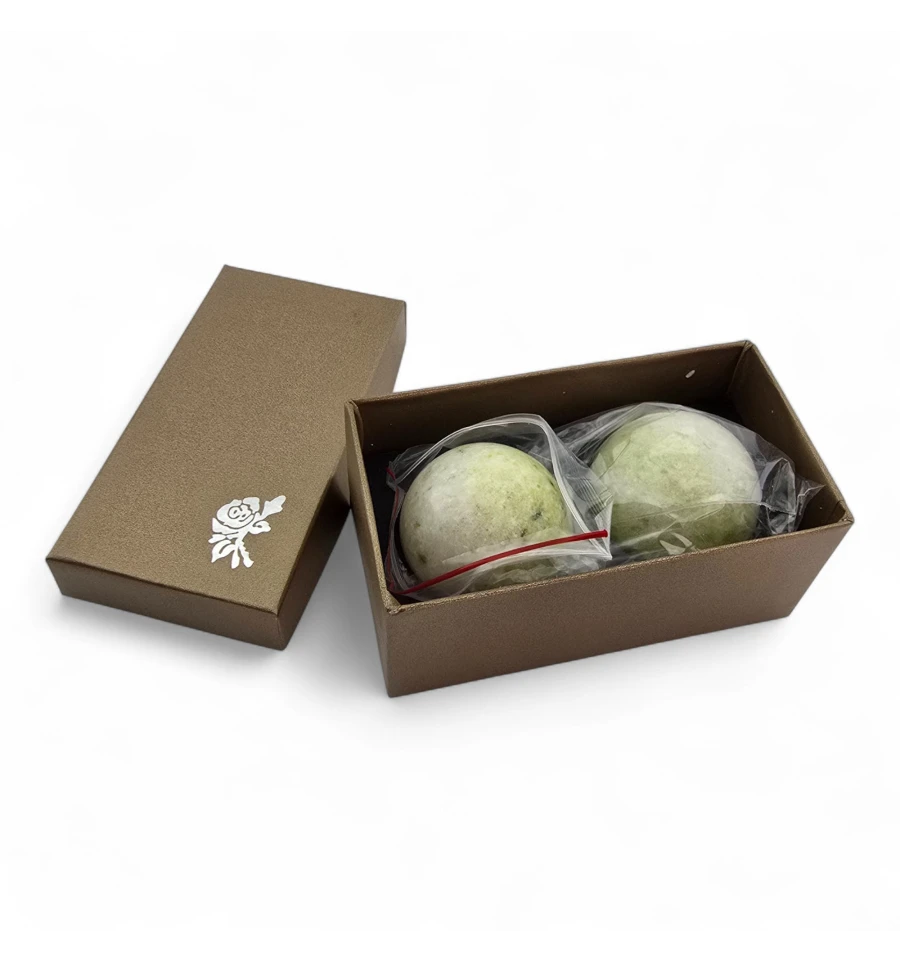 Пара полированных шариков из нефрита для упражнений Баодин. Укрепляют мышцы кисти и пальцев, улучшают координацию, помогают снять напряжение и стресс. Холодная поверхность натурального камня дает приятный массажный эффект, подходит для медитации и ежедневной релаксации. Каждый шар имеет уникальный оттенок и рисунок. В комплекте плотная коробка для хранения.