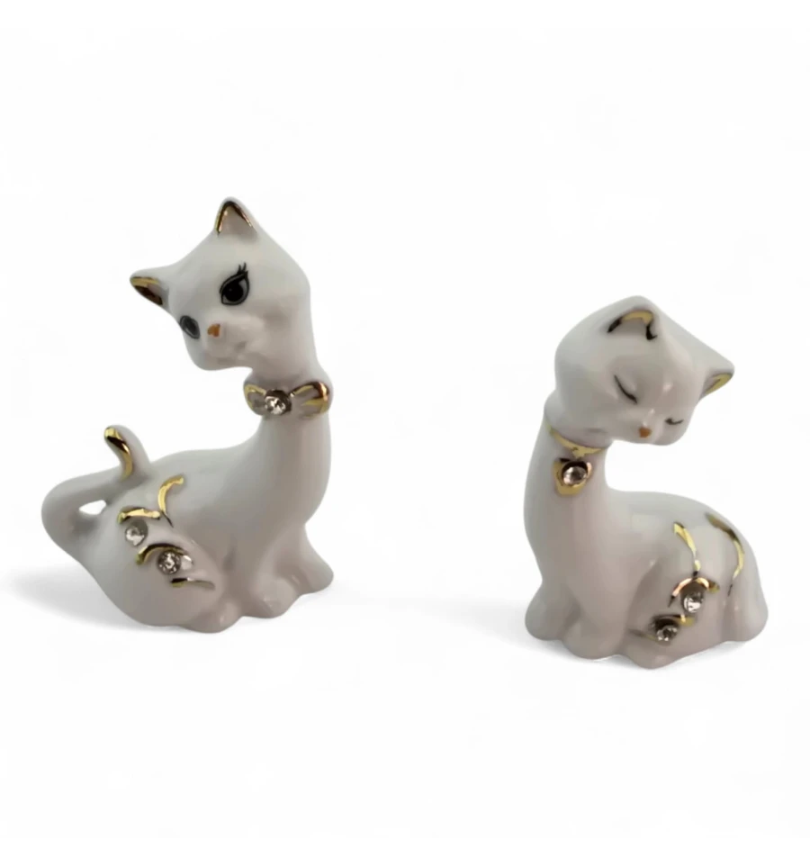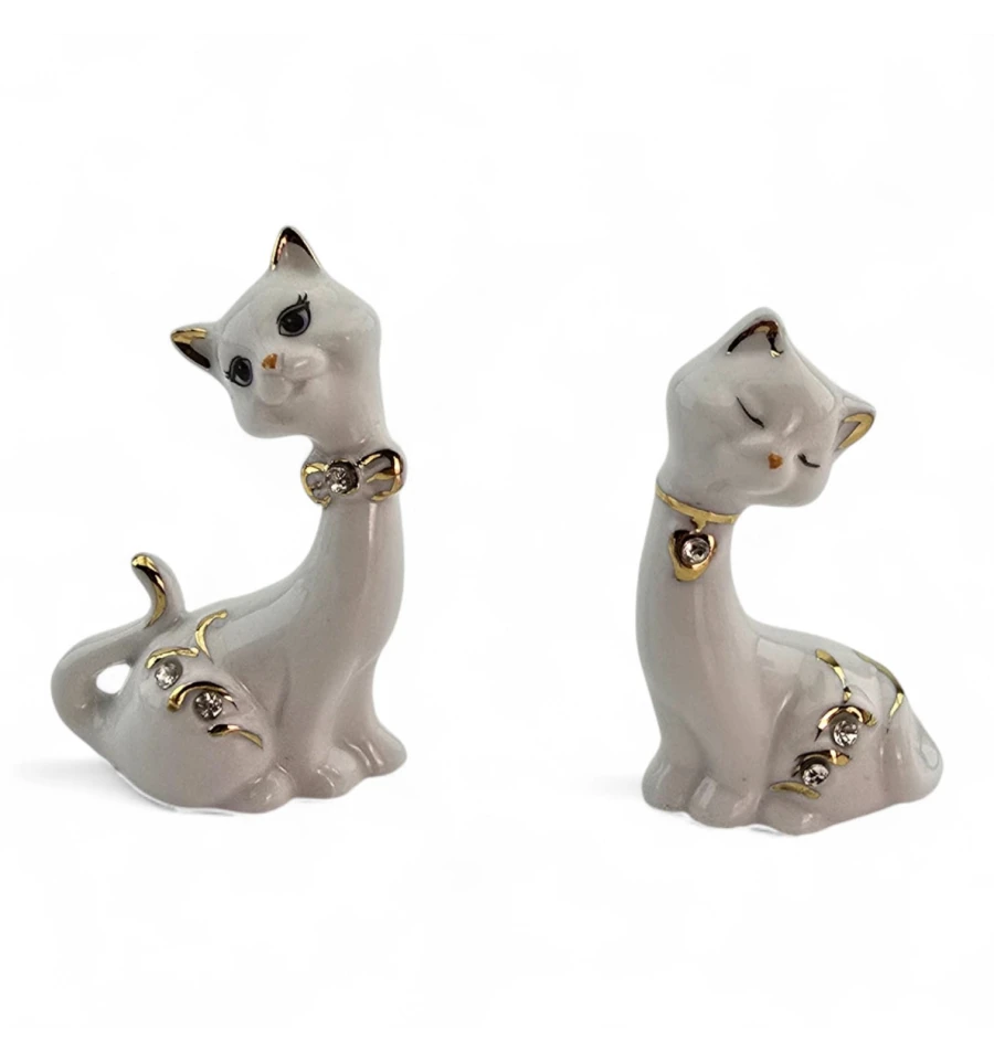 Нежный набор из двух фарфоровых статуэток котов. Глянцевый белый фарфор украшен золотистыми акцентами и вставками под кристаллы на ошейниках. Компактный размер удобен для полки, рабочего стола или прикроватной тумбы. Отличный подарок любителям кошек и стильного интерьера.