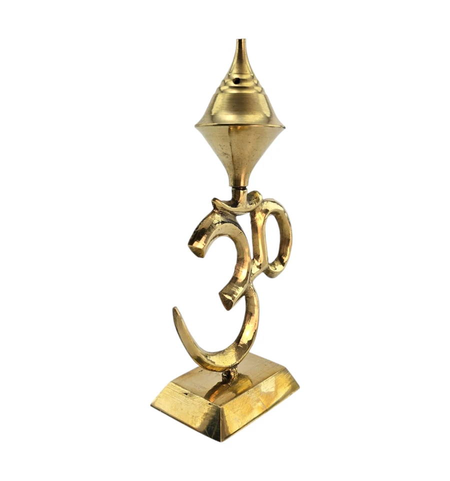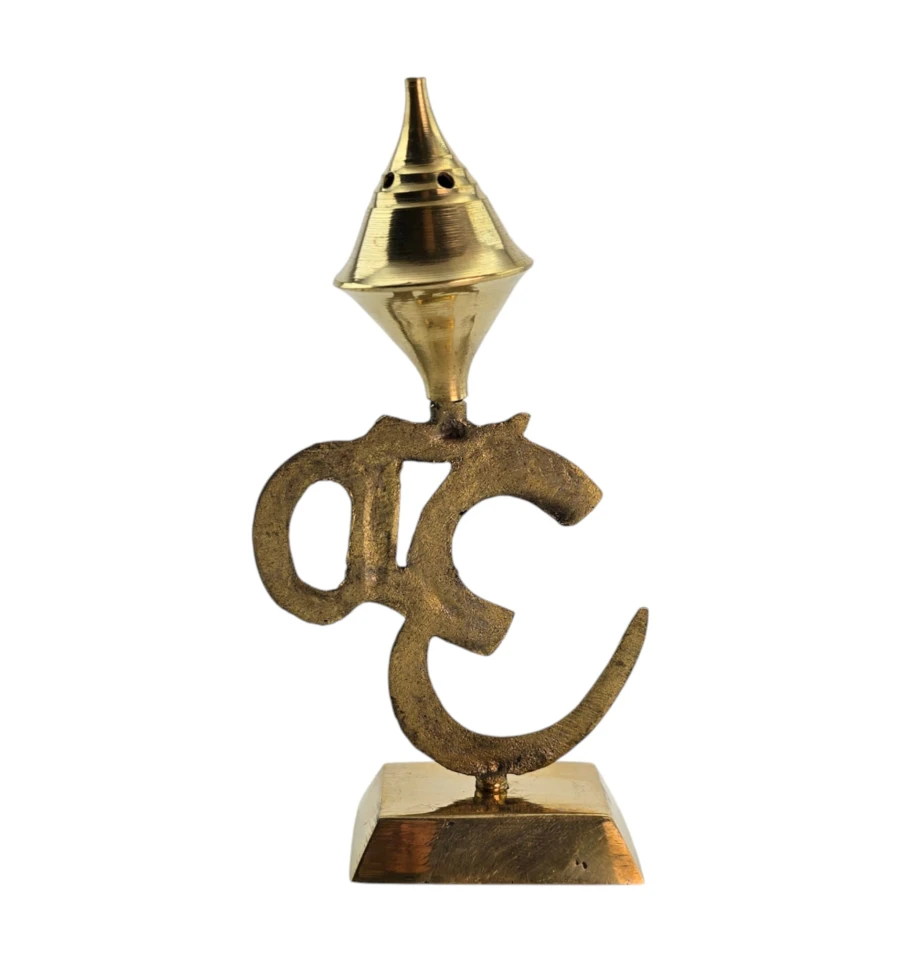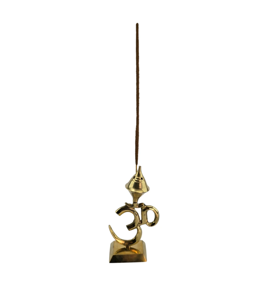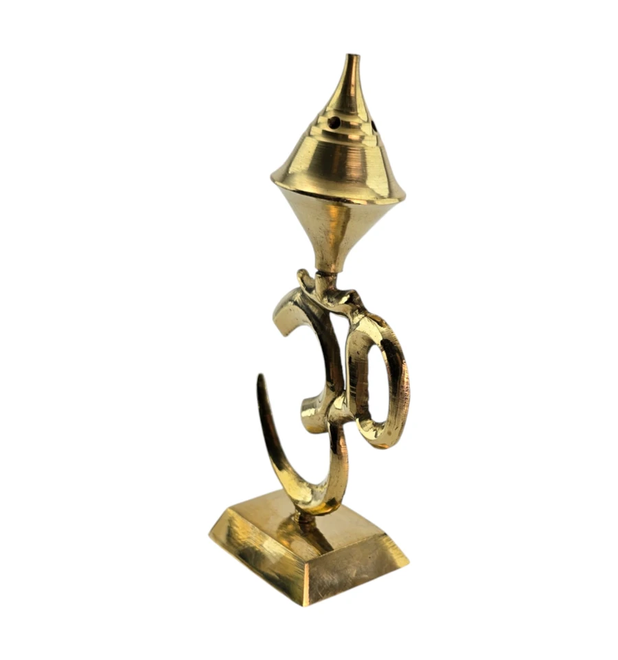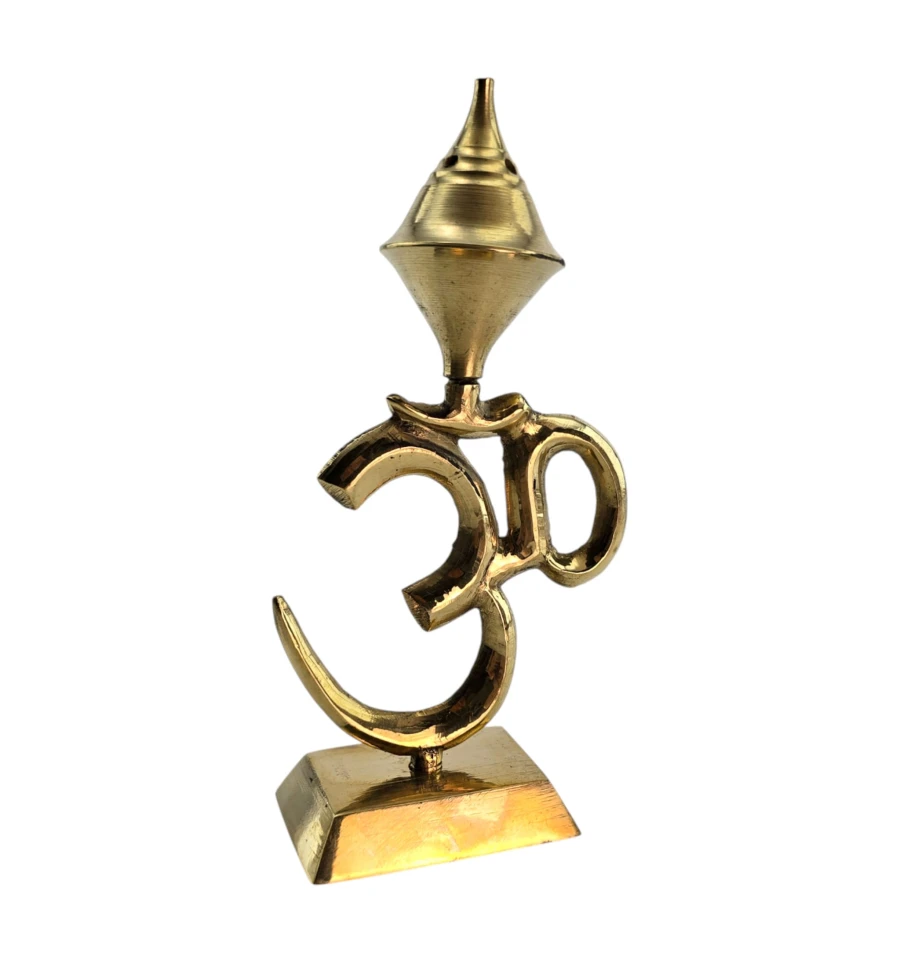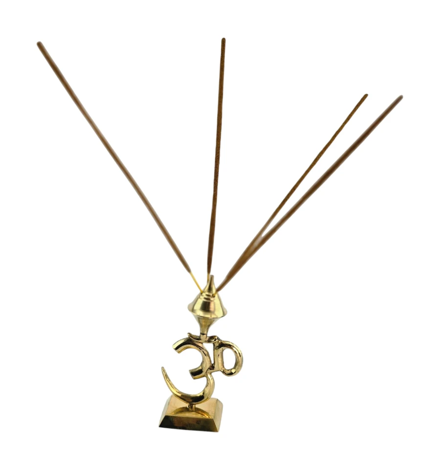 Настольная подставка для ароматических палочек в форме священного символа Ом. Произведена в Индии из латуни в золотистом цвете. Верхний конус-купол с отверстиями позволяет установить до 4 палочек одновременно. Устойчивая база удобна для домашнего алтаря, медитаций, практик йоги или как акцентный декор. Используйте на негорючей поверхности и не оставляйте без присмотра. Из-за ручного литья и полировки возможны небольшие отличия от фото.