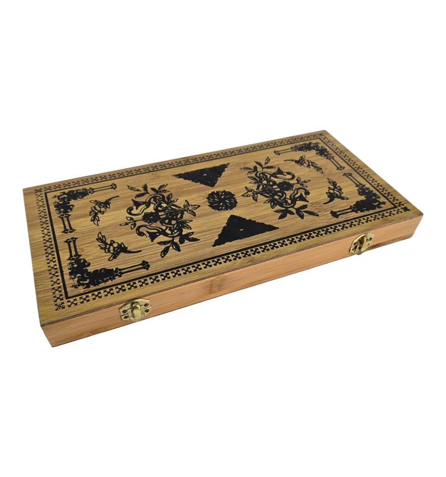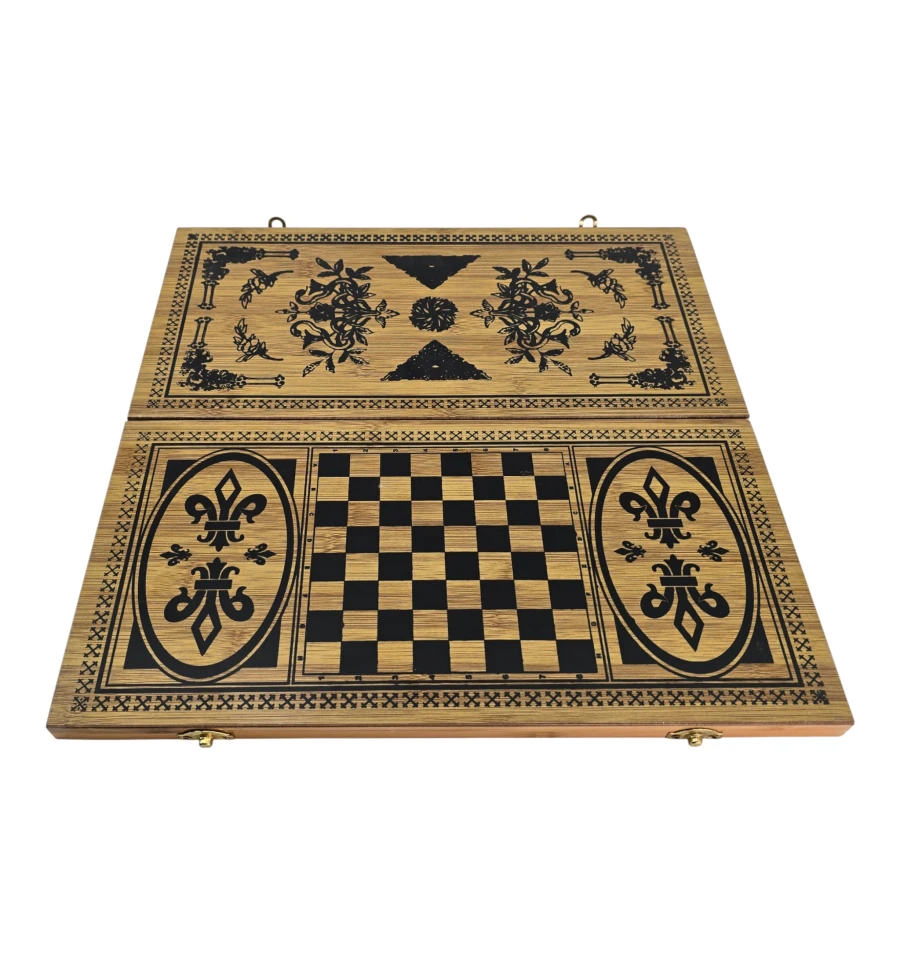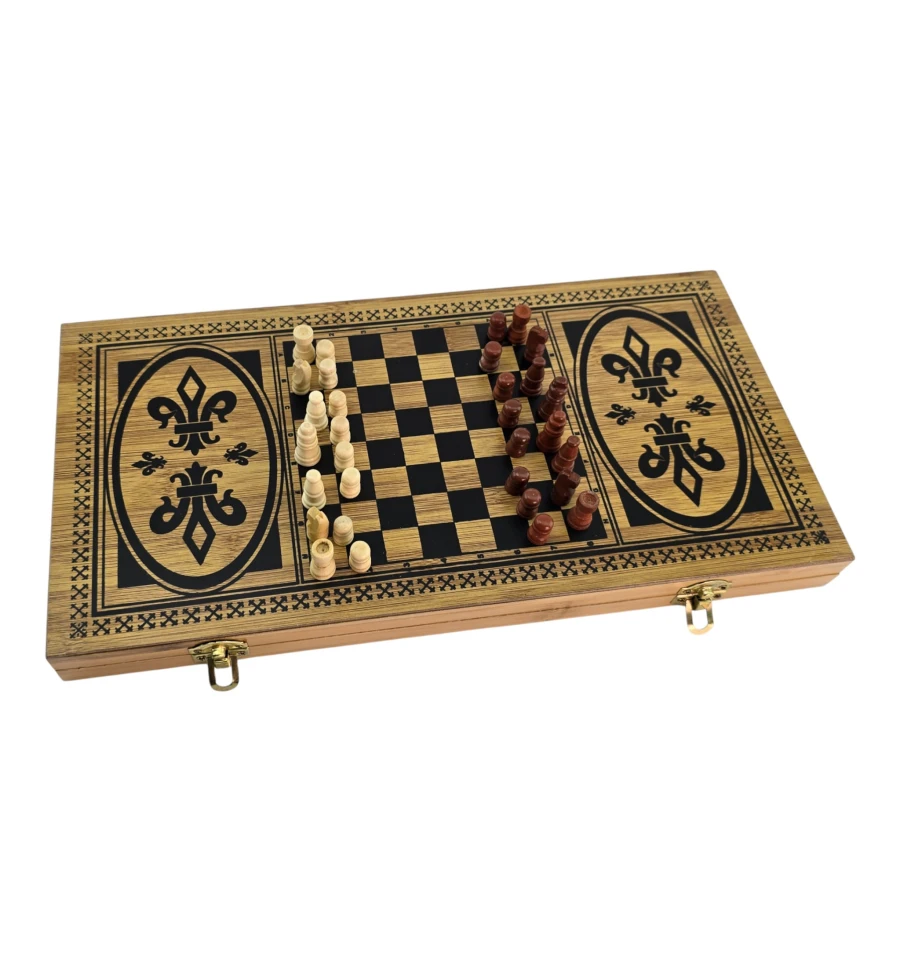 Складной настольный набор трёх классических игр в одном футляре. Снаружи нанесена шахматная доска с орнаментом, внутри - поле для нард. В комплект входят деревянные шахматные фигуры, деревянные шашки и пластиковые кубики. Удобно брать в дорогу, играть дома и дарить как семейную игру. Складная конструкция экономит место и быстро готова к партии. Допускаются небольшие отличия от фото из-за особенностей печати и обработки дерева.