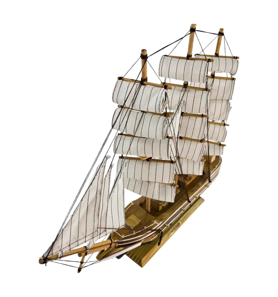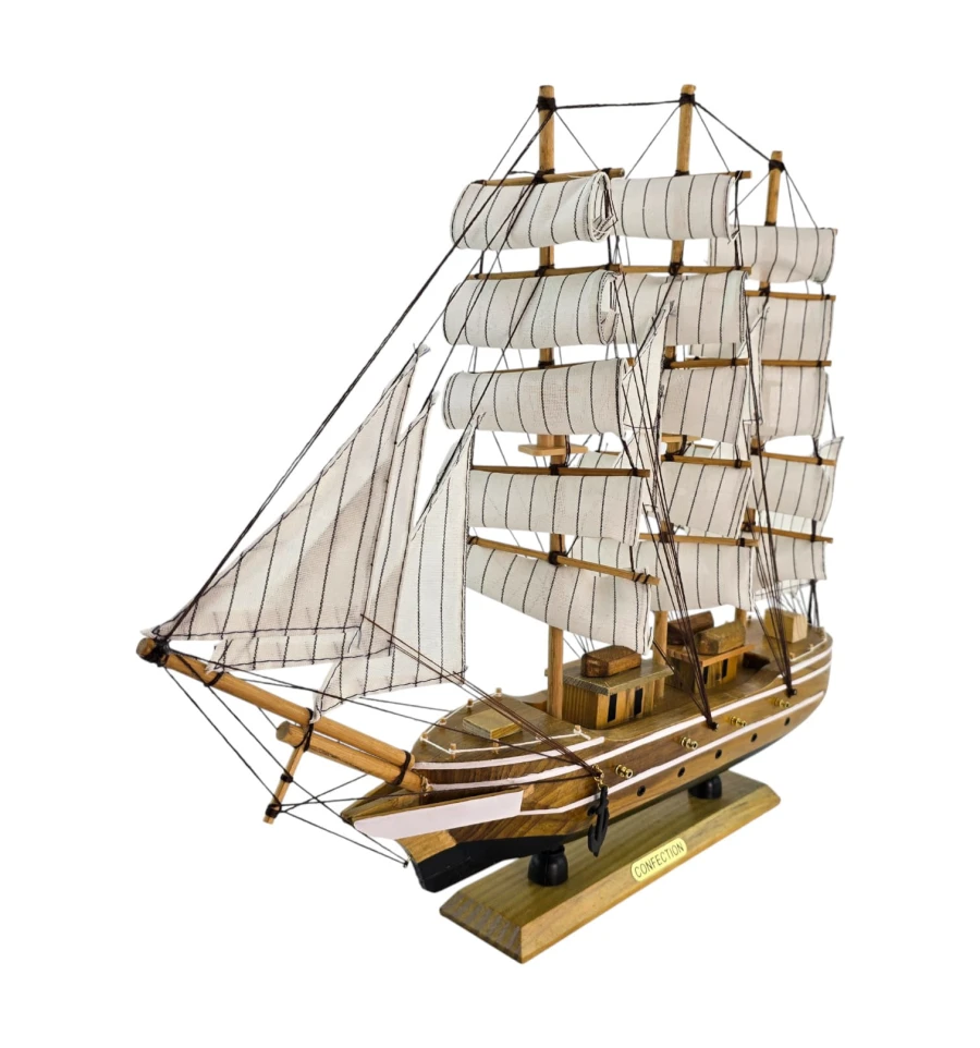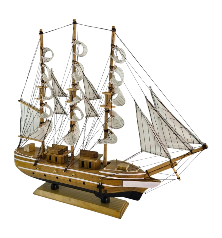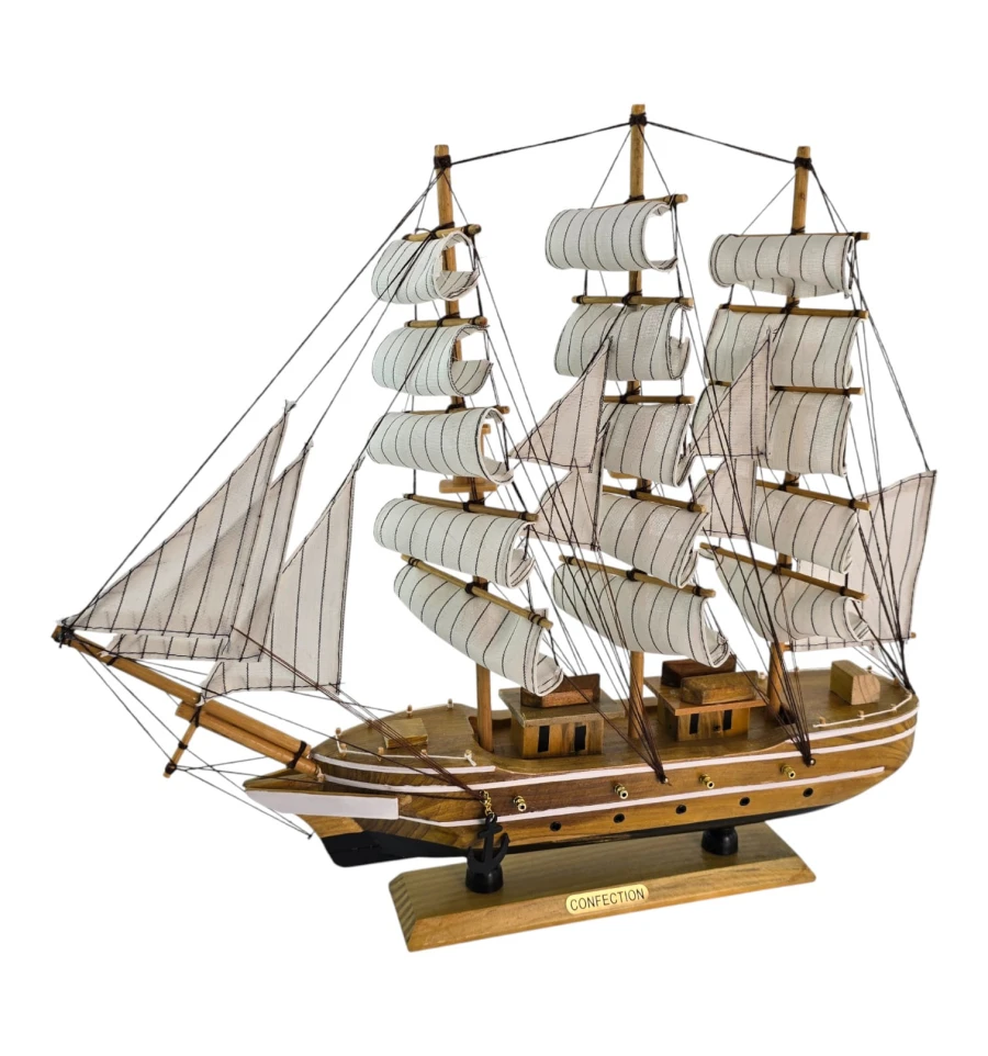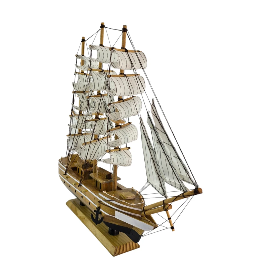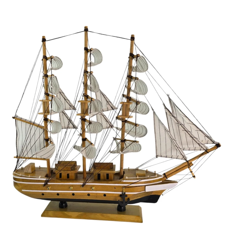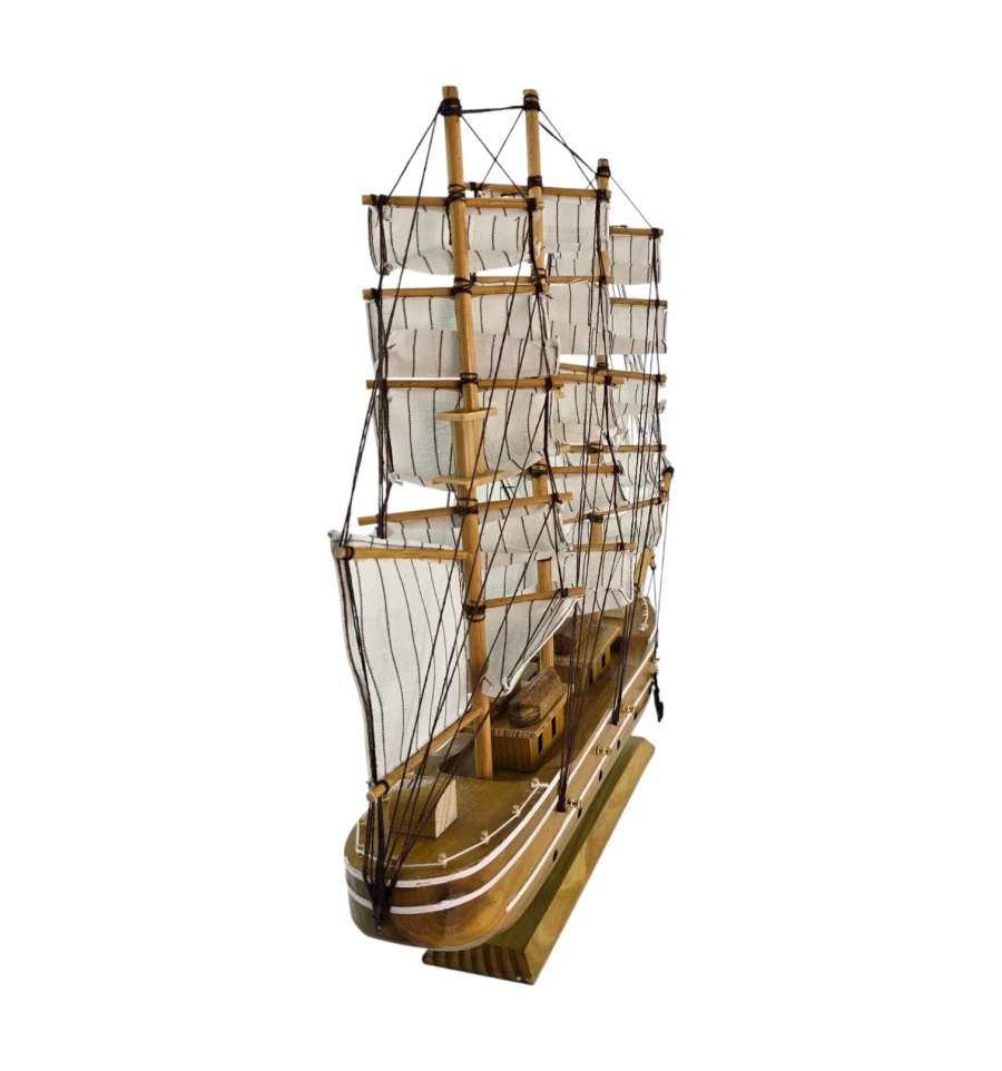 Крупная настольная модель парусника с белыми парусами - эффектный акцент для кабинета, гостиной или детской. Корабль выполнен из дерева с тканевыми парусами и установлен на подставке, поэтому его удобно разместить на полке или рабочем столе. Отличный подарок любителям моря, путешествий и истории флота; придаёт интерьеру ощущение приключений и свободы.