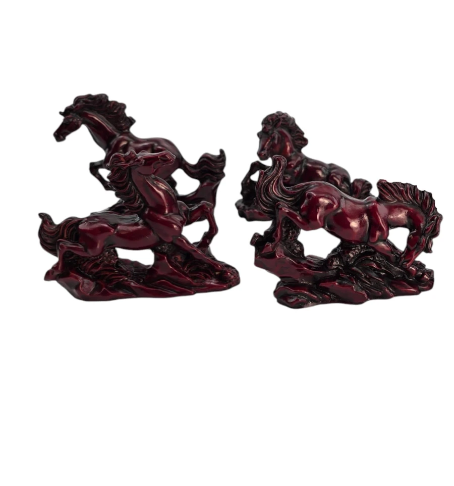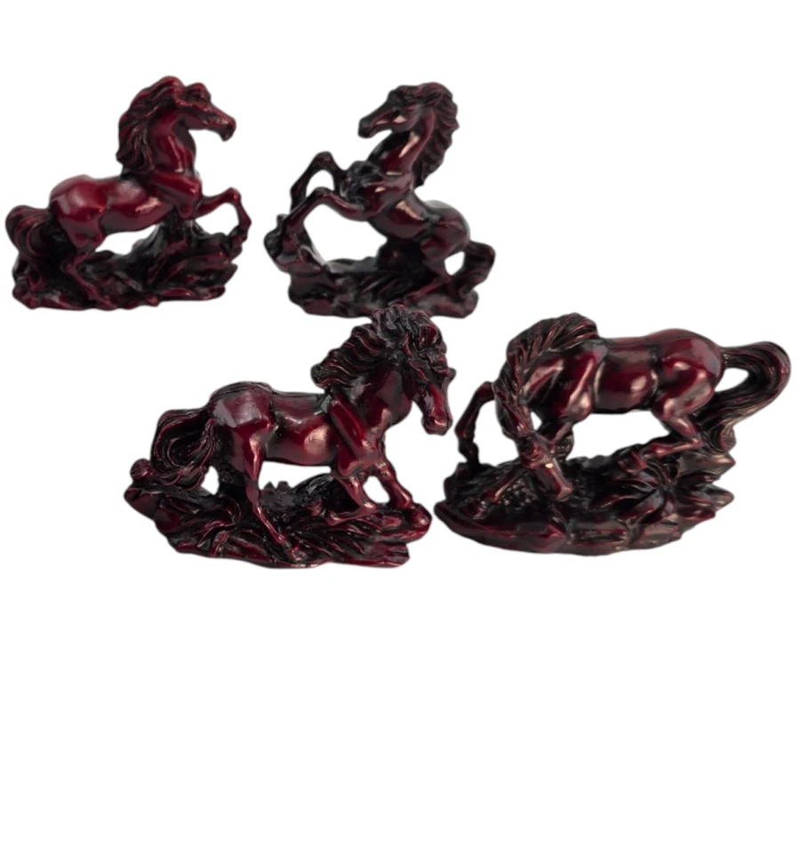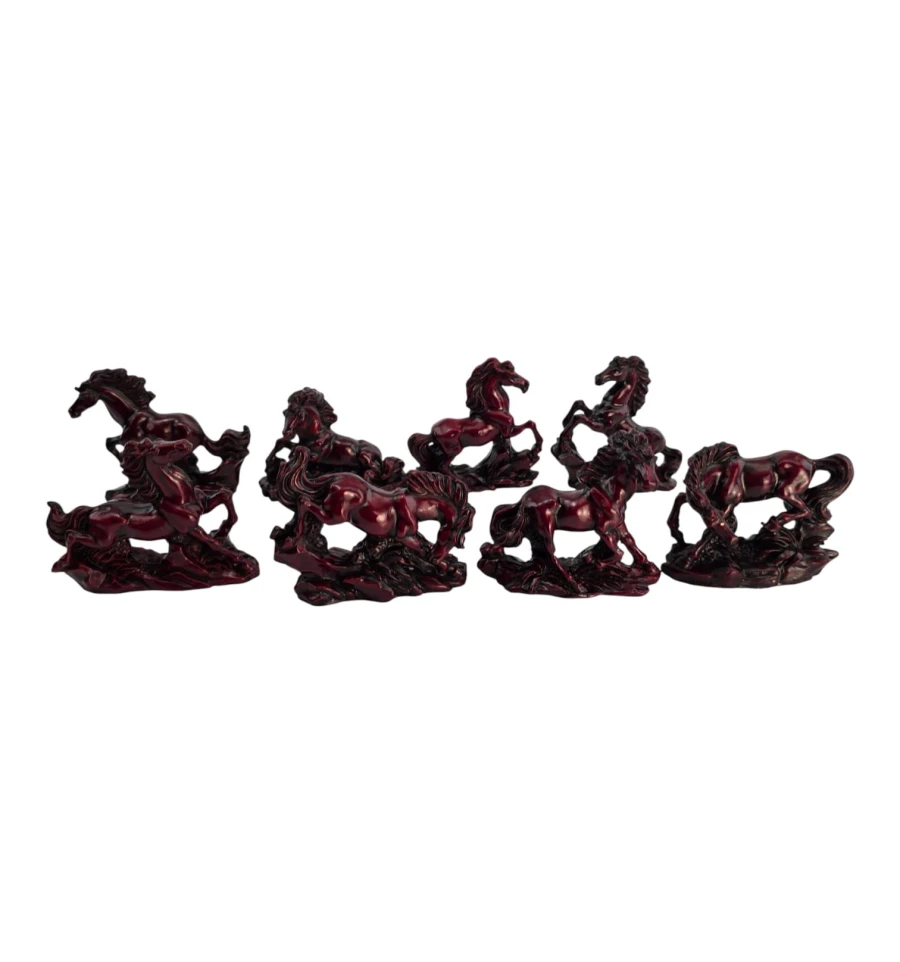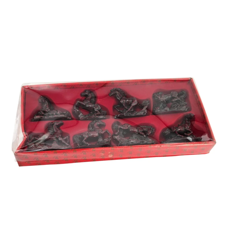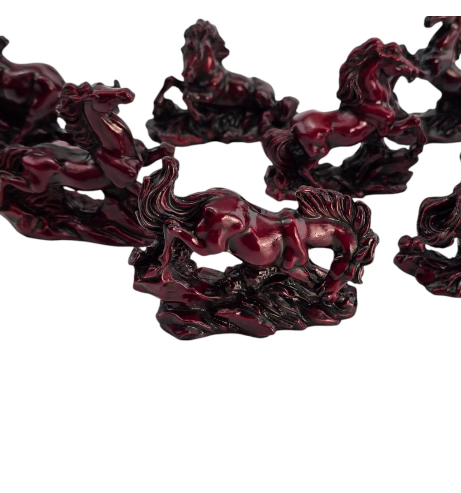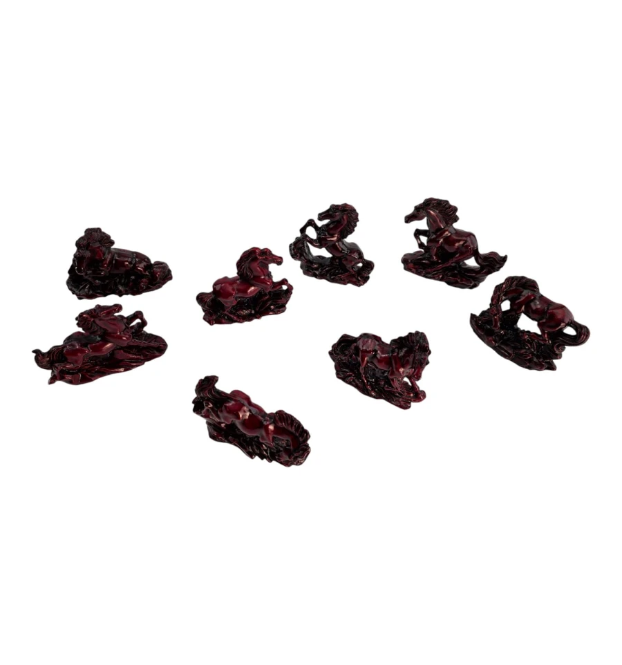 Набор из 8 мини-скульптур лошадей в разных динамичных позах. В фэн-шуй лошадь олицетворяет успех, скорость, карьерный рост, славу и признание. Фигурки размещают в гостиной, кабинете или рабочей зоне, желательно «взглядом» к двери или окну - для привлечения возможностей; лучшие сектора: Юг (слава) и Юго-Восток (карьера/проекты). Не рекомендуются для спальни.
