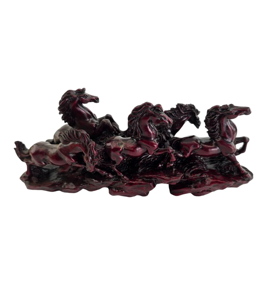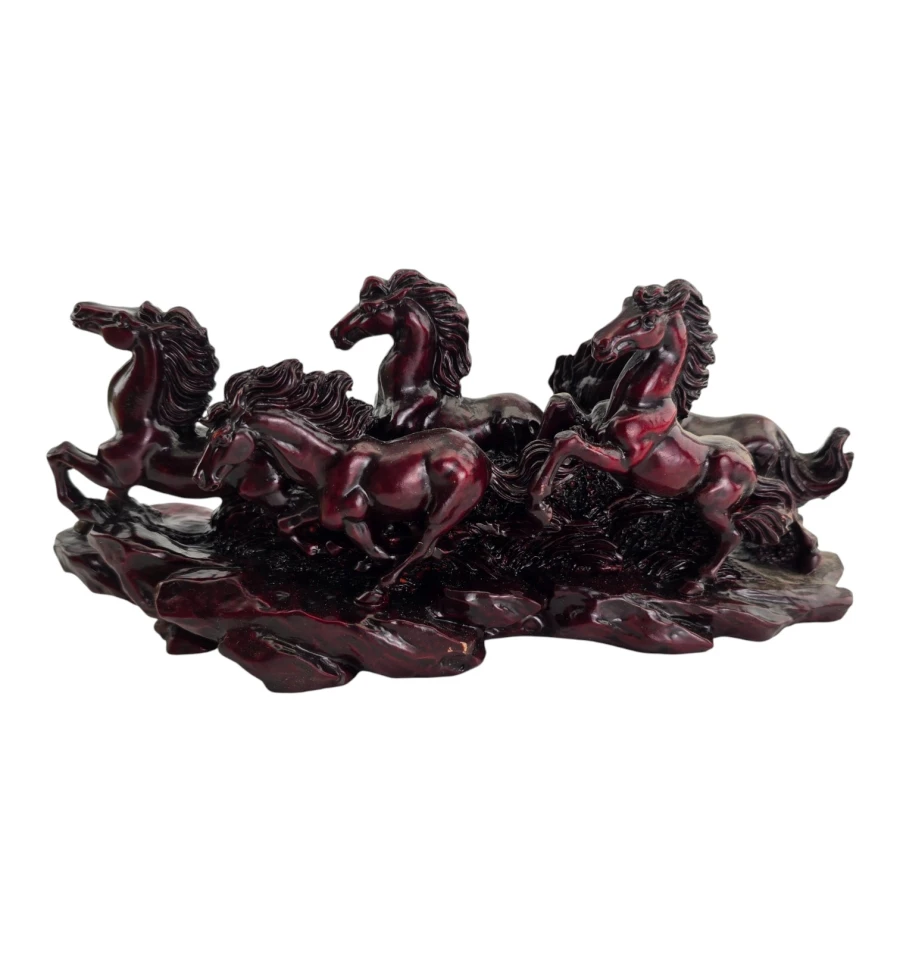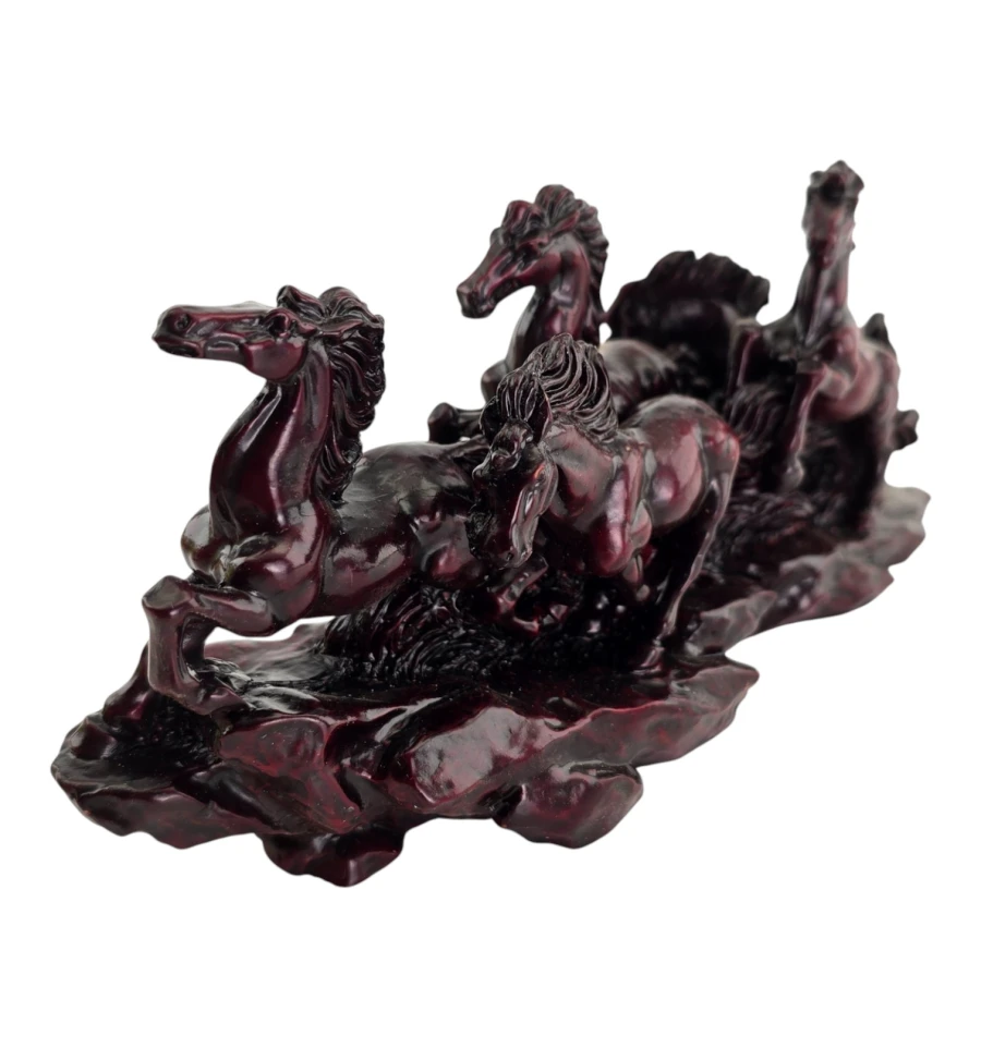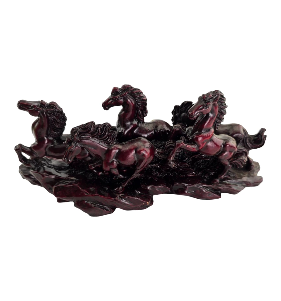 Декоративная фигурка с пятью конями в беге. В фэн-шуй лошадь символизирует скорость, карьерный рывок и признание, а группа лошадей усиливает энергию победы и командного духа. Фигурку ставят в гостиной или кабинете, чаще в южном либо восточном секторе, лицом к окну или двери - чтобы «приглашать» удачу в дом.