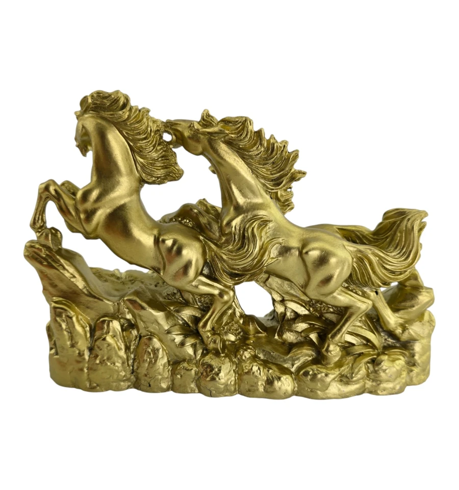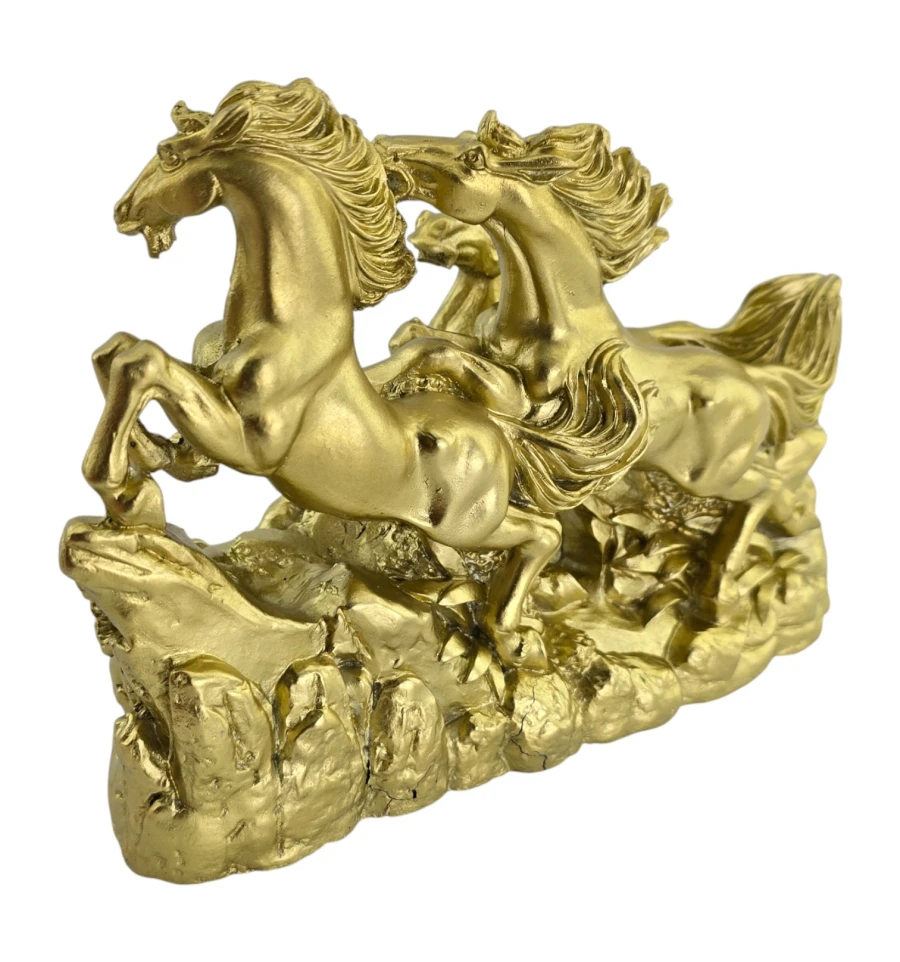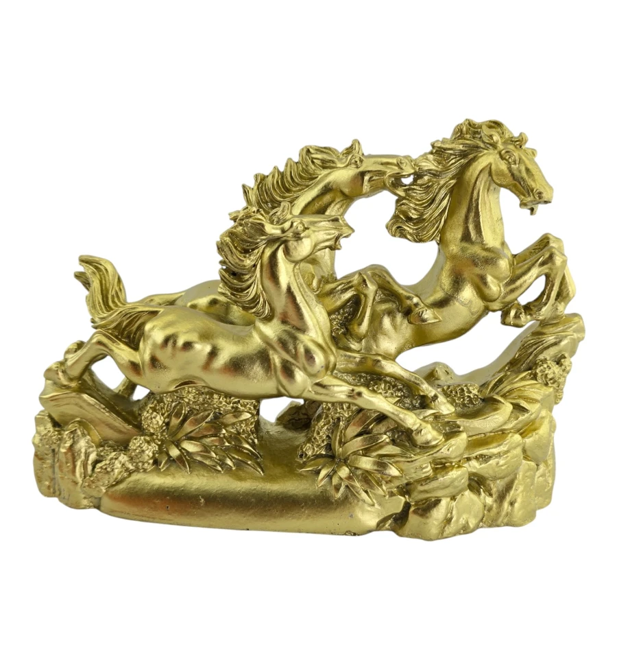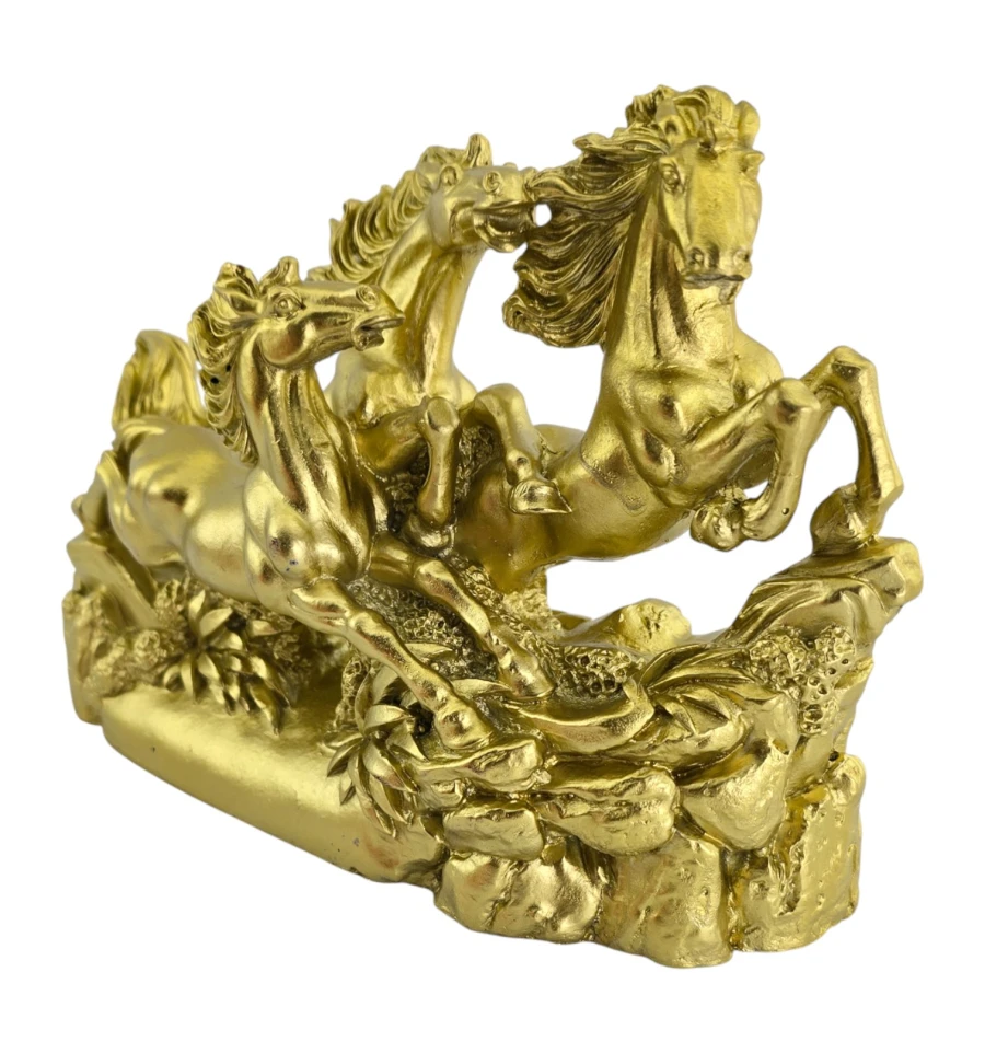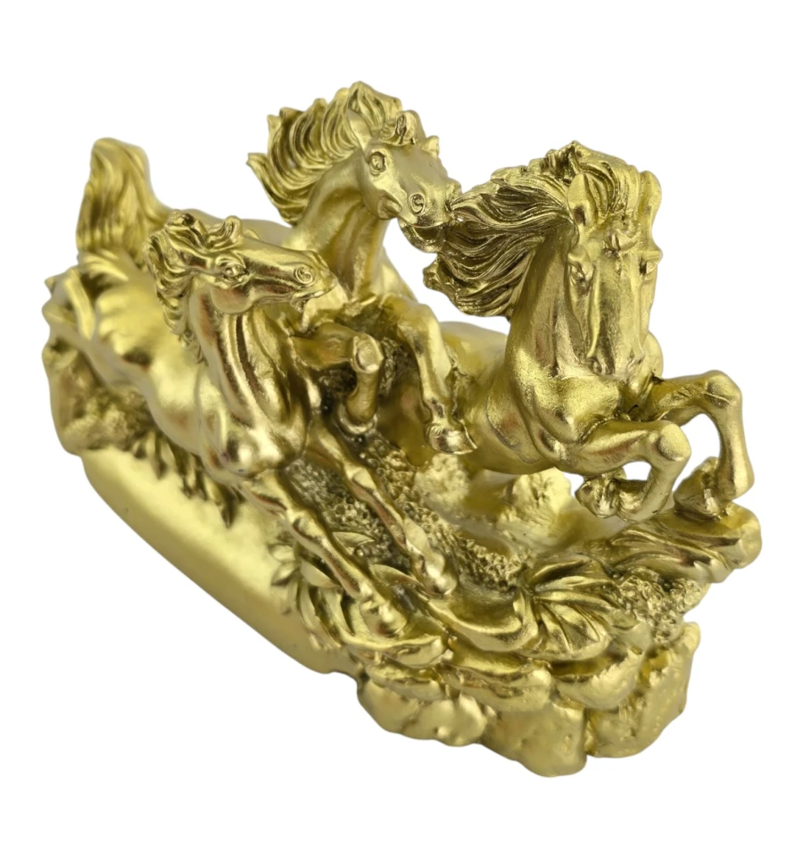 Декор с тремя лошадями в стремительном движении. В фэншуй лошадь обозначает успех, скорость и вдохновение, а число три усиливает рост, командный дух и продвижение вперёд. Размещайте в зоне славы на юге или в зоне достатка на юго-востоке, разворачивая фигурку к входу или окну.