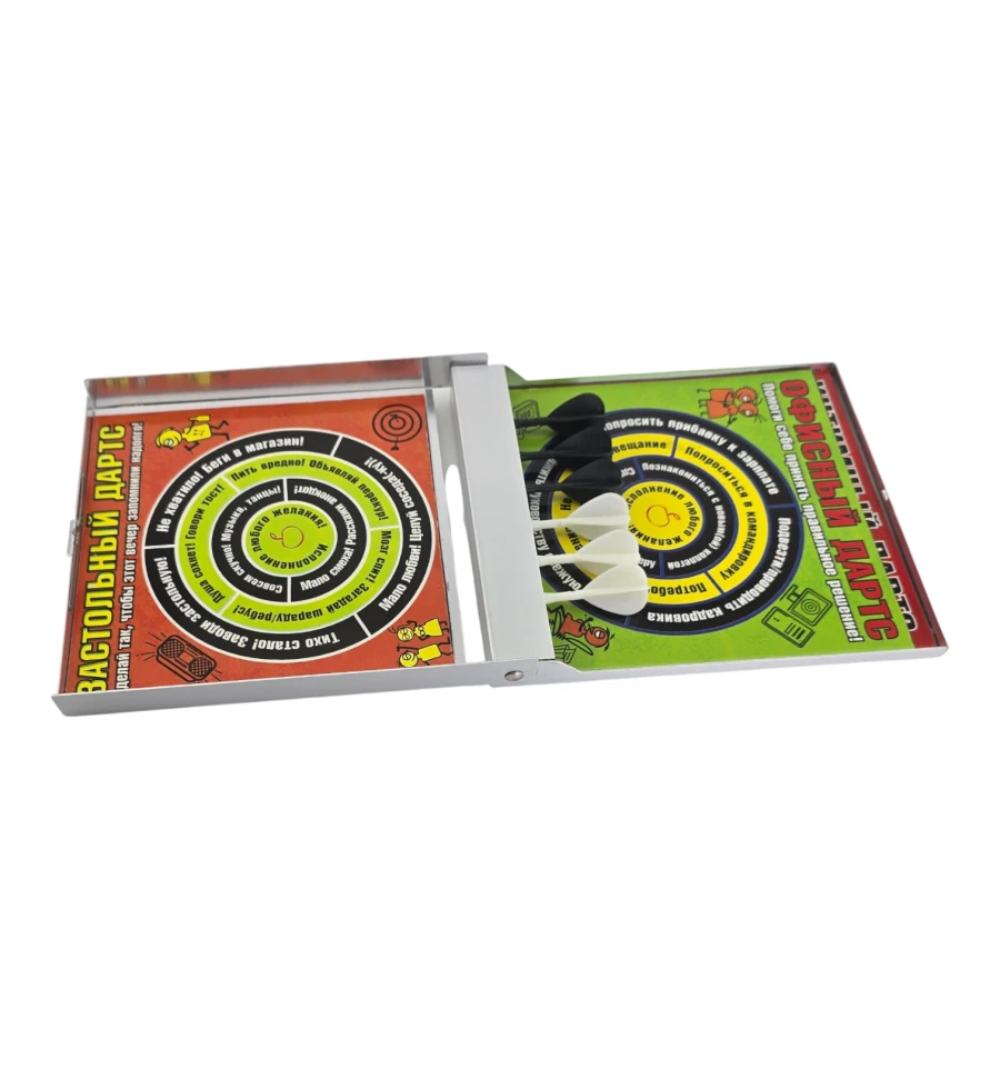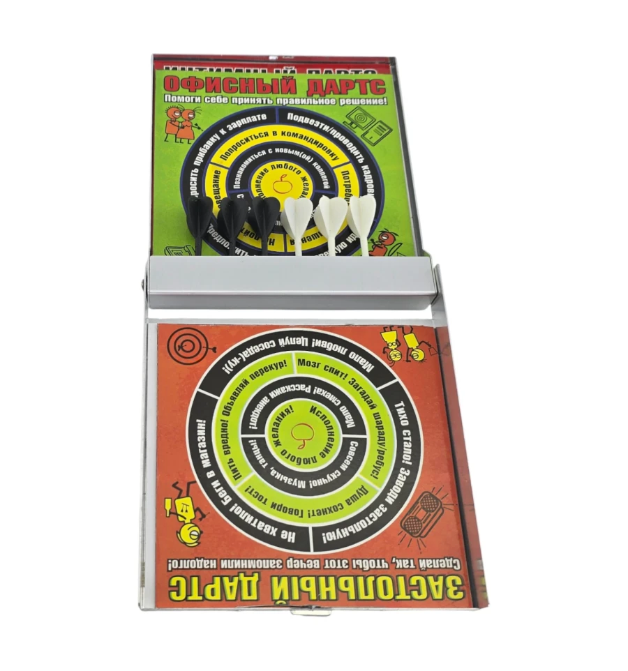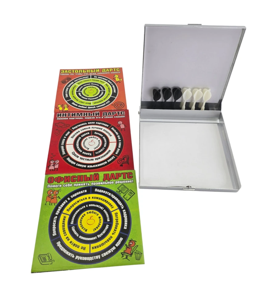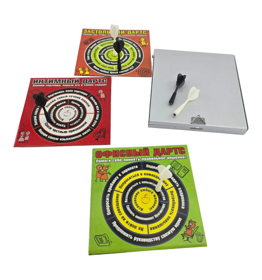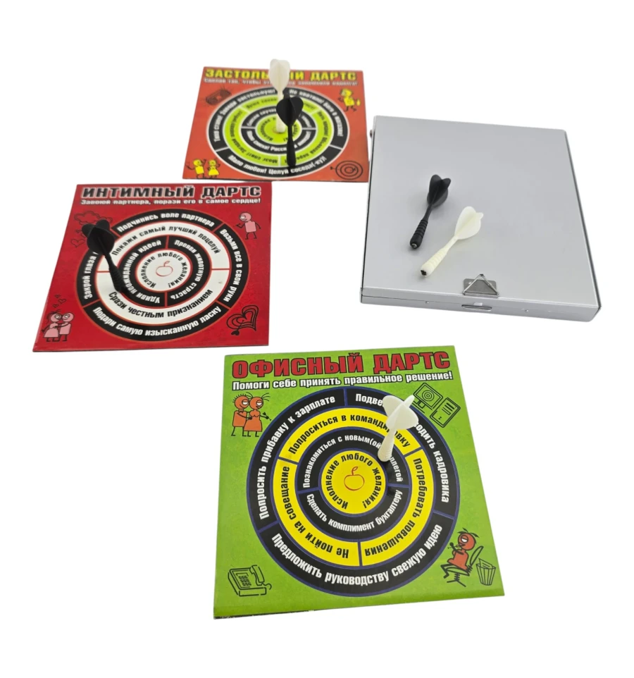 Компактный набор для неформальных игр в компании. В металлическом кейсе находятся три магнитные мишени 12 × 12 см и шесть дротиков. Дротики полностью пластиковые, в носике встроена небольшая металлическая вставка, благодаря которой они прилипают к мишеням. Мишени крепятся к любой металлической поверхности, удобно играть на холодильнике, сейфе или магнитной доске, а также использовать как настольную забаву. Тематики мишеней шуточные: «офисный», «застольный», «интимный».