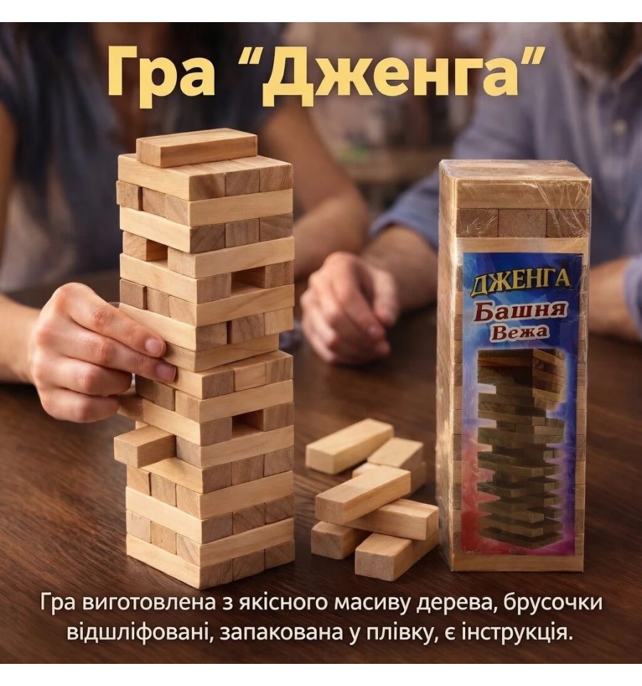 Дженга сделана из массива дерева.Дженга – это башня из деревянных брусков, которая растёт вверх, падает и снова растёт! Дженга – игра на ловкость рук, смекалку и чувство равновесия. В настольной игре Дженга (Jenga) Вам предстоит выстраивать башню из деревянных брусков, вынимая бруски с нижних «этажей» и докладывая их наверх.
