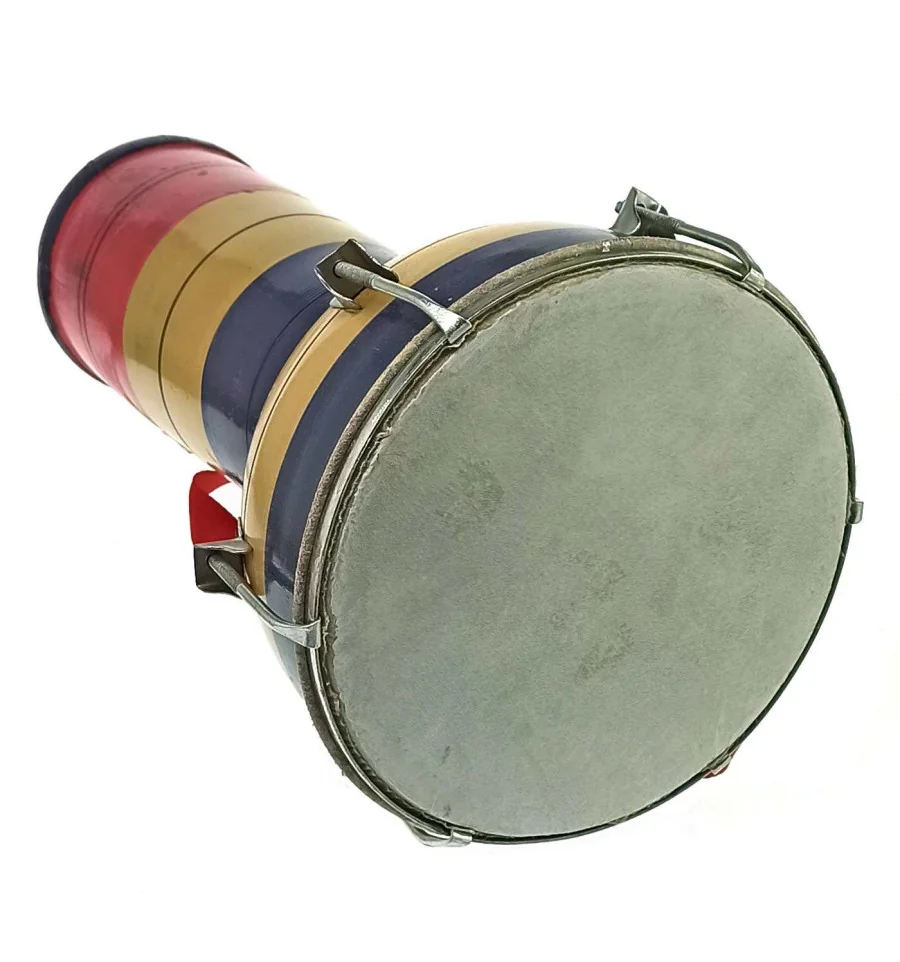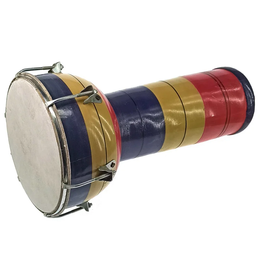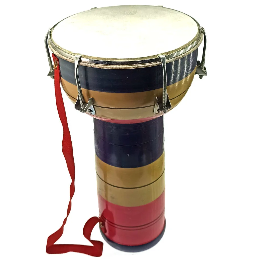 Барабан Джембе выполнен в форме кубка, с мембраной из кожи, открытым низом и широким верхом.