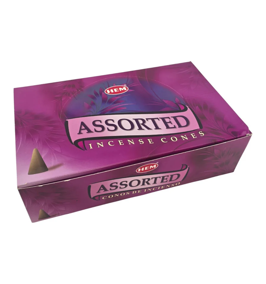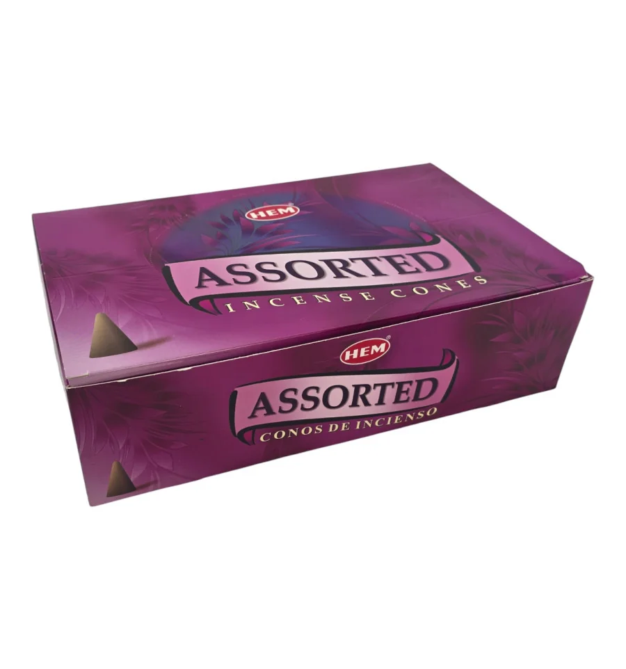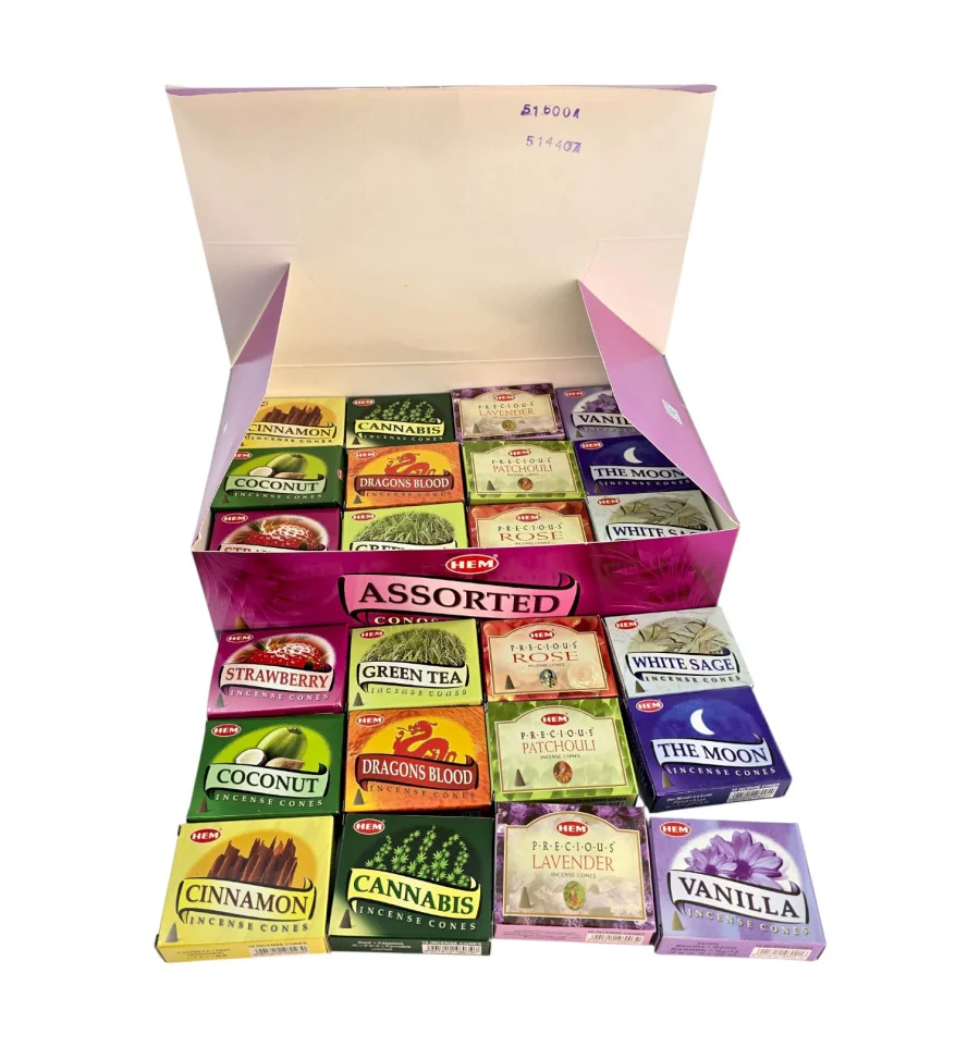 Большой набор аромаконусов HEM Assorted для дома, офиса и студии. В коробке 12 разных ароматов, каждого по 4 пачки. В каждой маленькой пачке 10 конусов и металлическая подставка. Конусы компактны, быстро наполняют комнату ароматом и тлеют ровно.