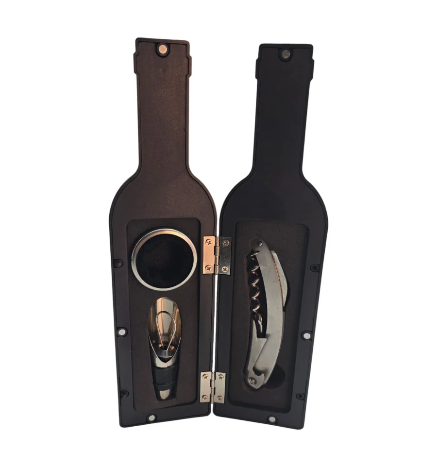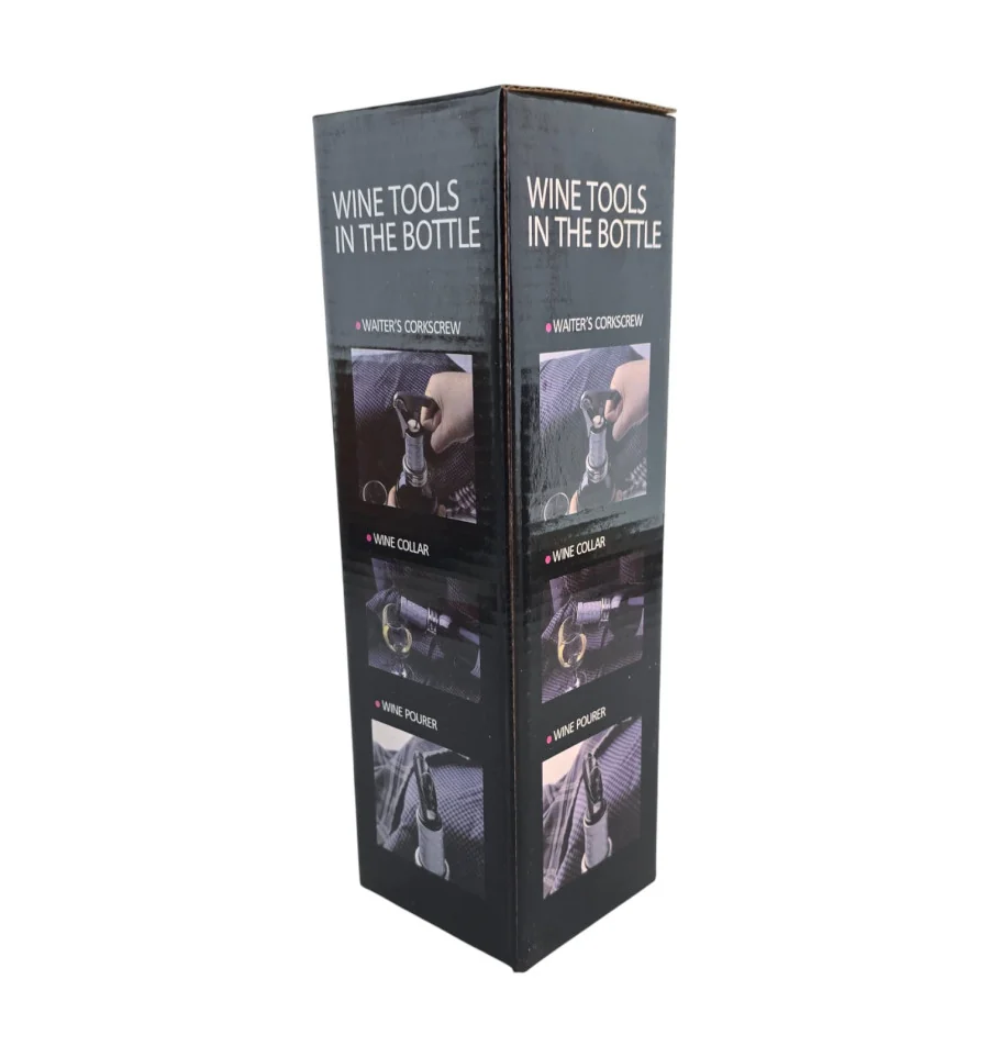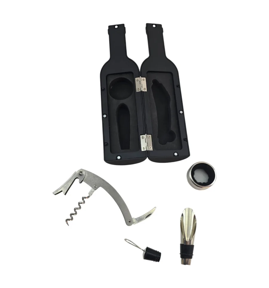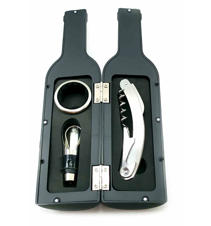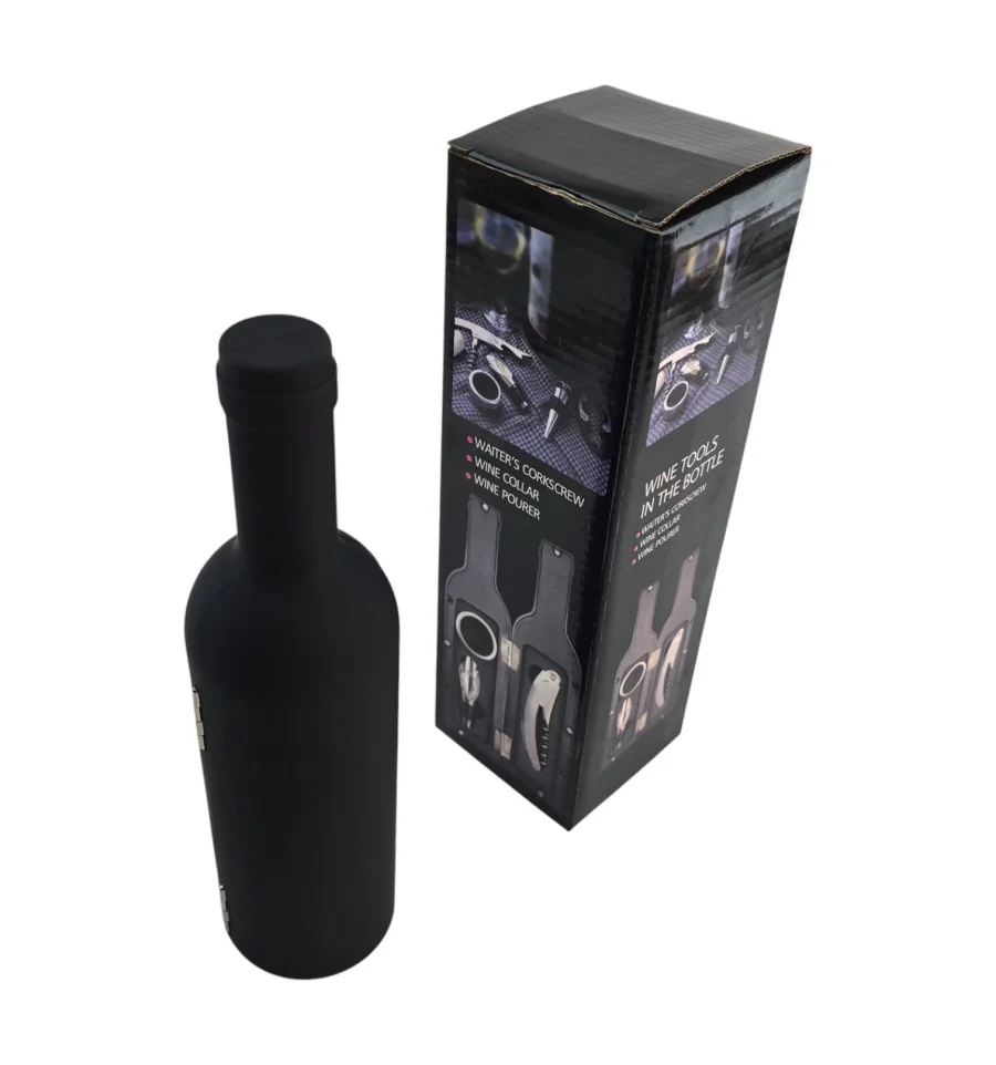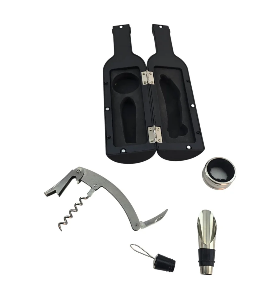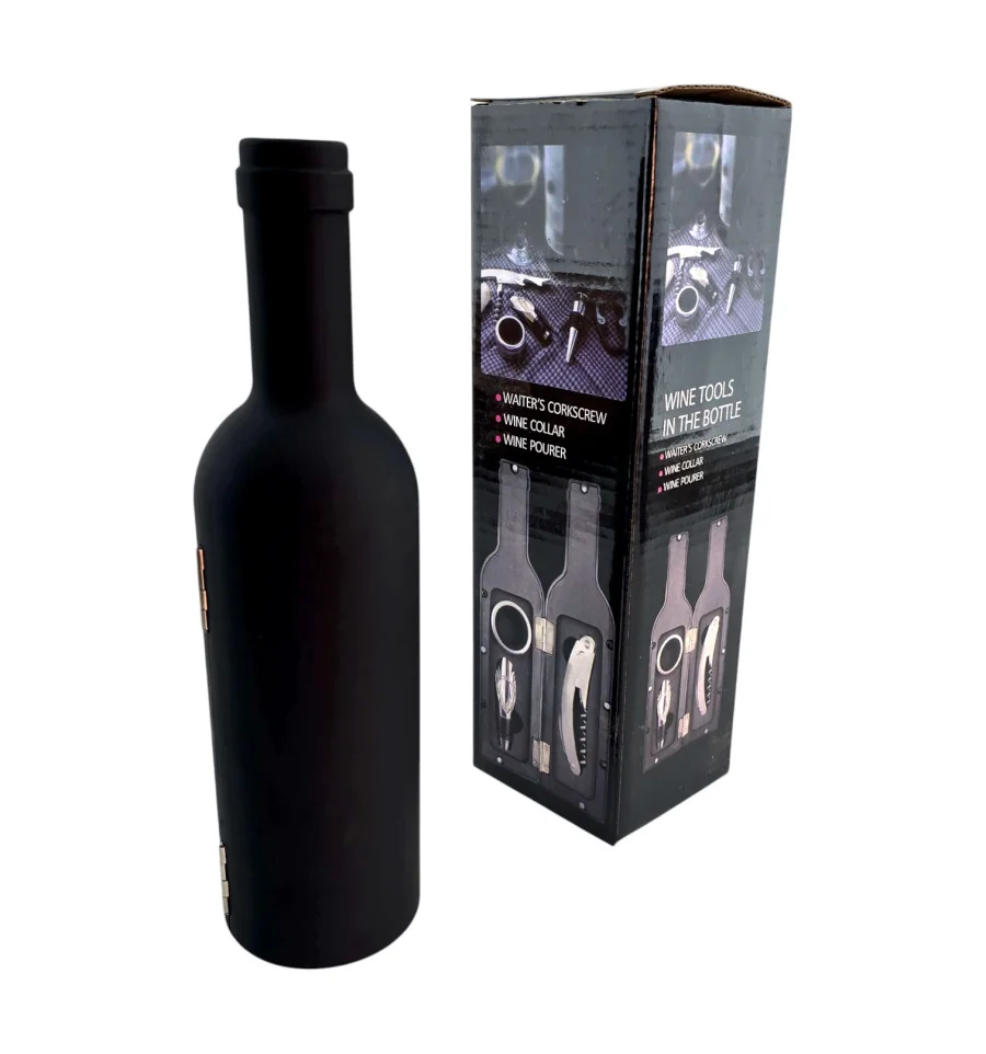 Комплектация: футляр-бутылка, штопор сомелье 3-в-1 (штопор, нож для капсулы, открывалка), носик-дозатор, антикапельное кольцо, пробка-стоппер
