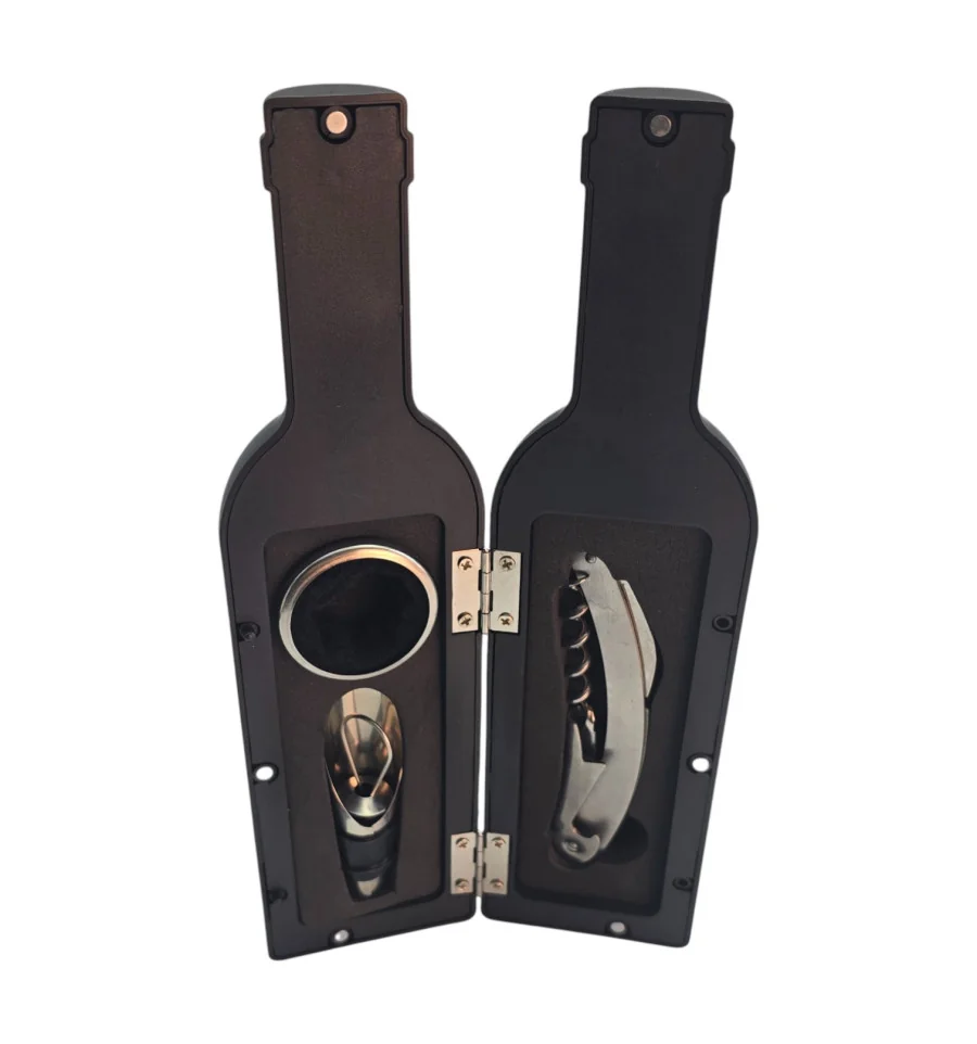 Практичный подарок для дома, бара или пикника. Все аксессуары хранятся в футляре в виде бутылки, его удобно ставить на полку рядом с вином. Внутри есть всё для открытия и подачи: штопор сомелье 3-в-1, носик-дозатор, антикапельное кольцо и пробка-стоппер. Металлические части выполнены из нержавеющей стали, уплотнения из эластомера, футляр пластиковый.
