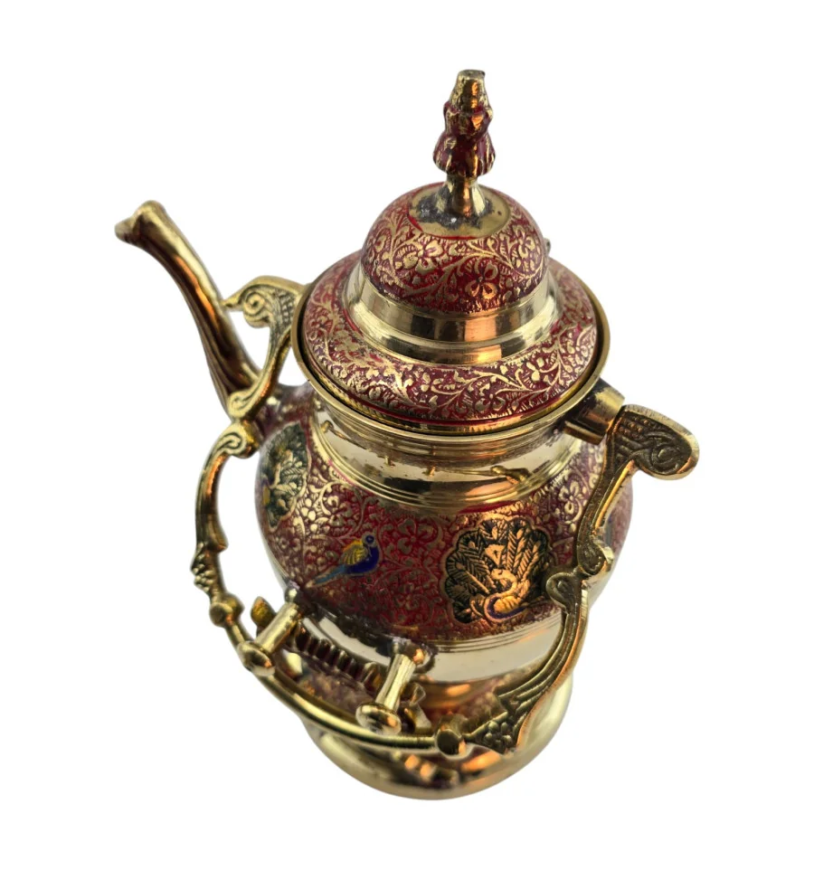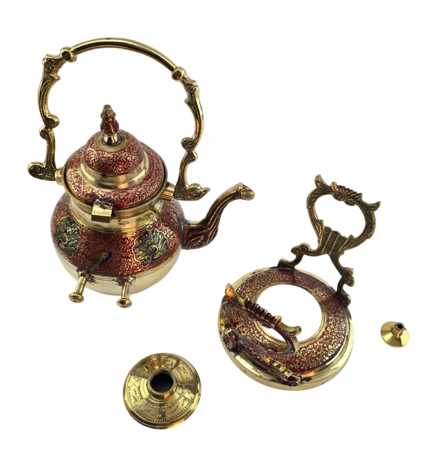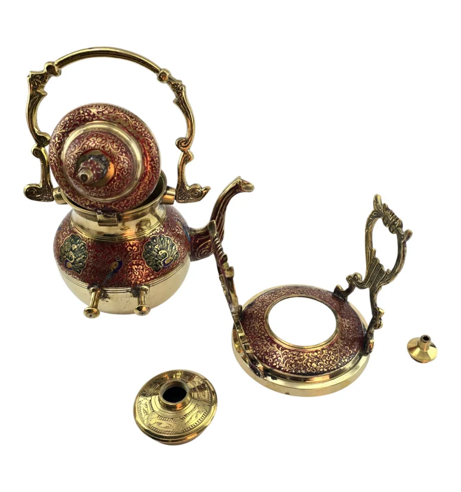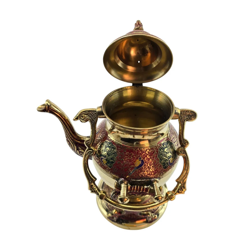 Латунный чайник-подогреватель из Индии с декоративной подставкой и горелкой для лампового масла или спирта. Корпус и подставка украшены красным орнаментом, по бокам – павлины и растительный узор в зелёных и синих оттенках. В комплект входят чайник с крышкой, подставка и отдельная разборная горелка, которая устанавливается внутрь подставки под чайник. Набор подходит для неспешного подогрева уже заваренного чая или напитка, а также служит выразительным восточным декором для дома.