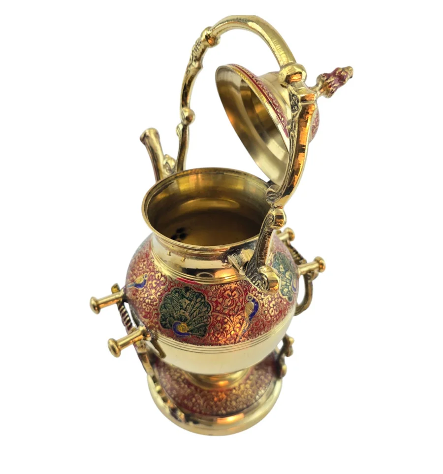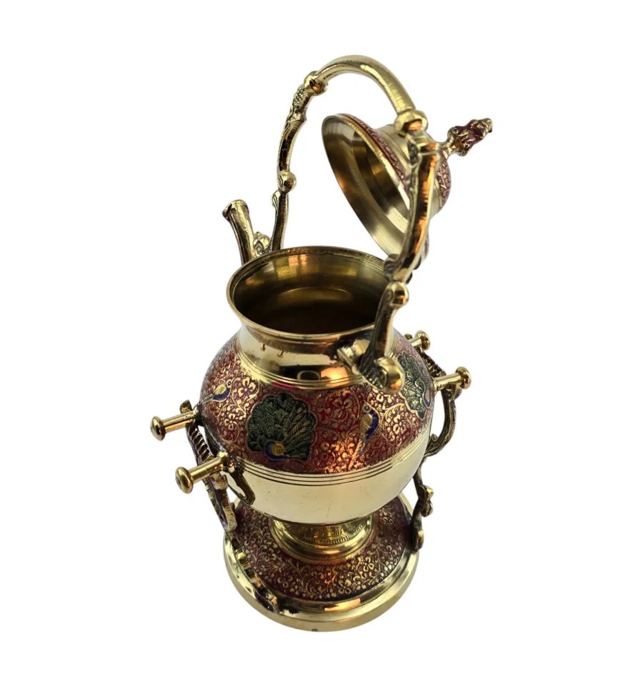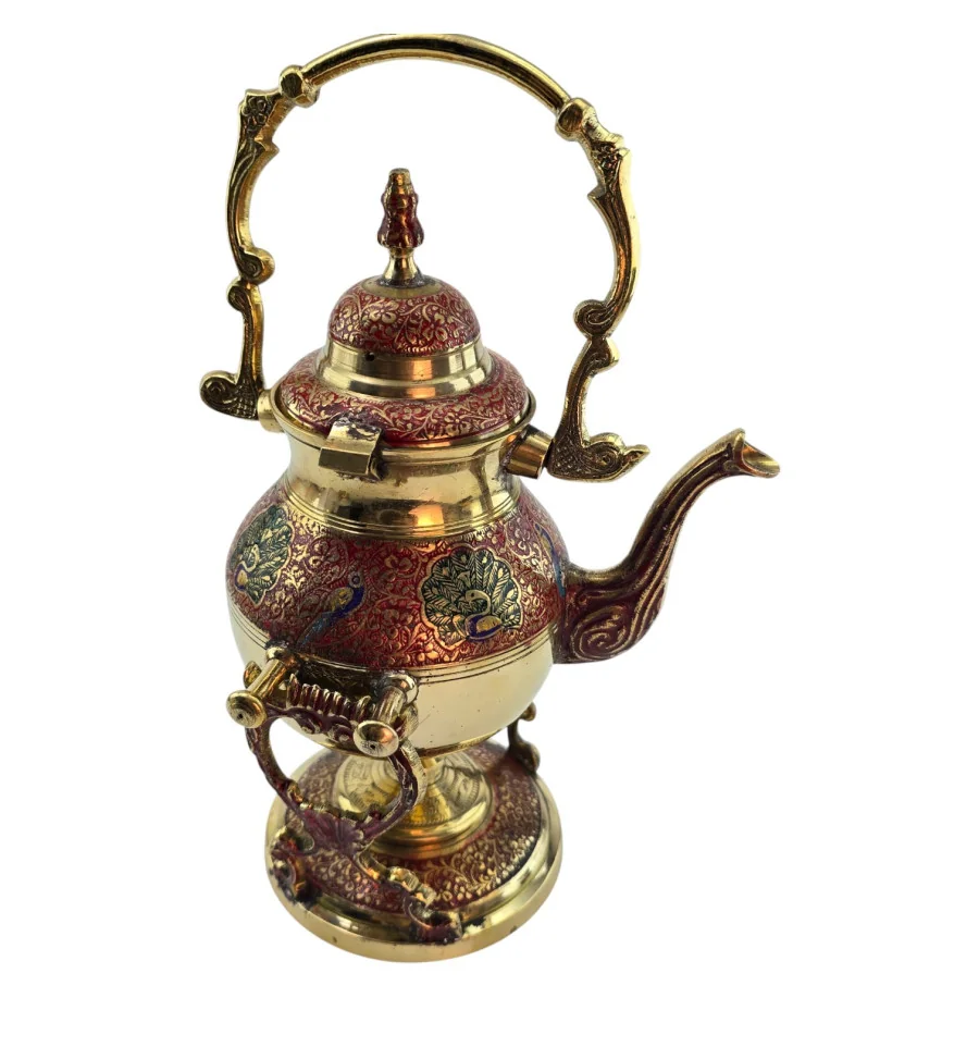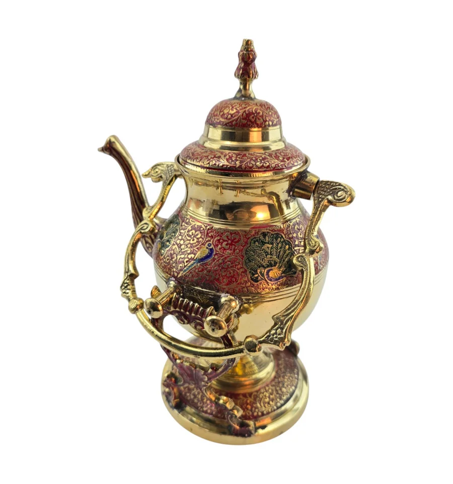 Латунный чайник-подогреватель из Индии с декоративной подставкой и горелкой для лампового масла или спирта. Корпус и подставка украшены красным орнаментом, по бокам – павлины и растительный узор в зелёных и синих оттенках. В комплект входят чайник с крышкой, подставка и отдельная разборная горелка, которая устанавливается внутрь подставки под чайник. Набор подходит для неспешного подогрева уже заваренного чая или напитка, а также служит выразительным восточным декором для дома.