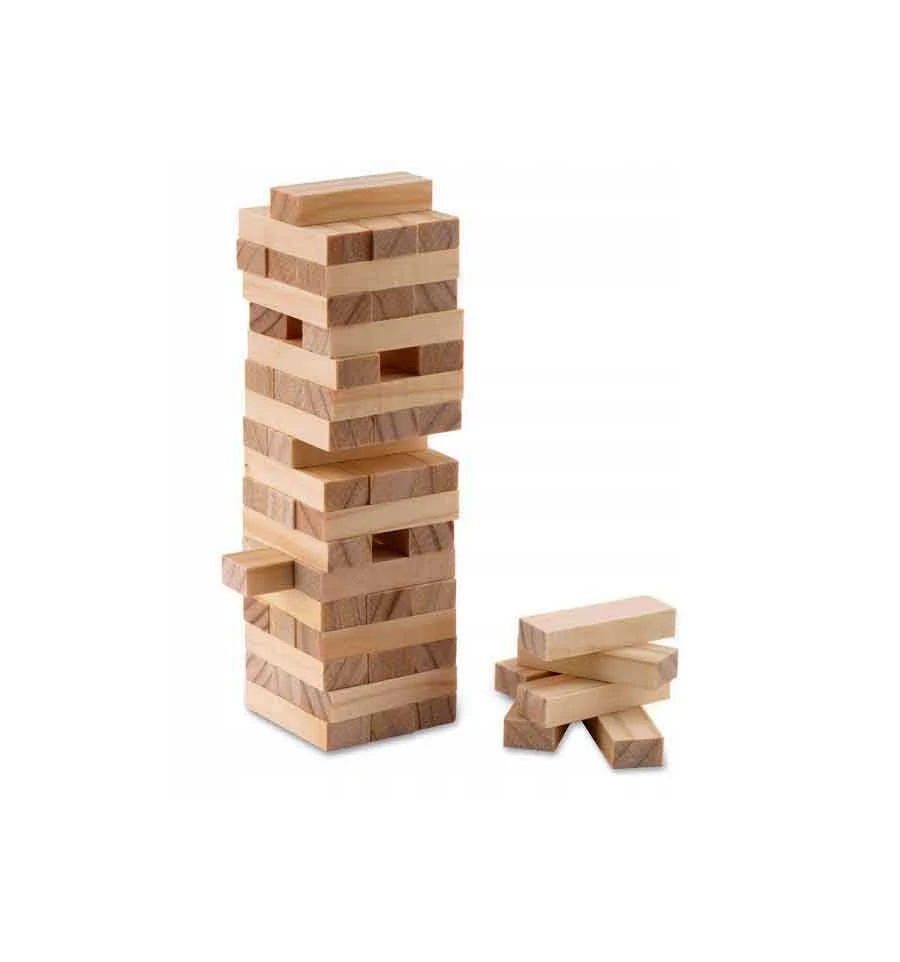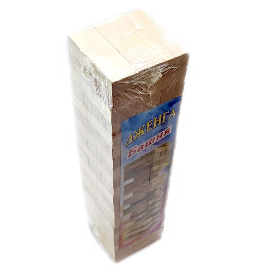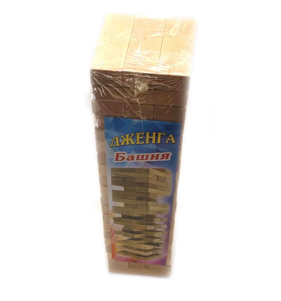 Дженга сделана из массива дерева.Дженга – это башня из деревянных брусков, которая растёт вверх, падает и снова растёт! Дженга – игра на ловкость рук, смекалку и чувство равновесия. В настольной игре Дженга (Jenga) Вам предстоит выстраивать башню из деревянных брусков, вынимая бруски с нижних «этажей» и докладывая их наверх. Возраст от 14+.