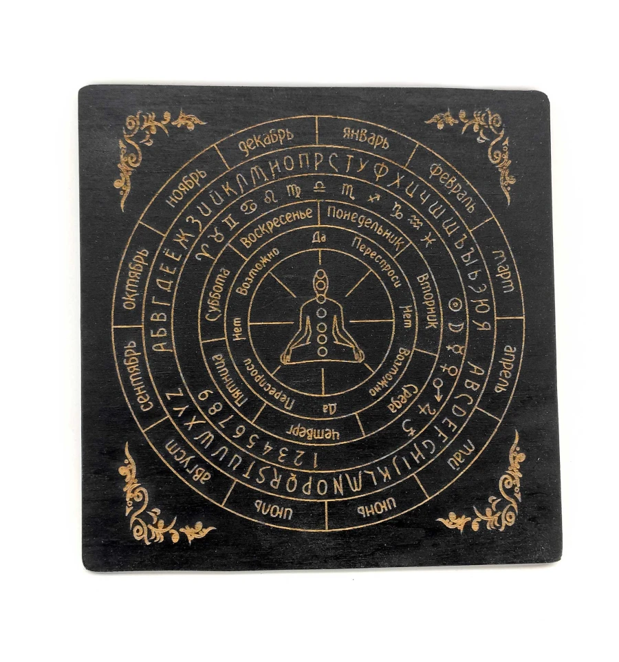 Классическая таблица для работы с маятником - это мощный инструмент для проведения диагностики и лечения с помощью маятника. Эта таблица изготовлена из качественного дерева и имеет размер 18х18х0,4 см. Она темная и покрыта эмалью, что делает ее долговечной и привлекательной. На поверхности таблицы нанесены гравировки с символами и рунами, которые используются для проведения магических ритуалов и воздействий.