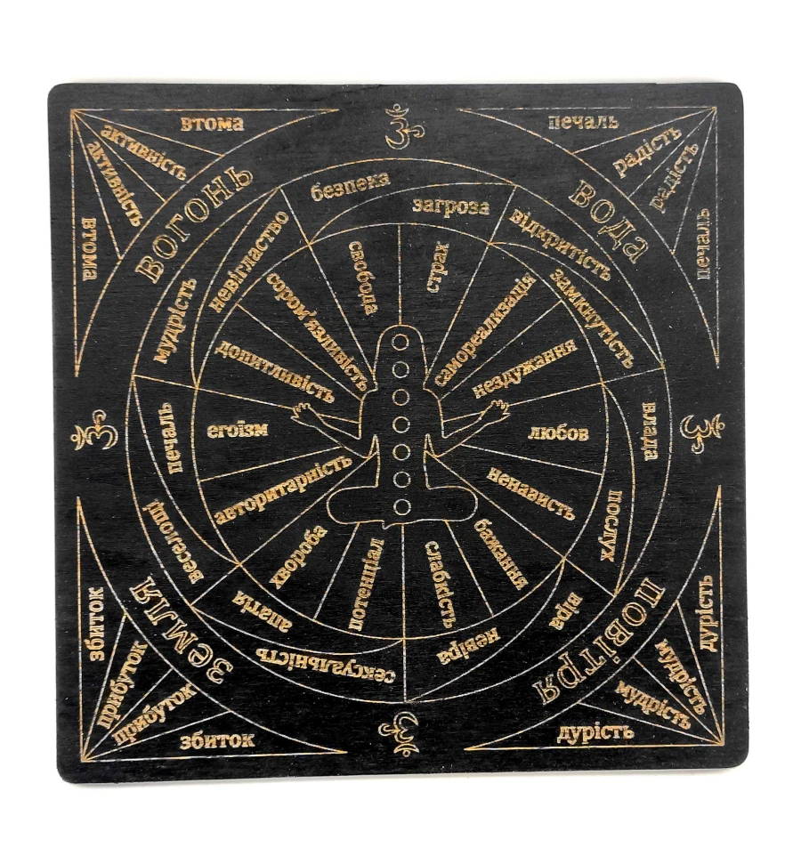 Чакровая таблица - это прекрасный инструмент для работы с чакрами и энергетическими центрами в теле человека. Эта таблица выполнена в темном цвете и имеет размеры 18х18х0,4 см, покрыта эмалью и украшена гравировкой.