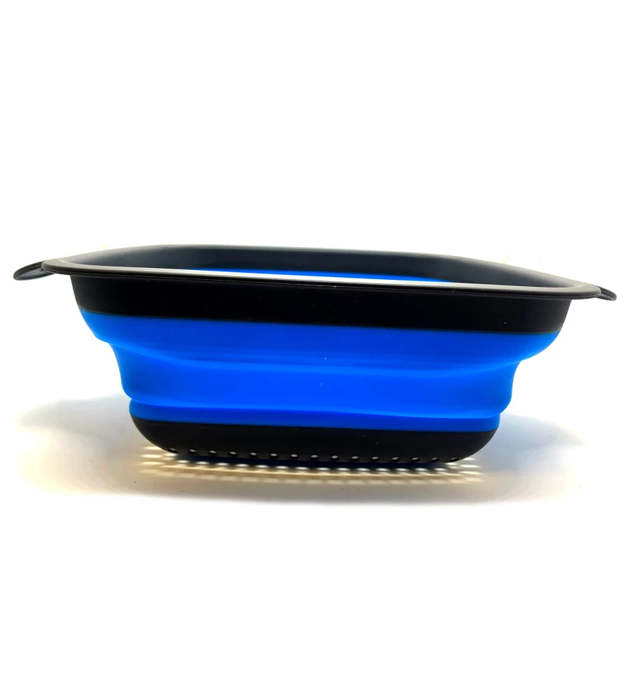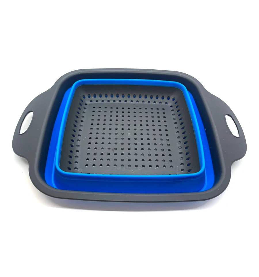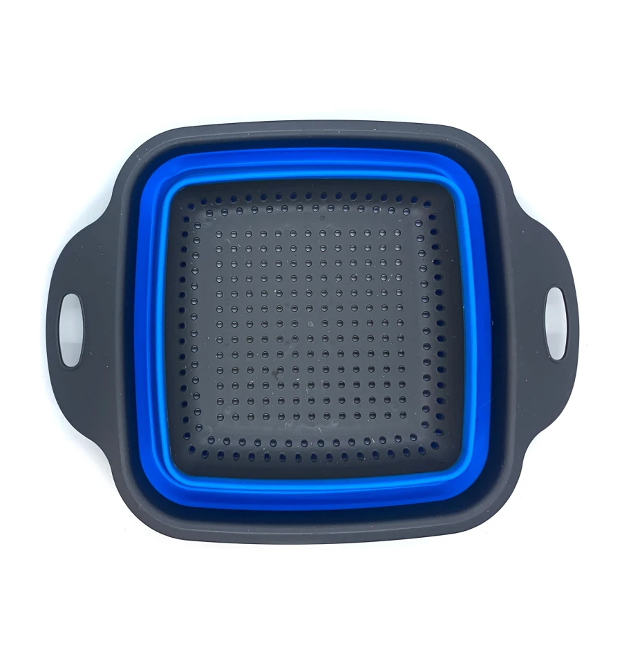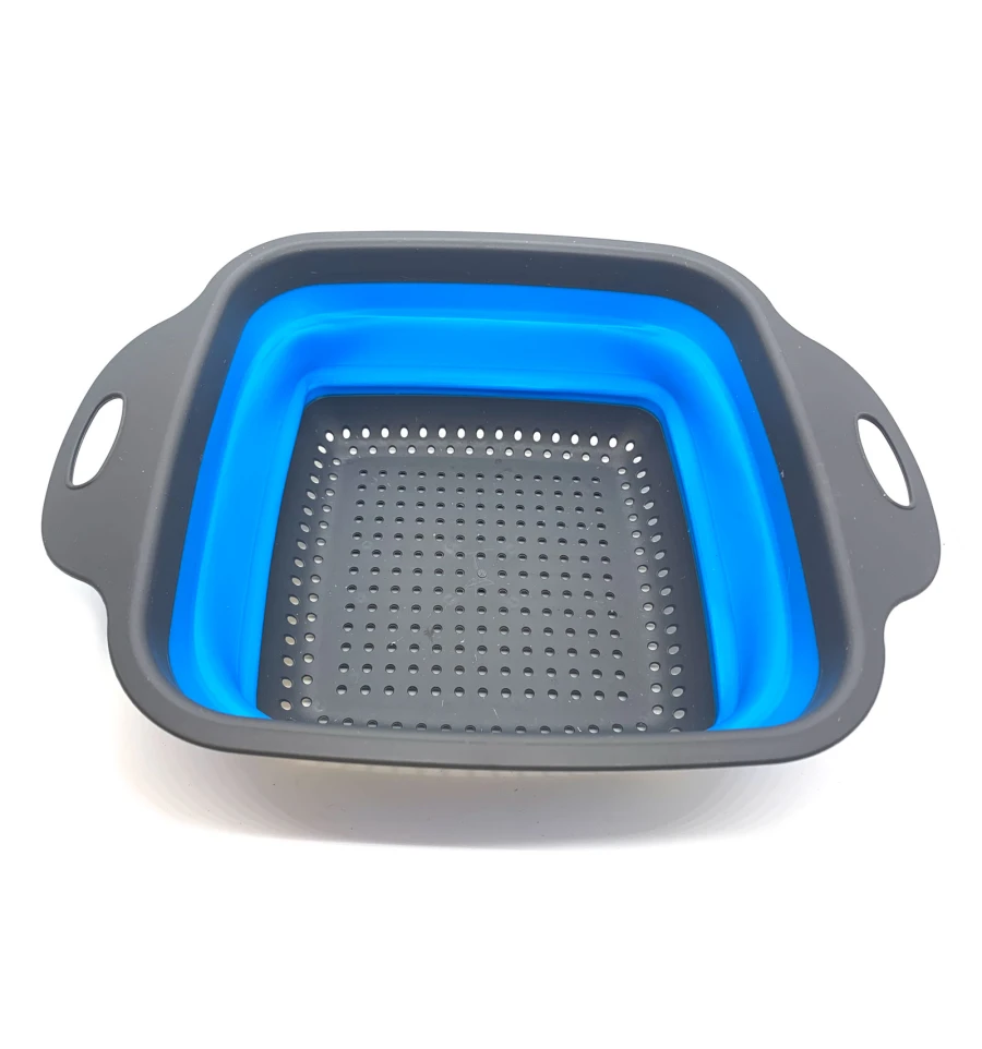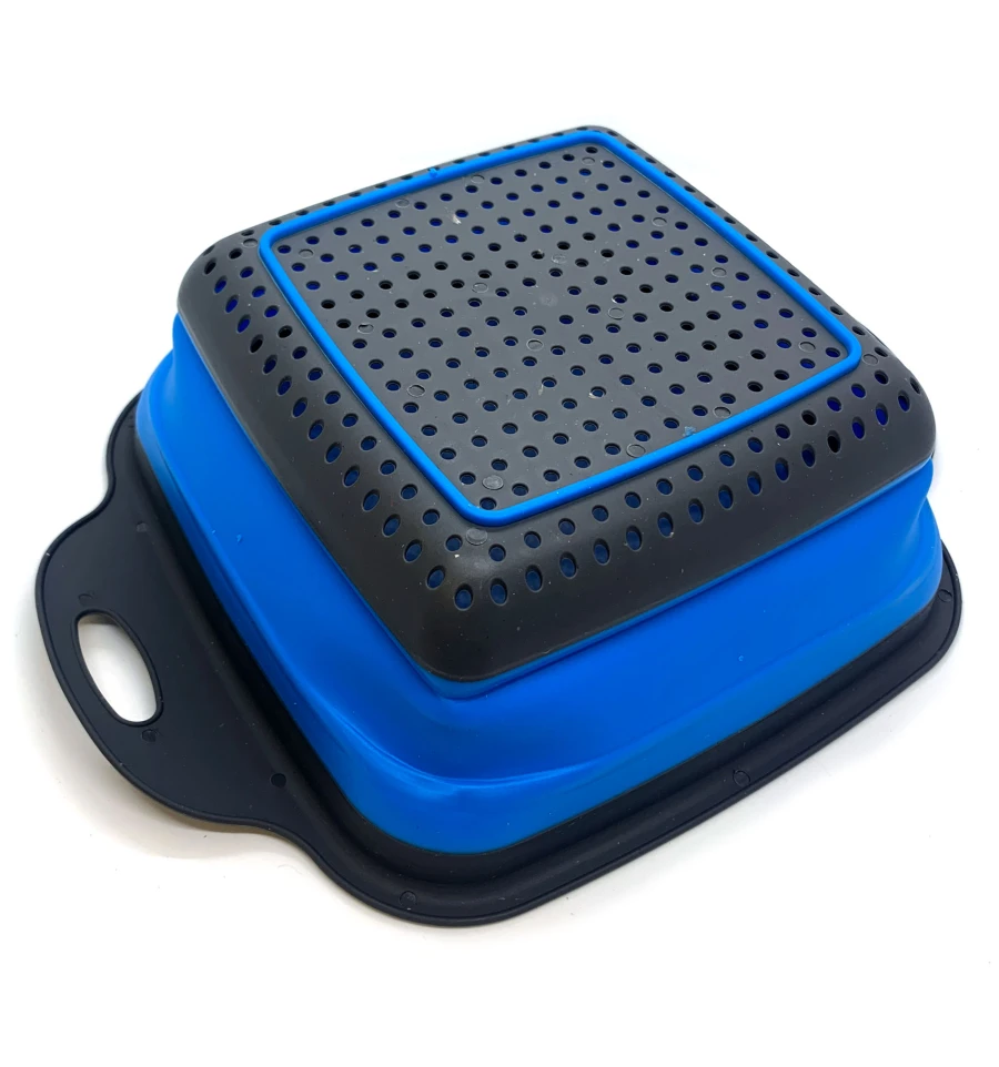 Силиконовый складной друшлаг квадратной формы! Друшлаг имеет стильный серый цвет с синими акцентами, добавляющими нотку яркости на вашей кухне.