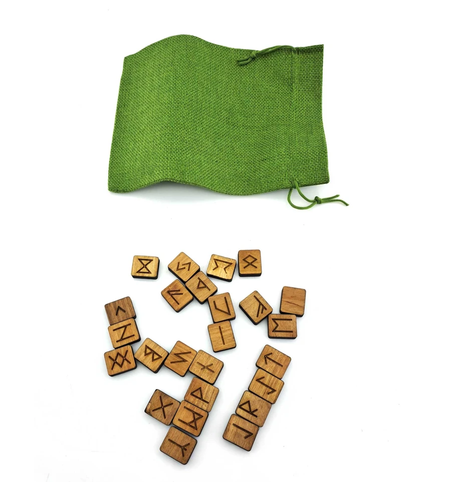 Руны из ольхи в мешочке. Подарочный мешочек из мешковины на затяжках, цвет зелёный, 15×20см. Размер руны -31*27*7 мм. В наборе 25 рун и описание: значение рун и техника гадания. Руны из ольхи покрыты льняным маслом и пчелиным воском. Руны – древняя скандинавская и славянская письменность. Каждая буква в скандинавском руническом алфавите имела свое название и значение. Сами скандинавы считали, что руны обладают мощной энергетикой и большой силой, поэтому использовали их для гадания и защиты.