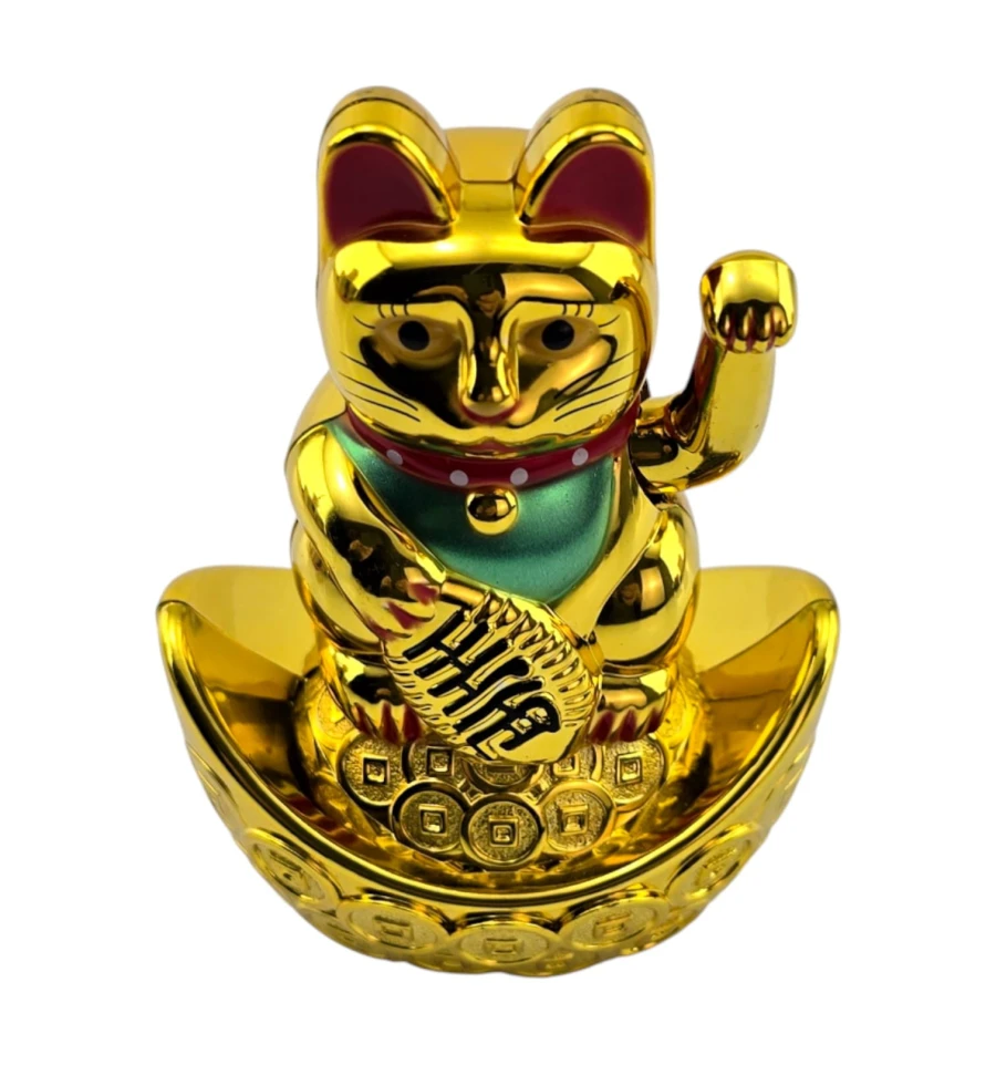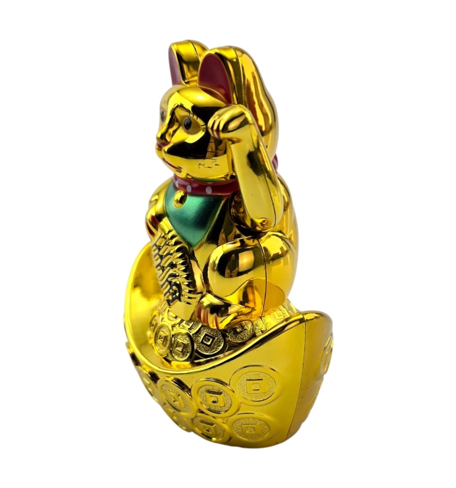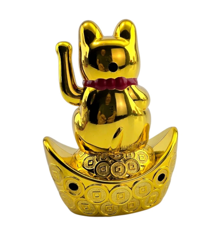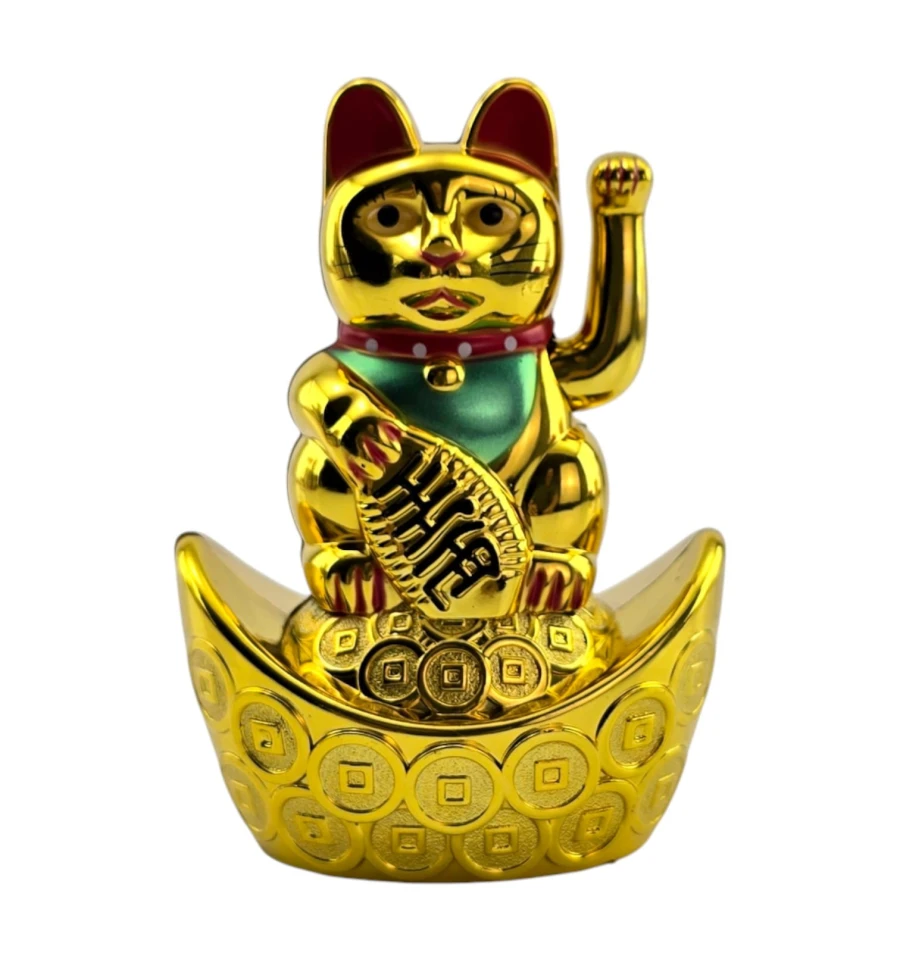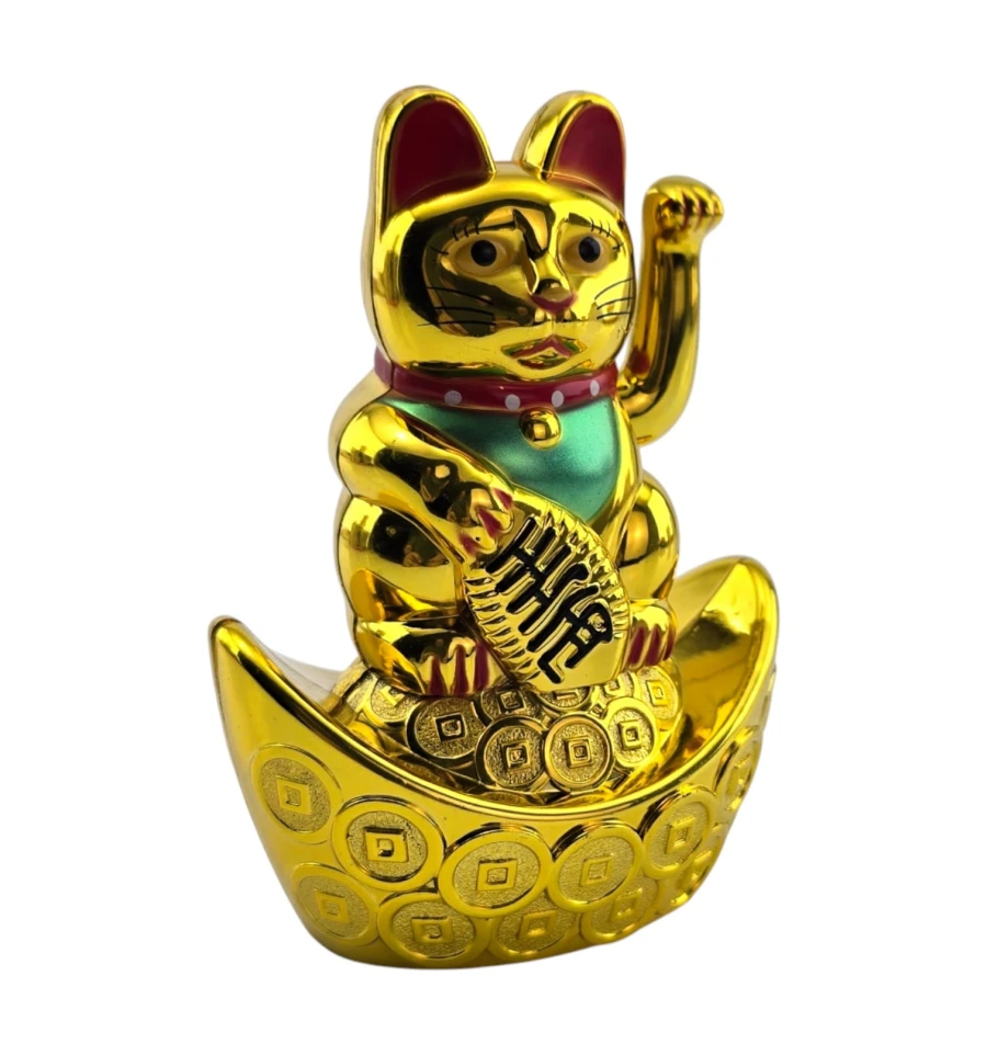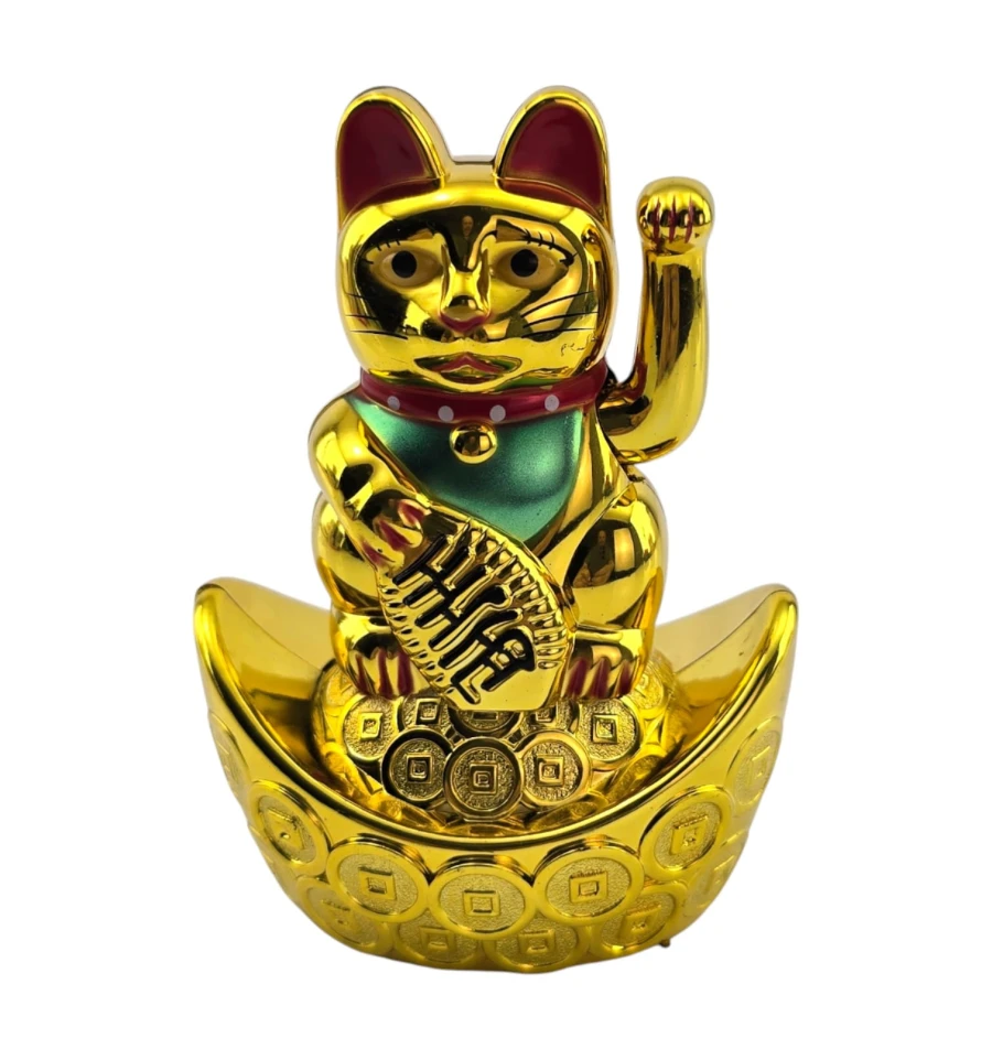 Классический японский талисман Манэки-нэко - «кошечка, зовущая удачу и деньги». Фигурка стоит на «золотой лодочке» с монетами, в лапе держит овальную монету-кобан с иероглифами достатка. Поднятая правая лапка ритмично машет, привлекая клиентов и финансовый успех. Ставят у входа, на кассе или ресепшене магазина, в кафе и салонах, в кабинете и дома на полке или рабочем столе. Работает от одной батарейки AAA (в комплект не входит).
