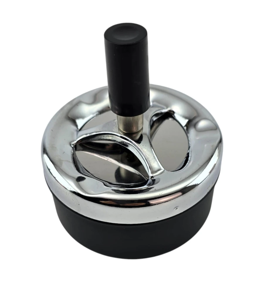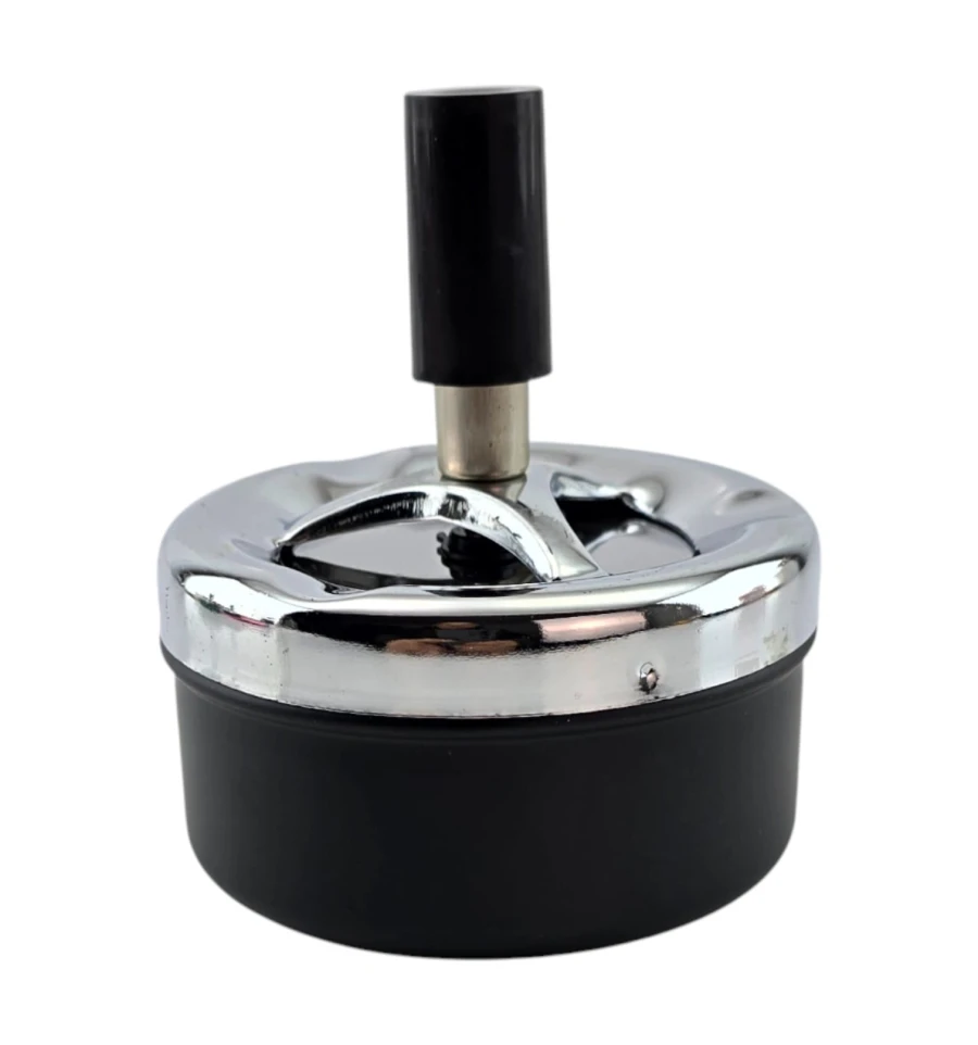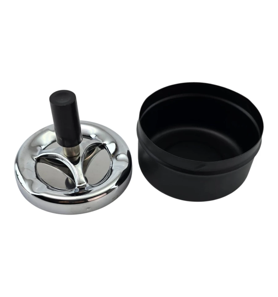 Настольная металлическая пепельница с крышкой и удобной ручкой. Крышка прикрывает пепел и снижает запах, а вырез сверху служит упором для сигареты. Компактный размер подходит для дома, офиса, террасы. Легко разбирается для очистки.