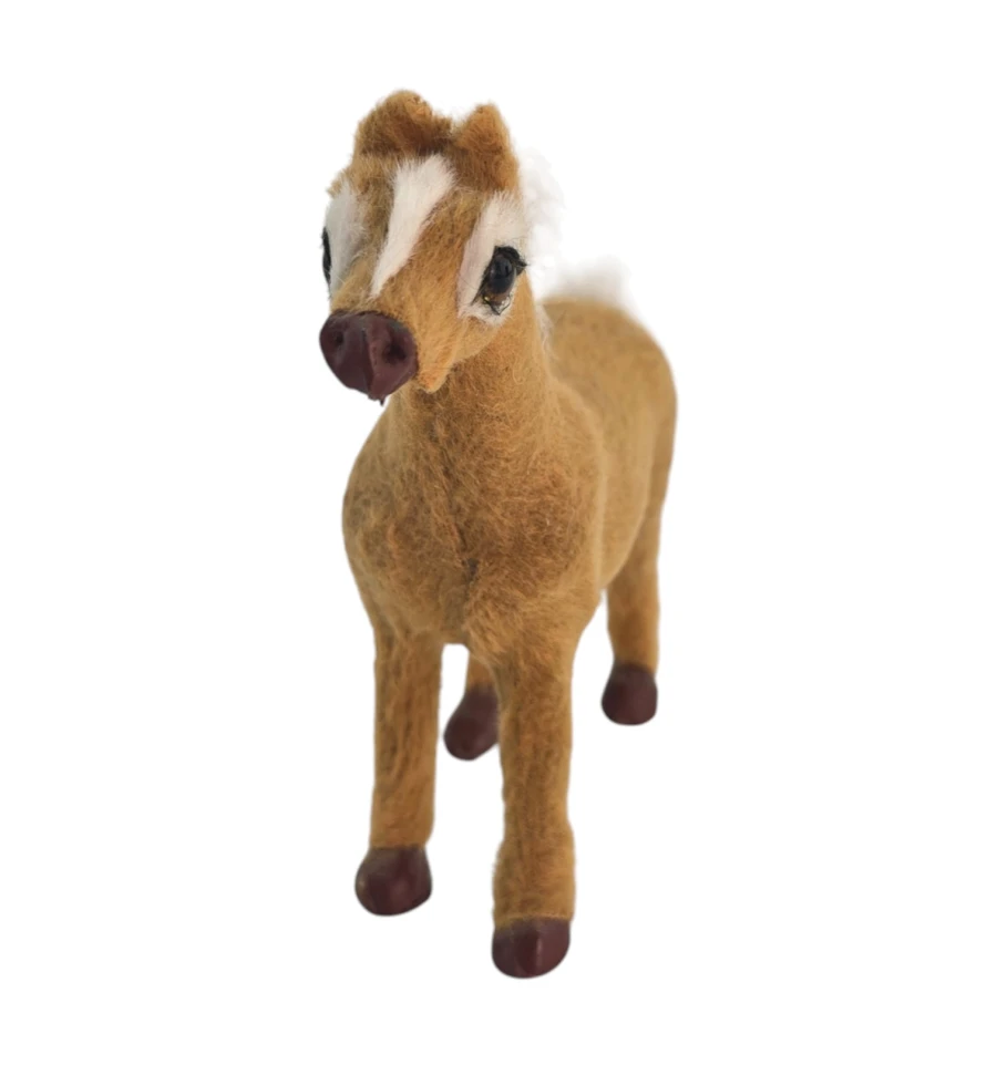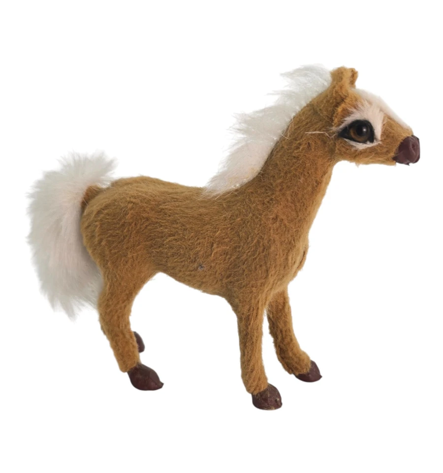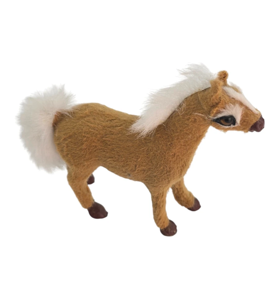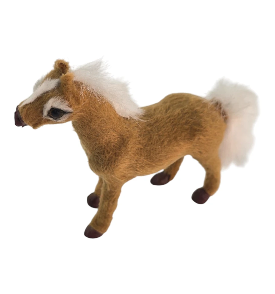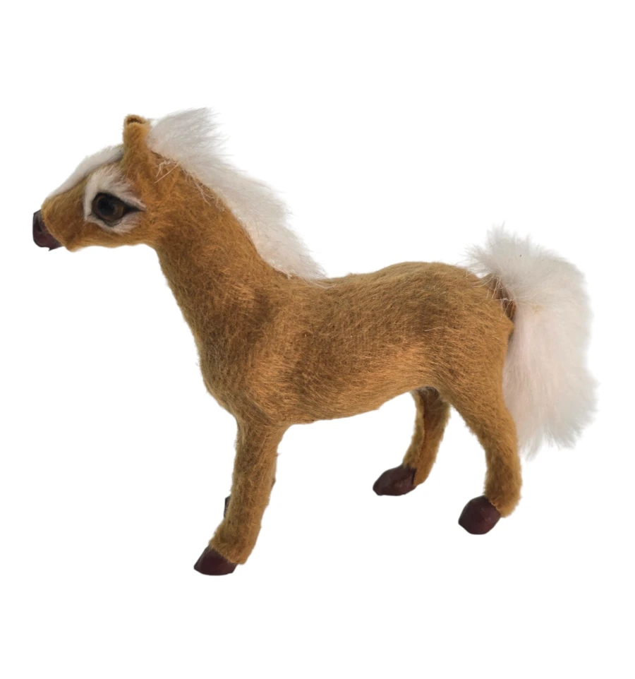 Небольшая декоративная фигурка лошади с натуральным мехом. Светло-коричневый окрас и белая грива выглядят натурально, поэтому модель органично смотрится на полке, рабочем столе или в детской. Лошадь выбирают как символ силы, успеха и движения вперёд, а также как тематический подарок к Году Лошади. Изделие выполнено вручную индийскими мастерами, поэтому возможны лёгкие отличия от фото — у каждой фигурки свой характер. Уход простой: периодически снимайте пыль мягкой кисточкой.