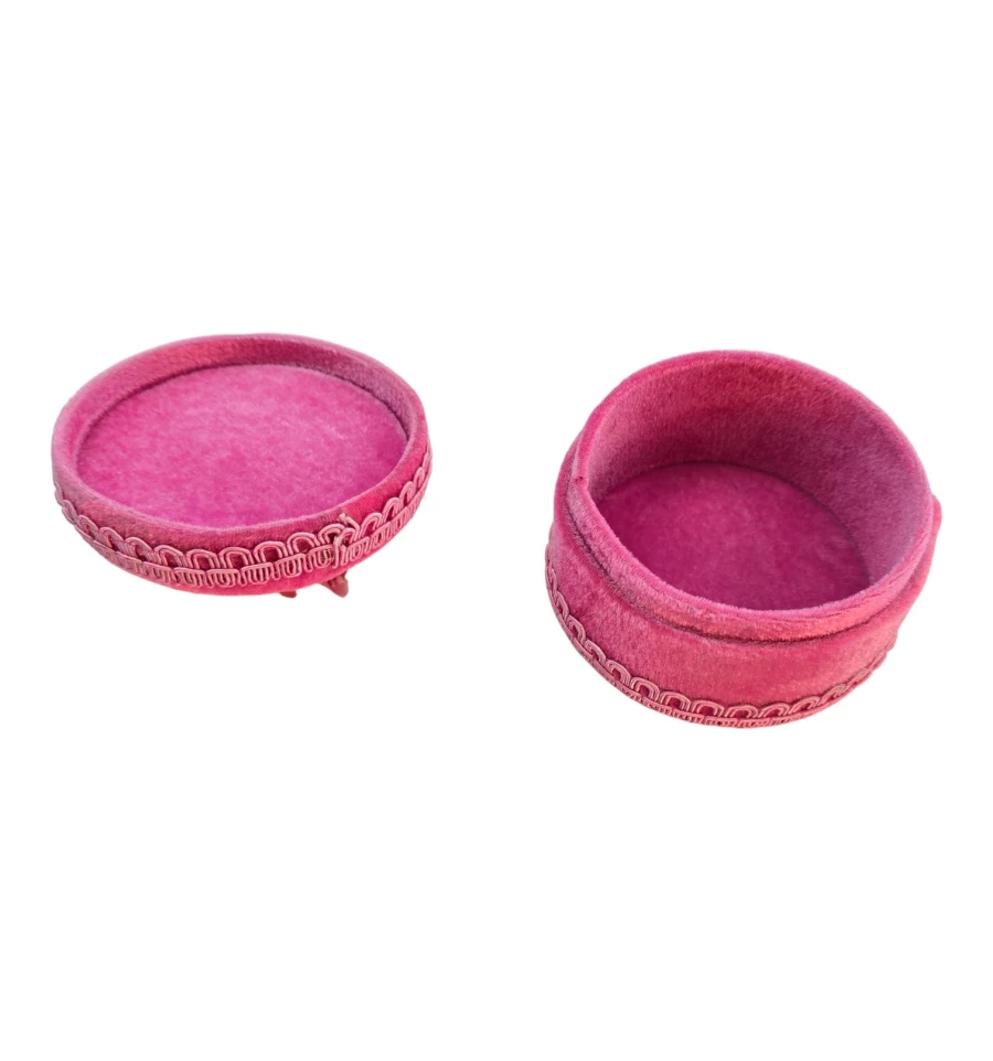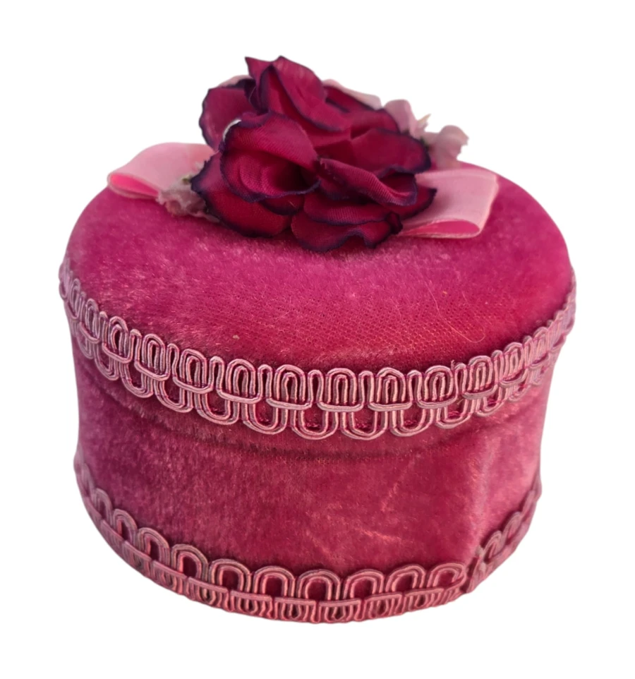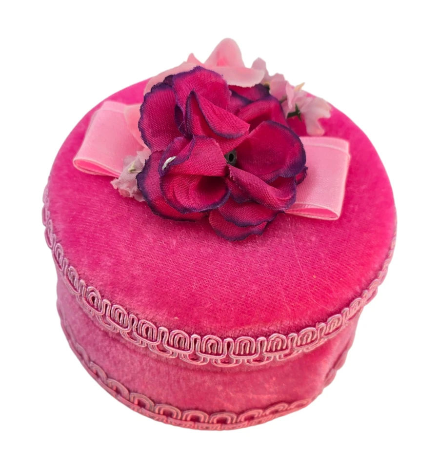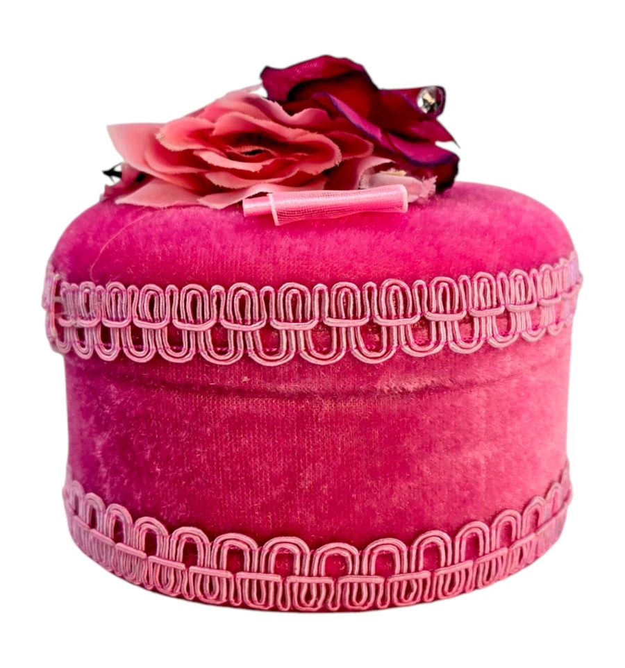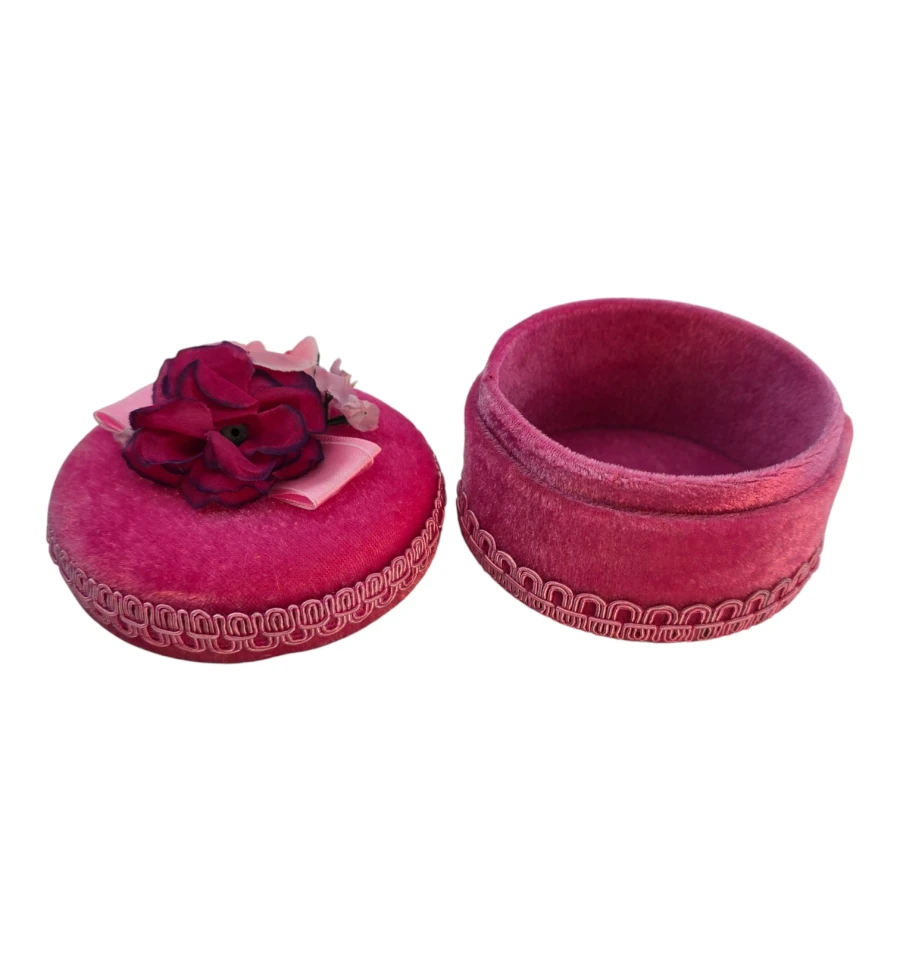 Небольшая круглая шкатулка розового цвета, обтянутая мягкой бархатной тканью. Крышка украшена текстильными цветами в розово-малиновых оттенках и аккуратным бантом, поэтому шкатулка выглядит как миниатюрная подарочная коробочка и хорошо вписывается в интерьер спальни или будуара.