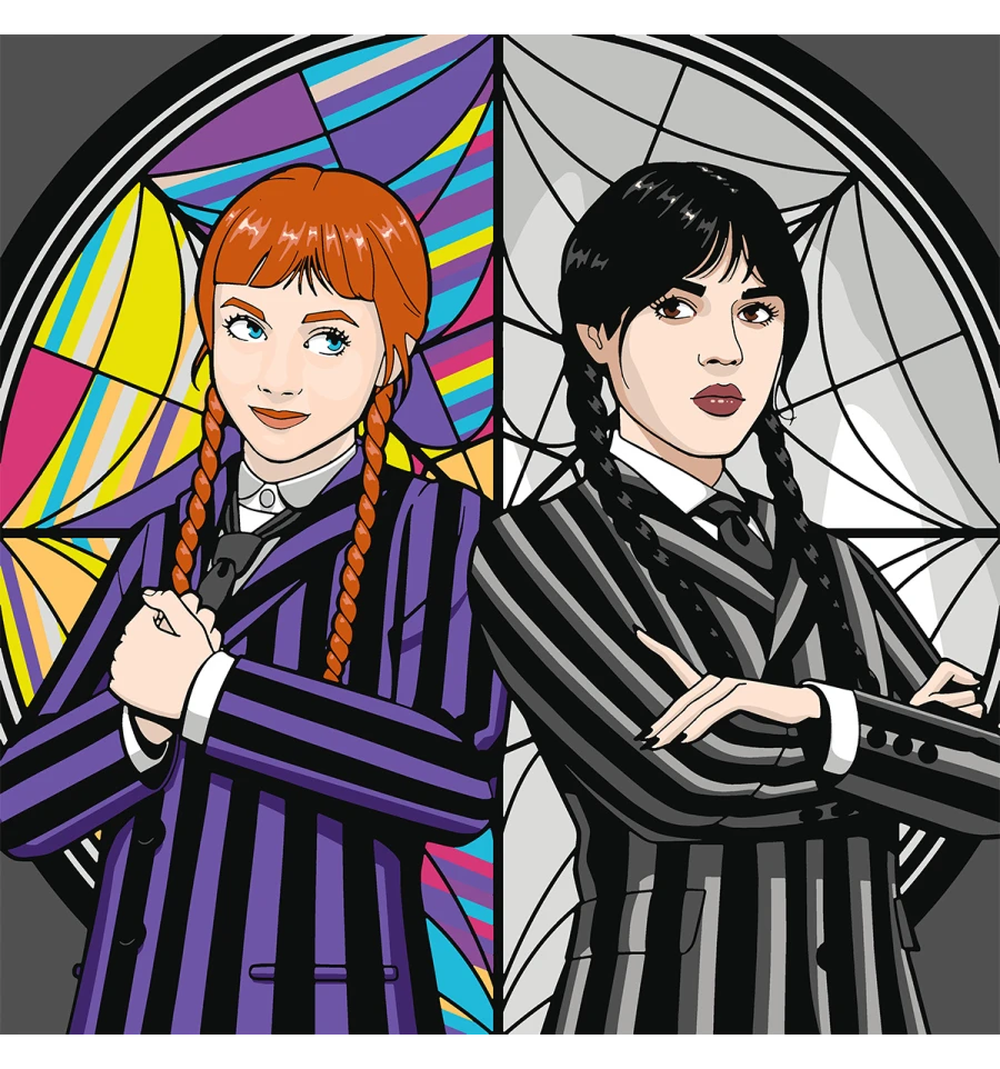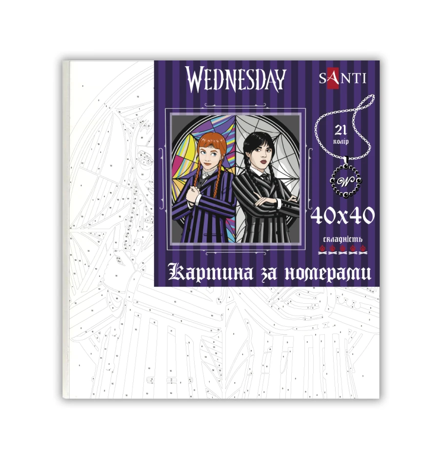 В каждой картине по номерам ТМ SANTI представлены интересные и знакомые персонажи сериала Уэнсдей, которые превращают рисование в настоящее приключение. В этой серии — Wednesday и Divina, героини второй части сериала, чья необычная дружба и яркие образы вдохновляют детей на творчество и самовыражение. Ребёнок не только получит удовольствие от творческого процесса, но и сможет с гордостью украсить свою комнату собственным шедевром с любимыми персонажами!