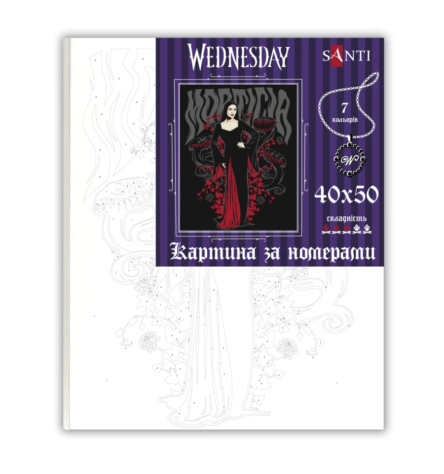 Картина по номерам ТМ SANTI Уэнсдэй. Мортиша Аддамс — это возможность подарить вашему ребенку радость творчества вместе с любимыми персонажами!